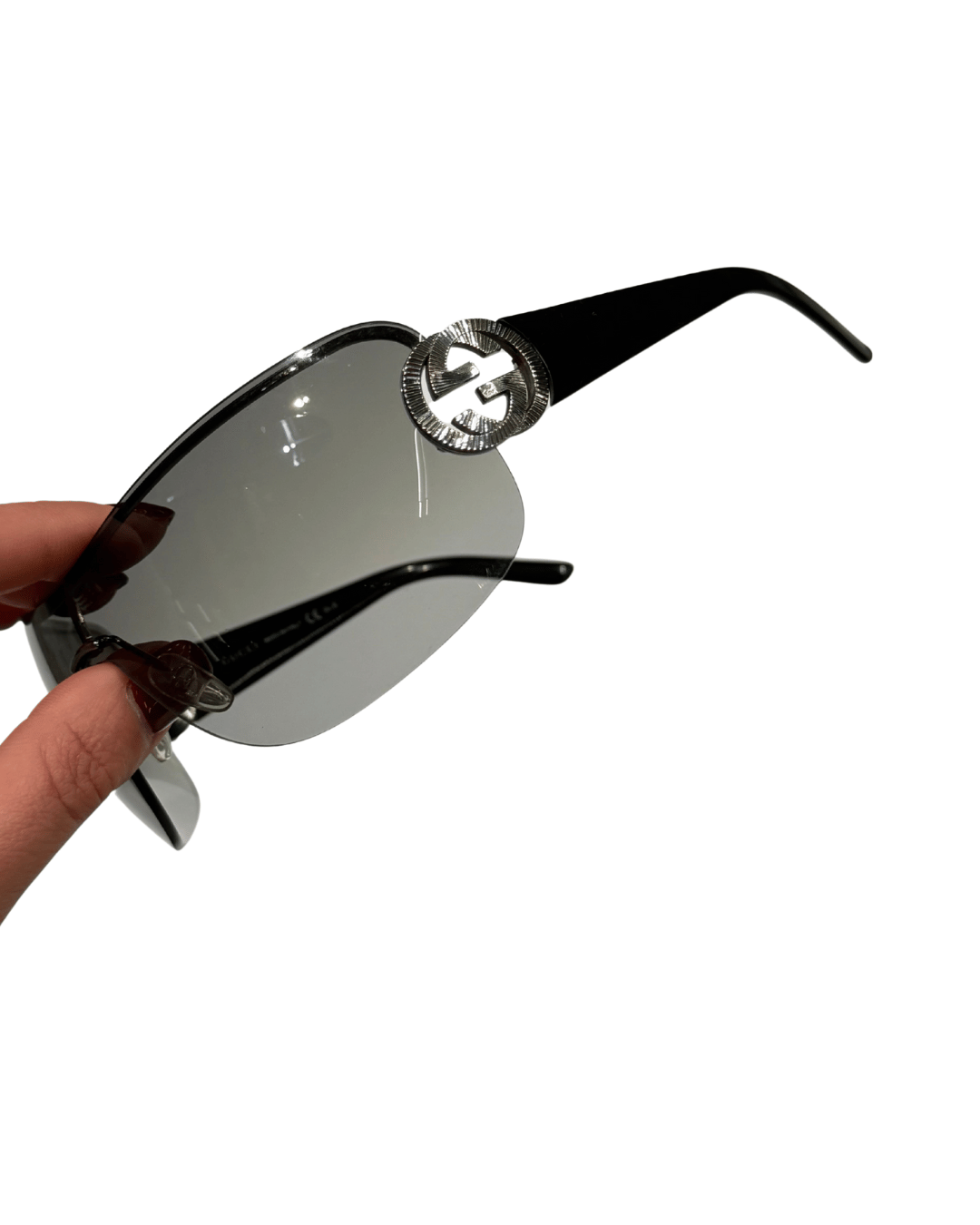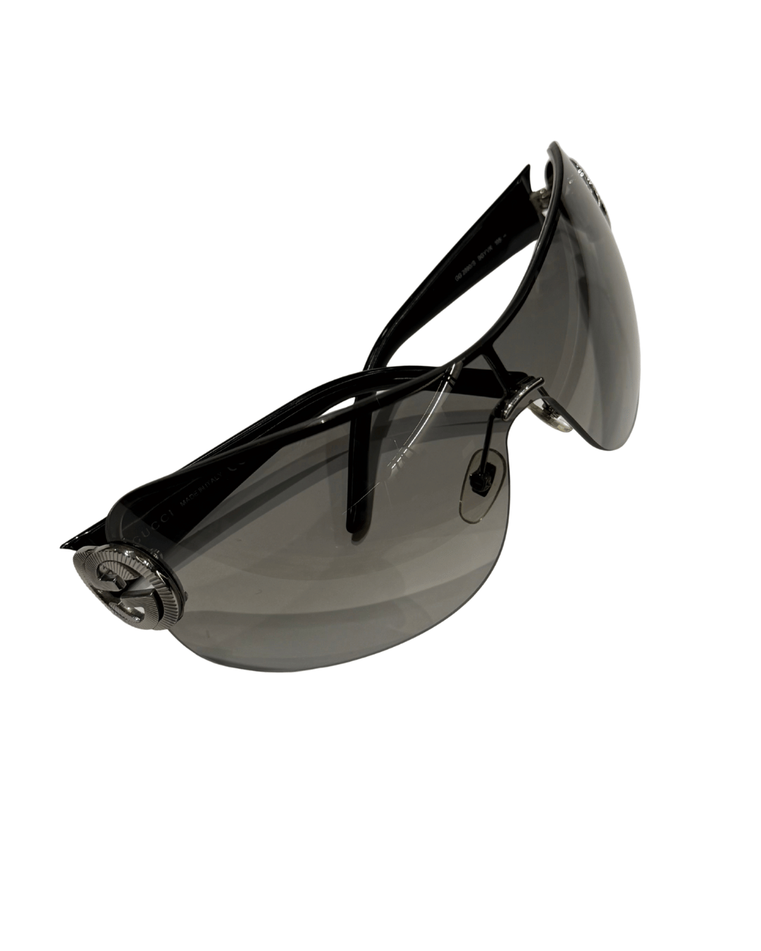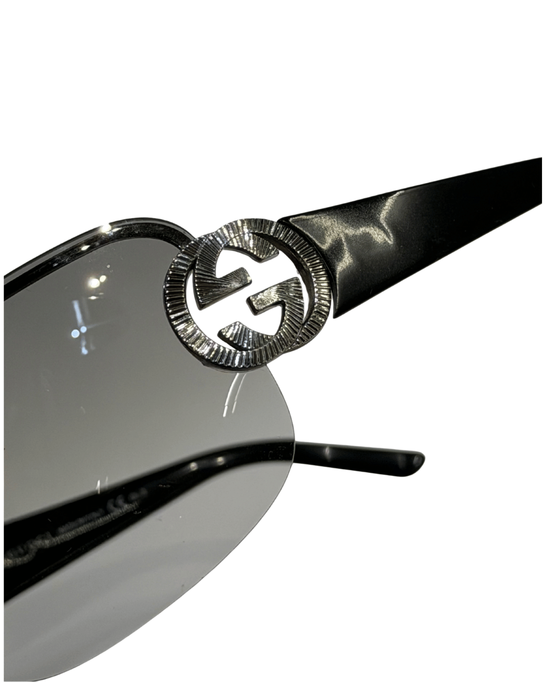 Decisi, moderni e con un carattere fortissimo. Gli occhiali da sole Gucci modello GG2890/S reinterpretano il concept “visor” in chiave luxury: una lente unica avvolgente in sfumatura grigio-fumé e aste importanti in resina nera. L’iconico dettaglio GG metallico argentato, posizionato lateralmente, diventa il protagonista del design, aggiungendo un tocco glam e immediatamente riconoscibile. Perfetti per chi ama gli accessori scenografici e di grande impatto.