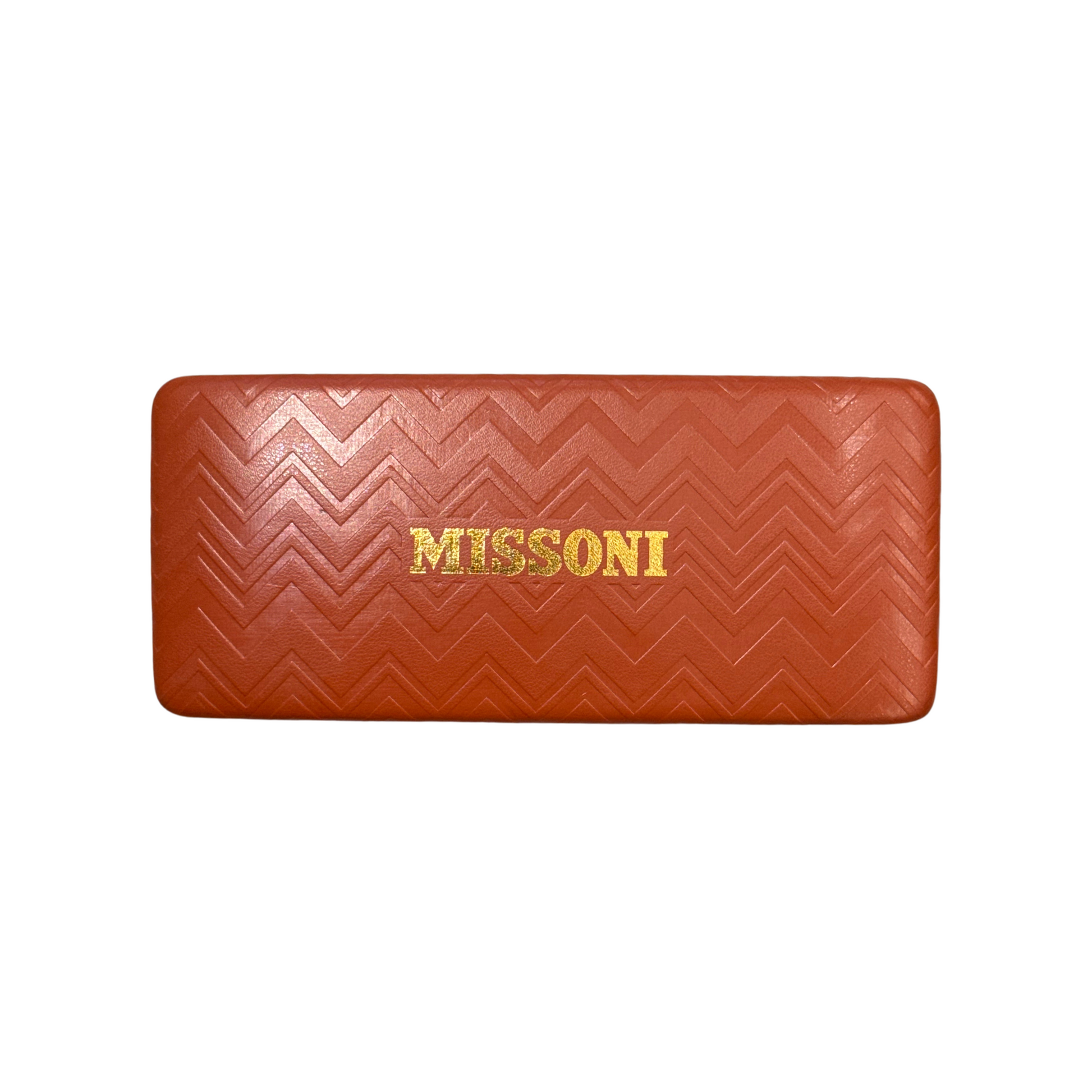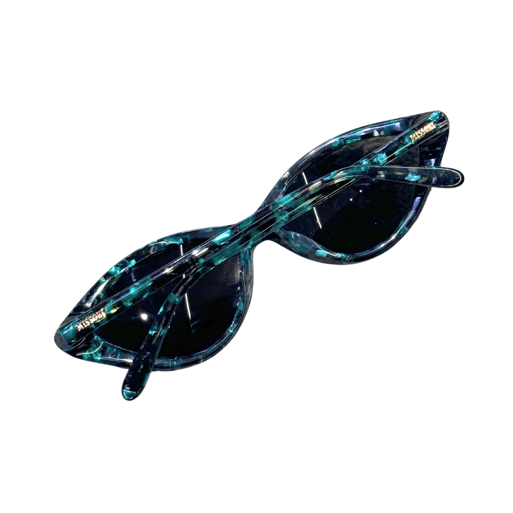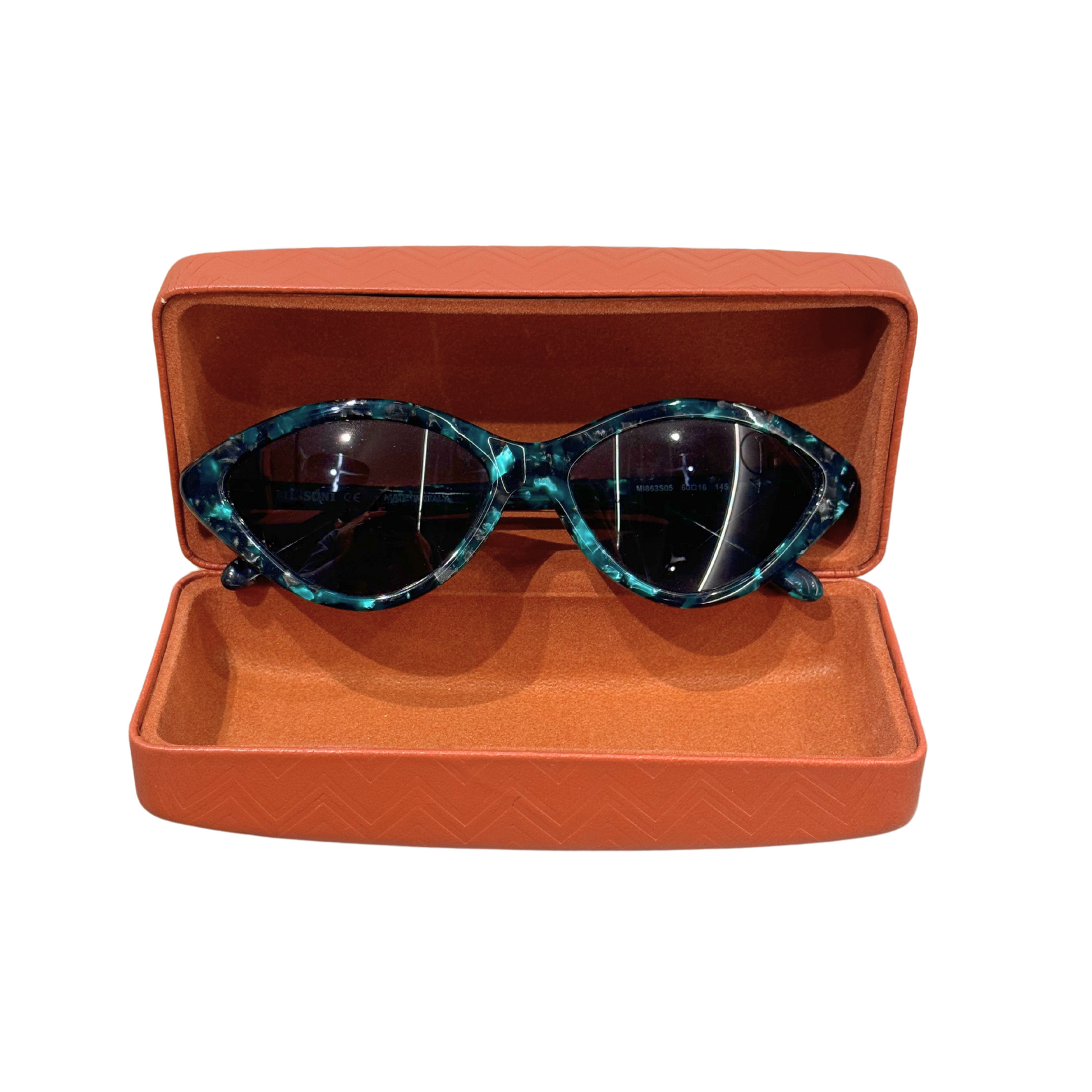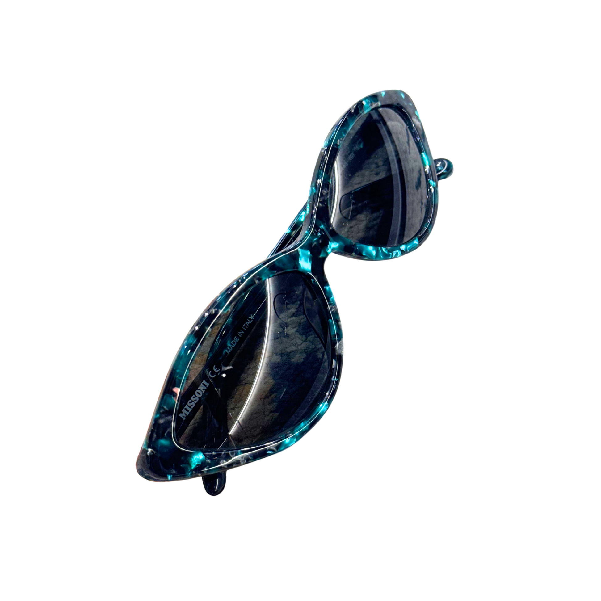 Occhiali Missoni con montatura allungata sui toni del verde scuro/nero e verde smeraldo. Logo dorato sulle stanghette.