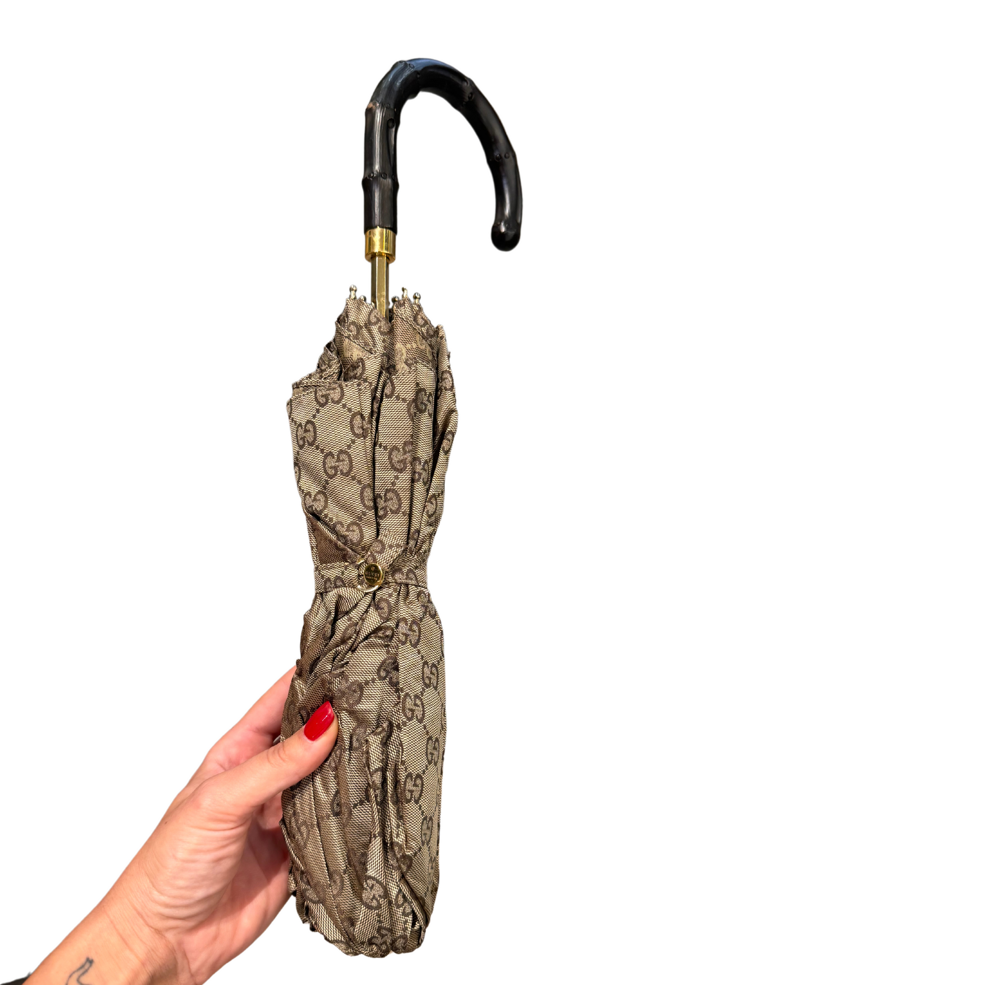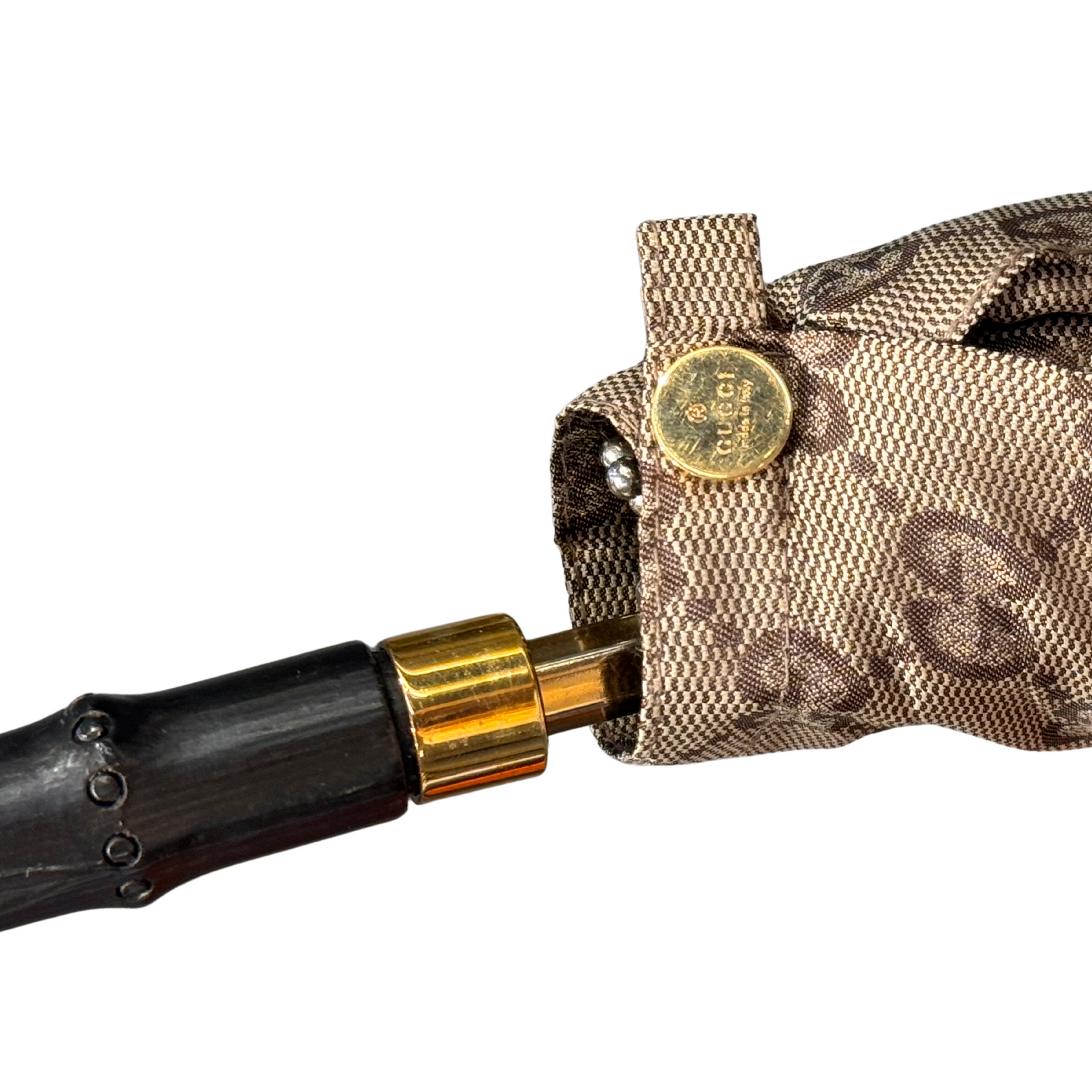 Piccolo ombrello Gucci realizzato con trama GG supreme. Manico in bambu marrone. E' completo anche del sacchetto porta ombrello.