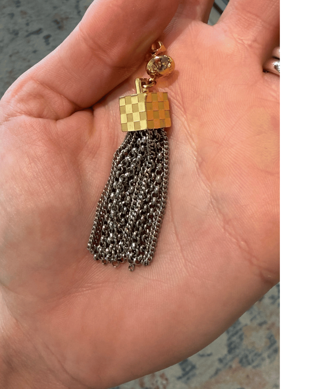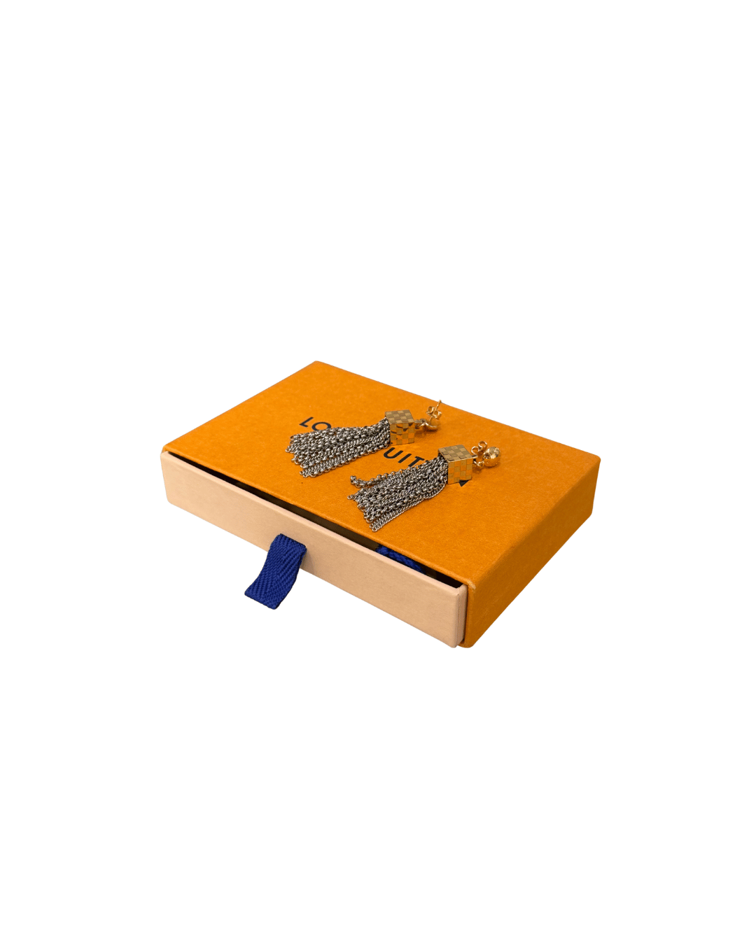 Orecchini Louis Vuitton modello “Damier Charlie”, dal design elegante e distintivo, perfetti per dare carattere anche al look più semplice. Il dettaglio iconico è il cubo con motivo Damier bicolore, che richiama immediatamente l’estetica della Maison, da cui partono lunghe nappine a catena argentata che creano movimento e luce ad ogni passo. Modello ricercato e non facilmente reperibile sul mercato.