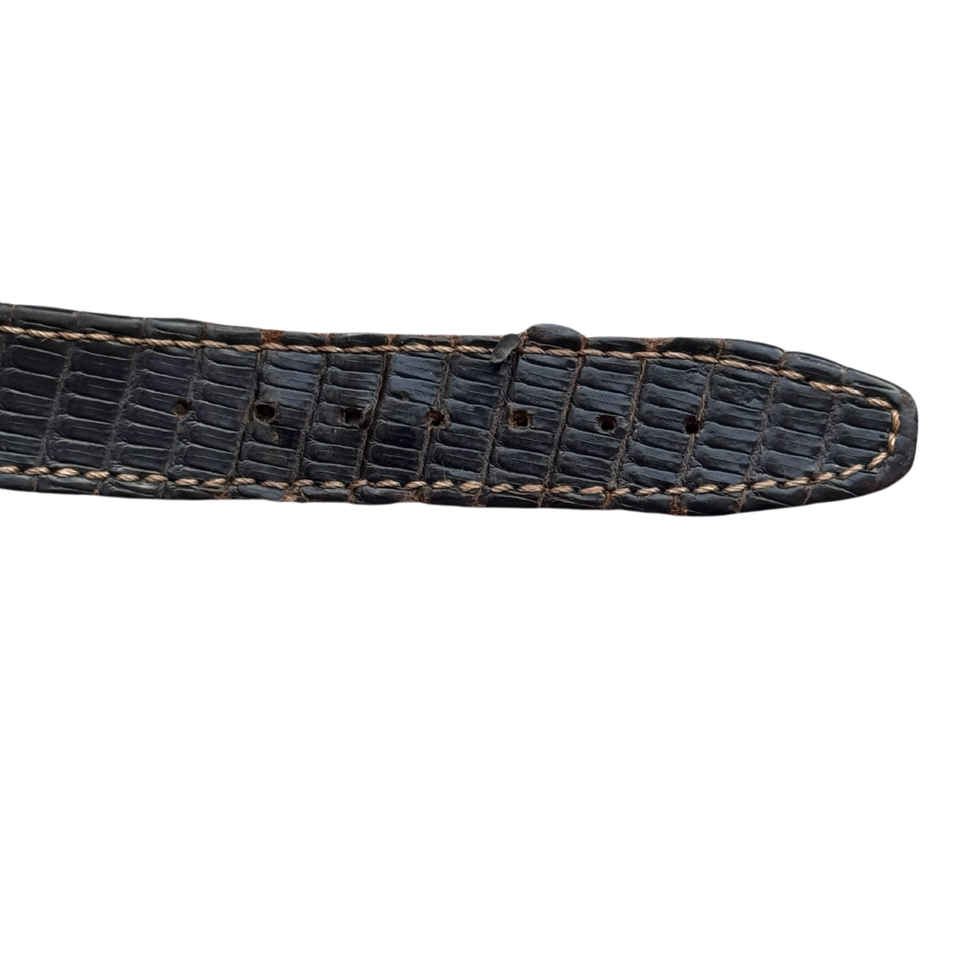 Orologio di Gucci vintage. Numero referenza: 3000J . Carica: quarzo. Materiale cassa: acciaio dorato. Cinturino: pelle marrone effetto rettile. Quadrante: riprende gli iconici colori della fascia web della maison, rosso e verde.