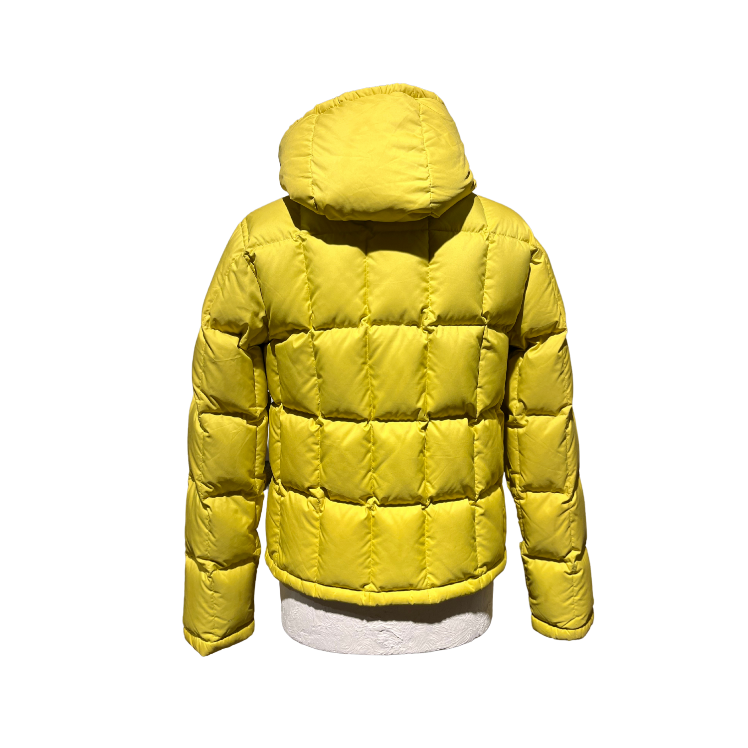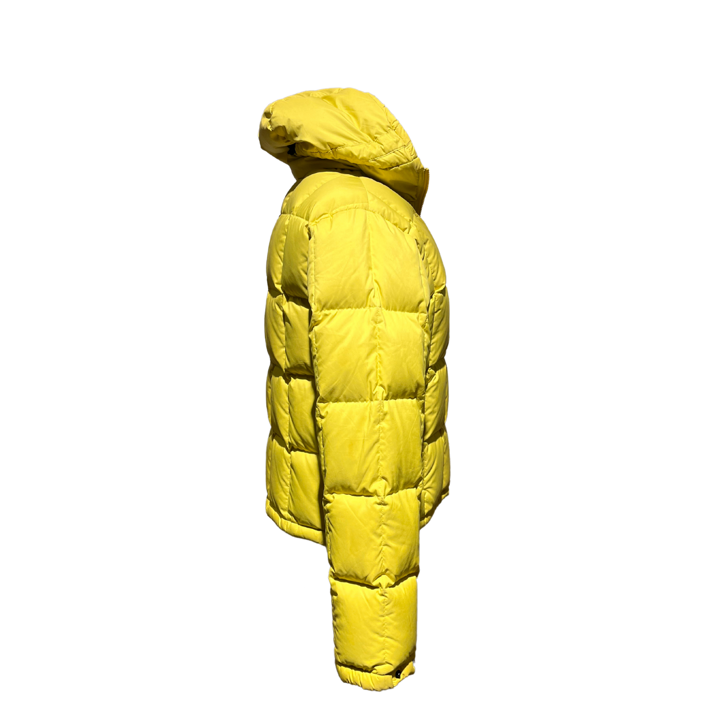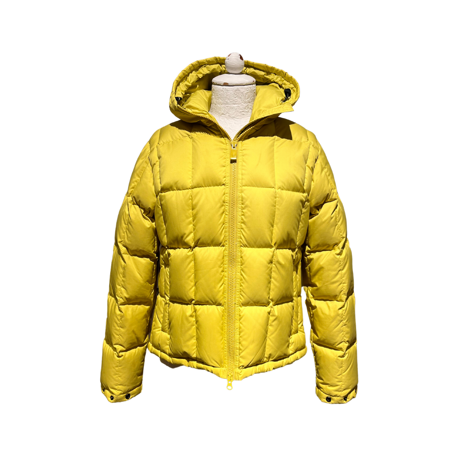 Piumino Aspesi in una sgargiante tinta gialla con cappuccio.