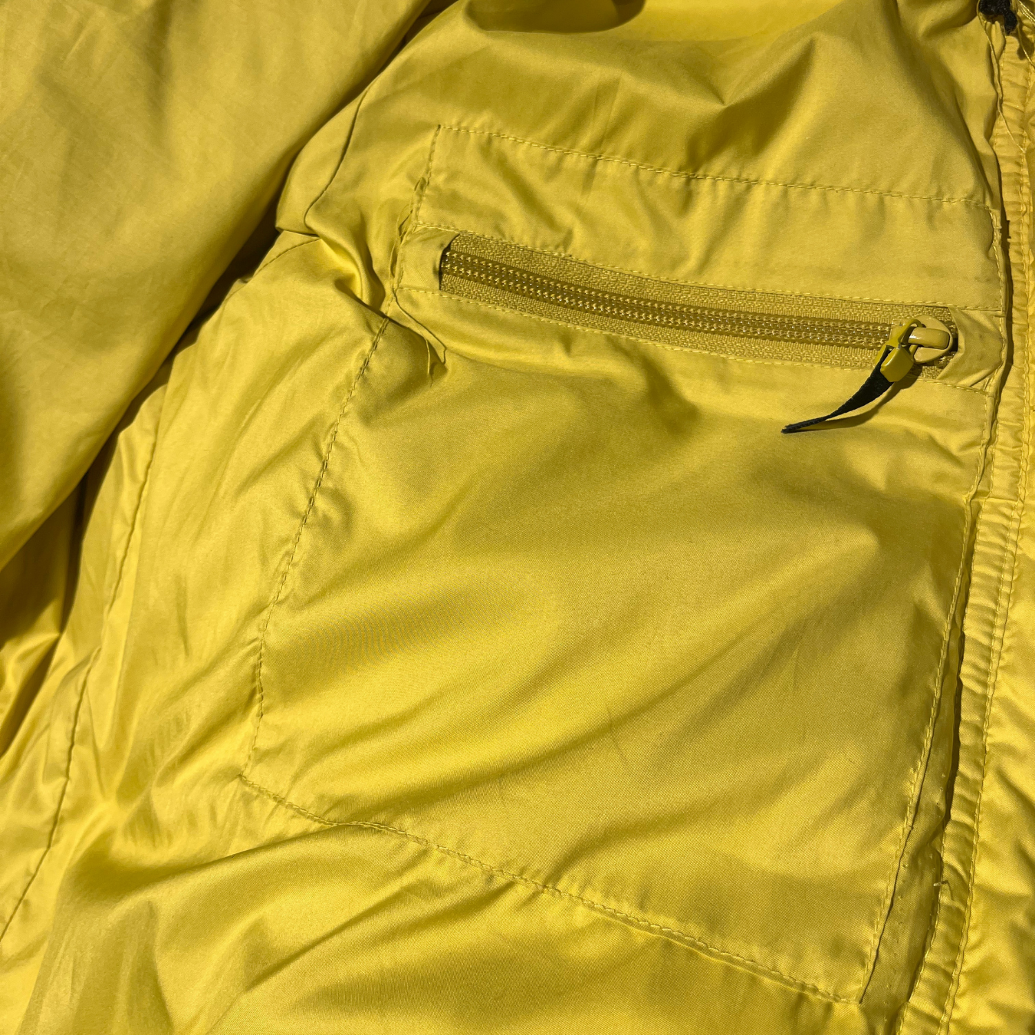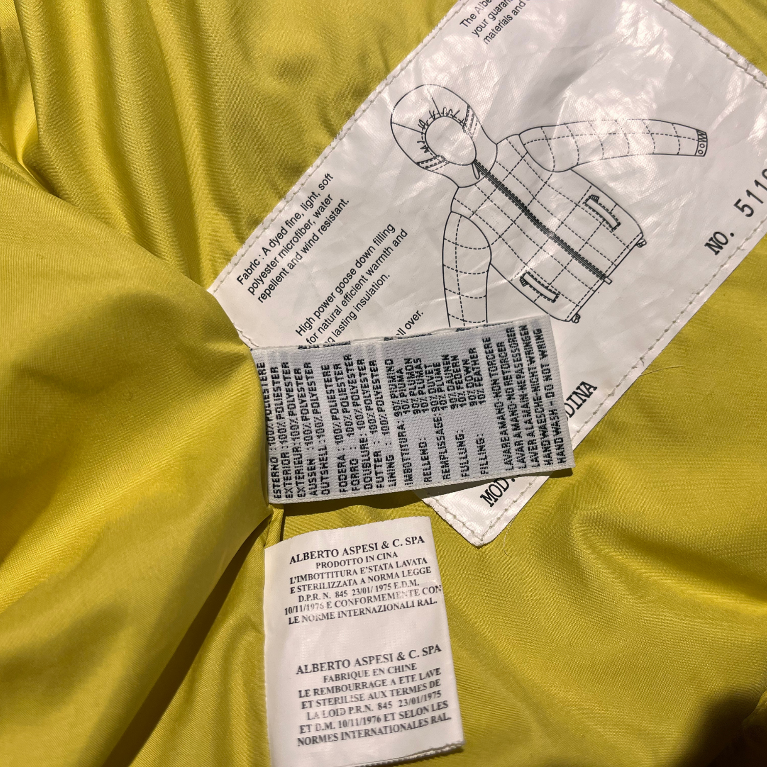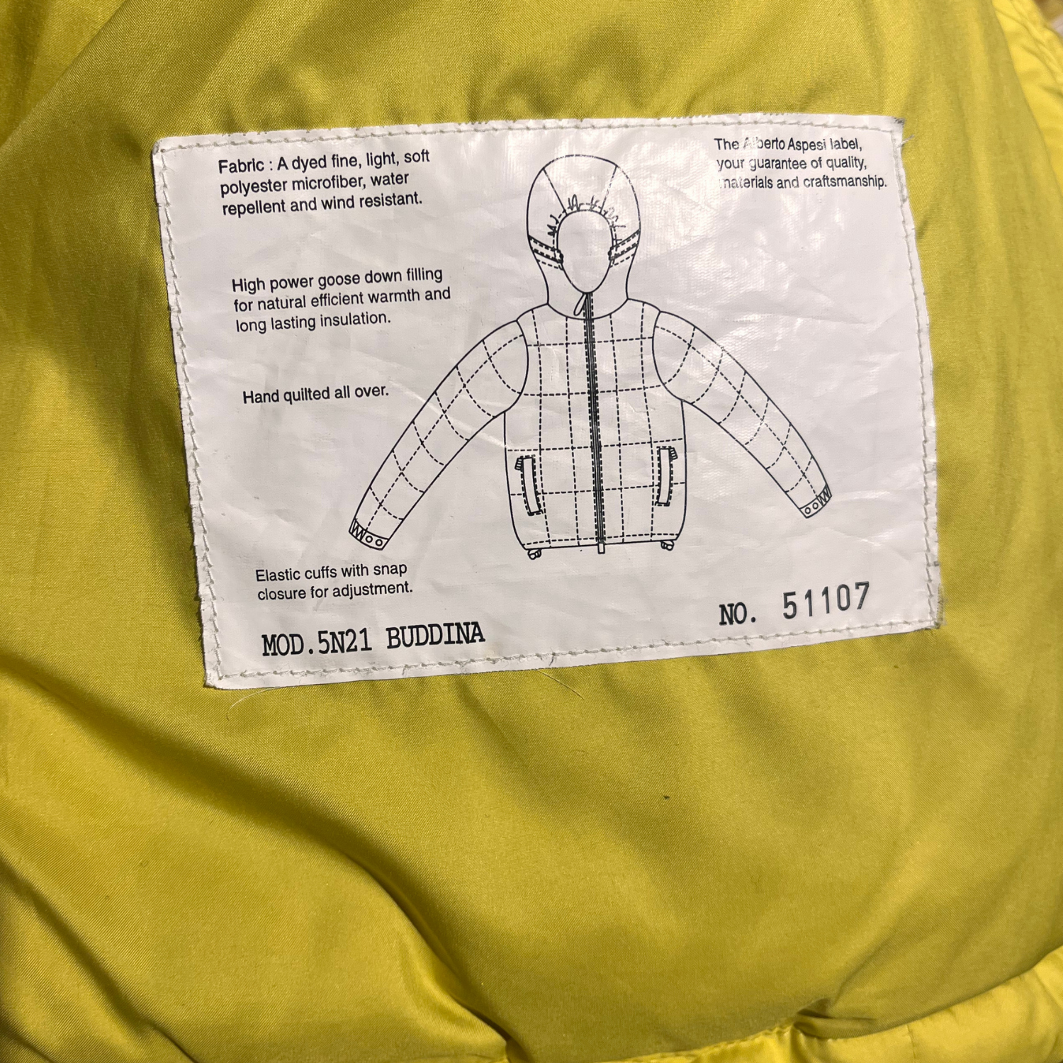 Piumino Aspesi in una sgargiante tinta gialla con cappuccio.
