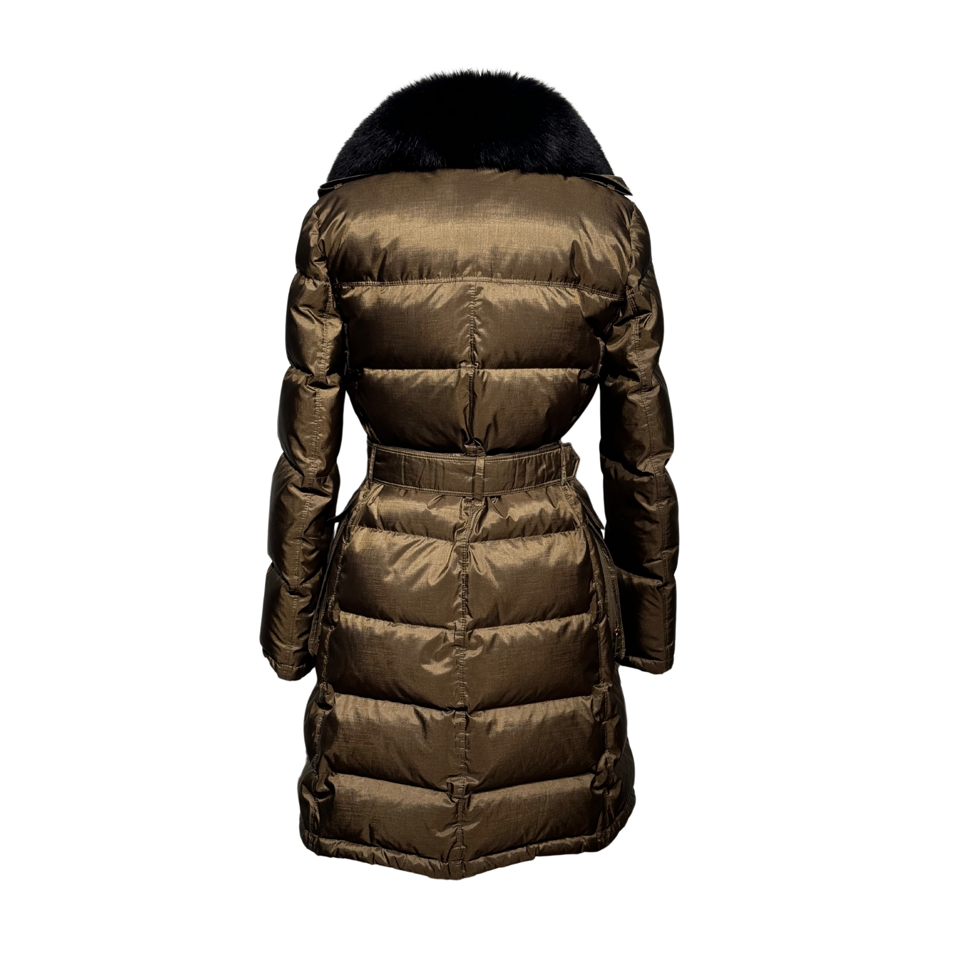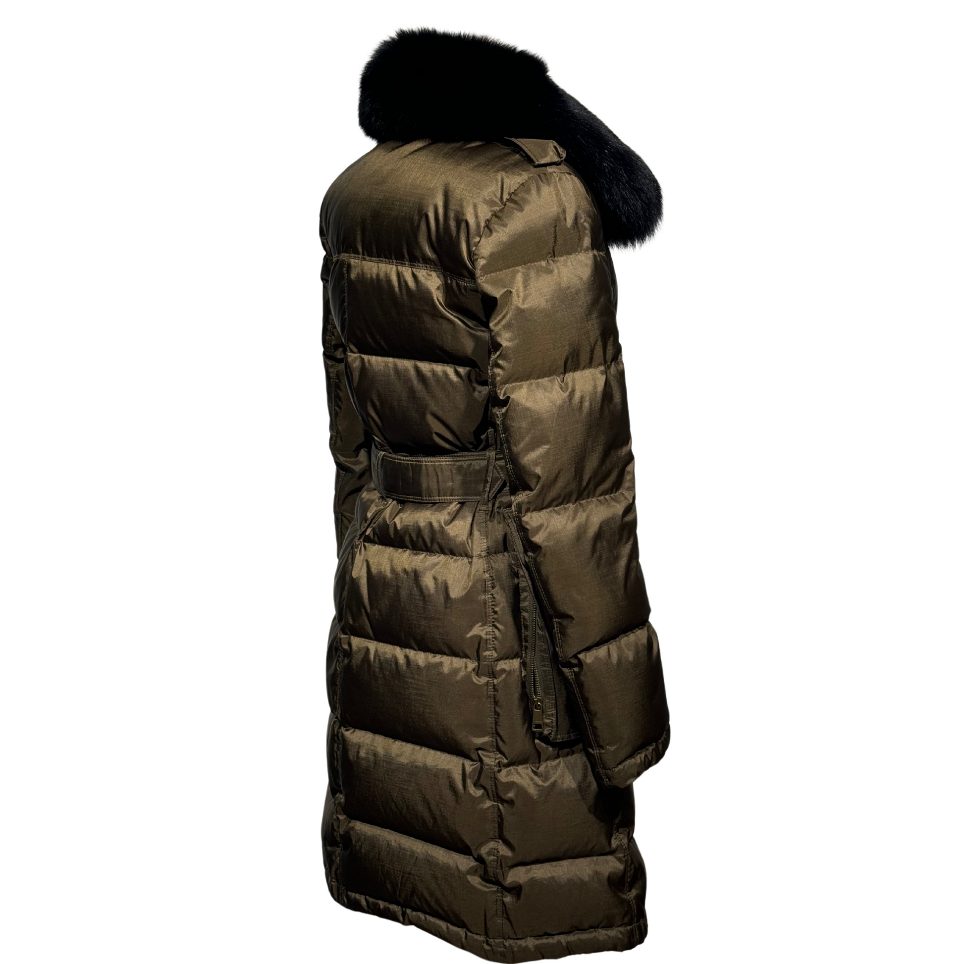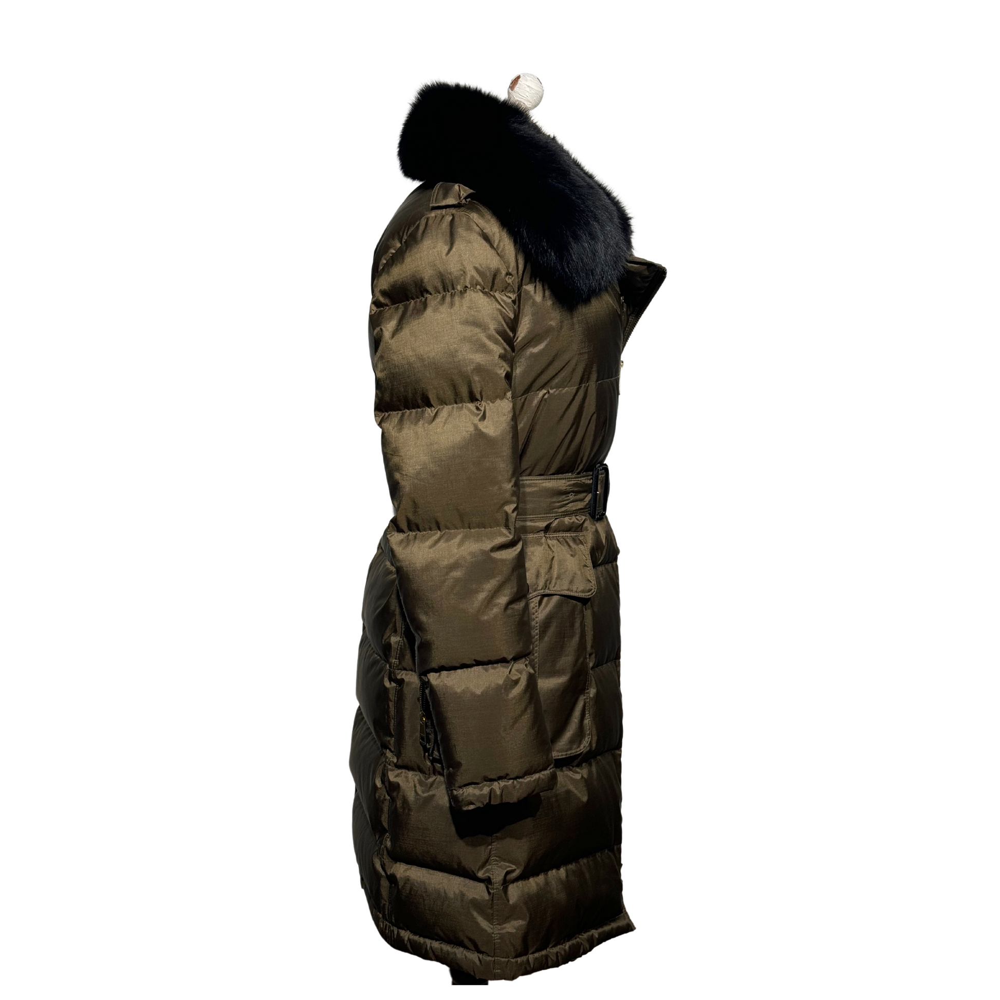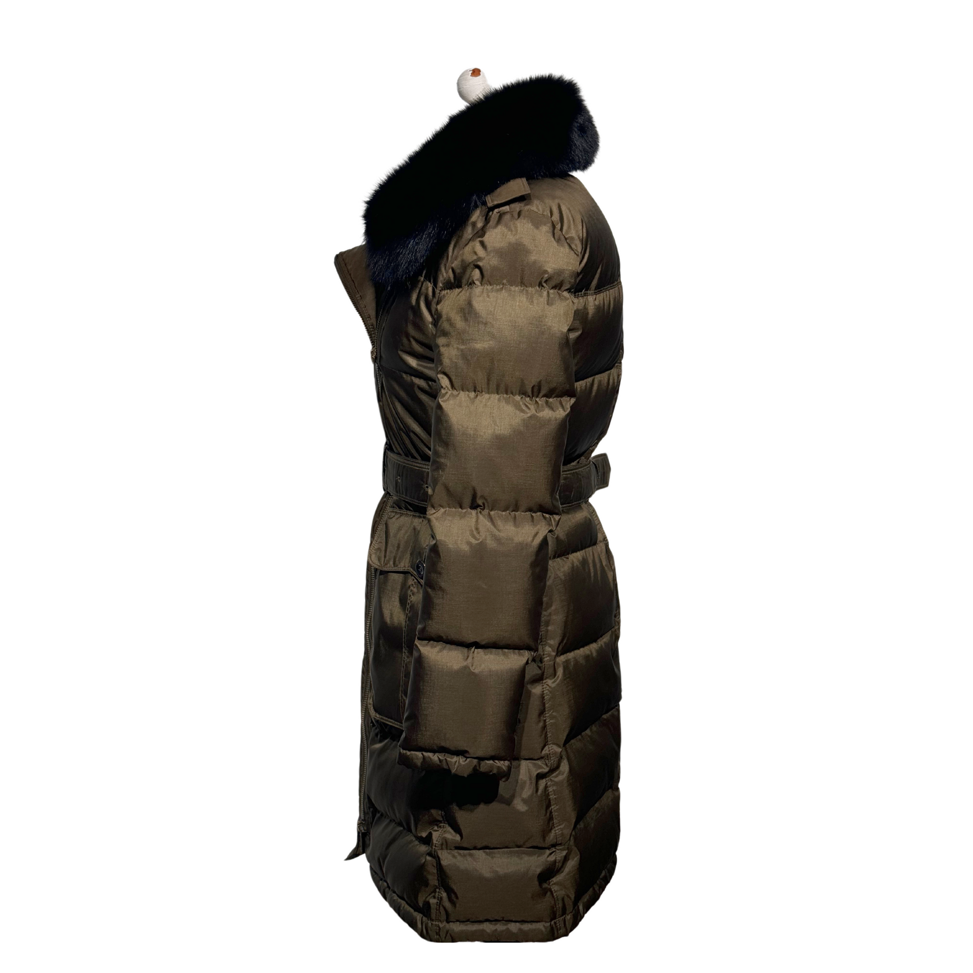 Piumino Burberry color verde scuro metallizzato. Impreziosito da collo in volpe nero, amovibile. Apertura frontale con bottoni e cerniera e cintura in vita. Tasche laterali.