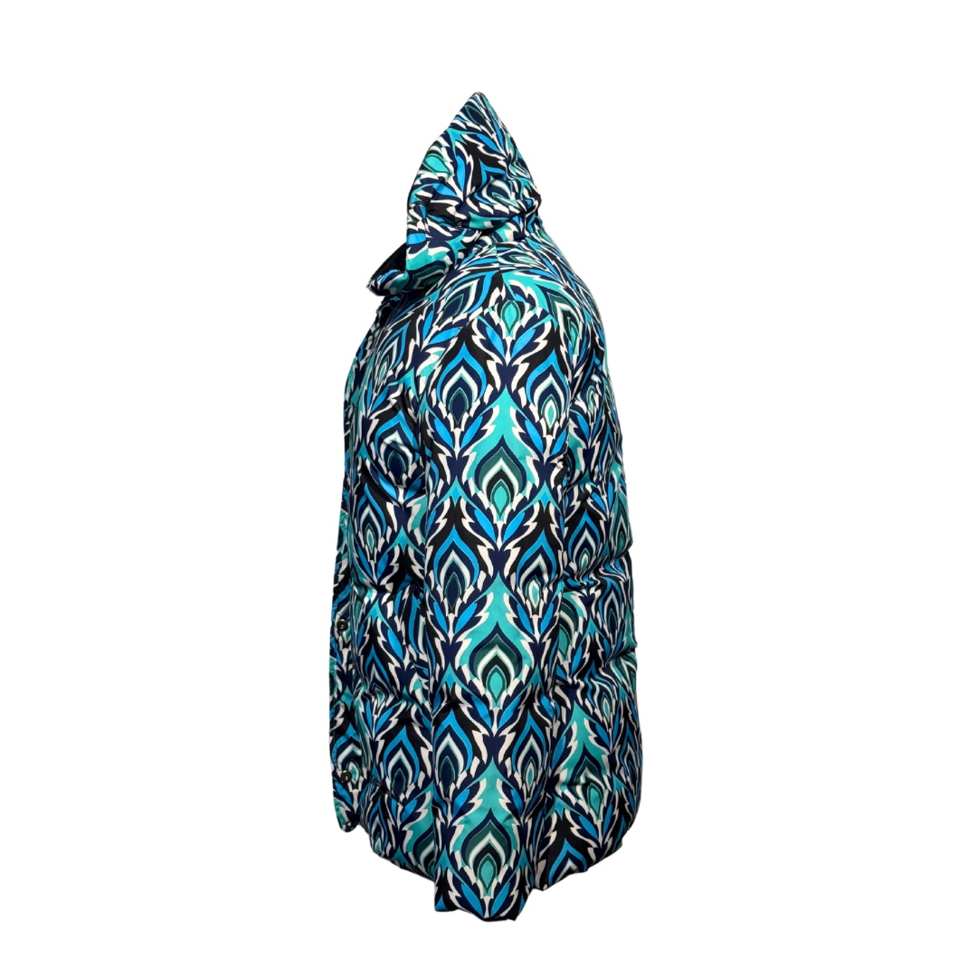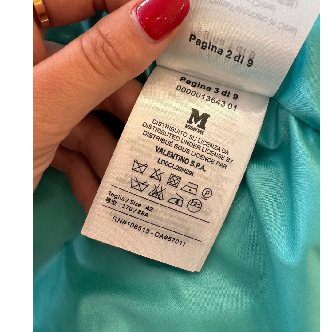 Piumino Missoni, una delle sue classiche trame sui toni del blu ,verde acqua, bianco e nero. Apertura frontale con bottoni e cerniera. Tasche laterali. Elastico in corrispondenza della vita, del collo e dei polsi.