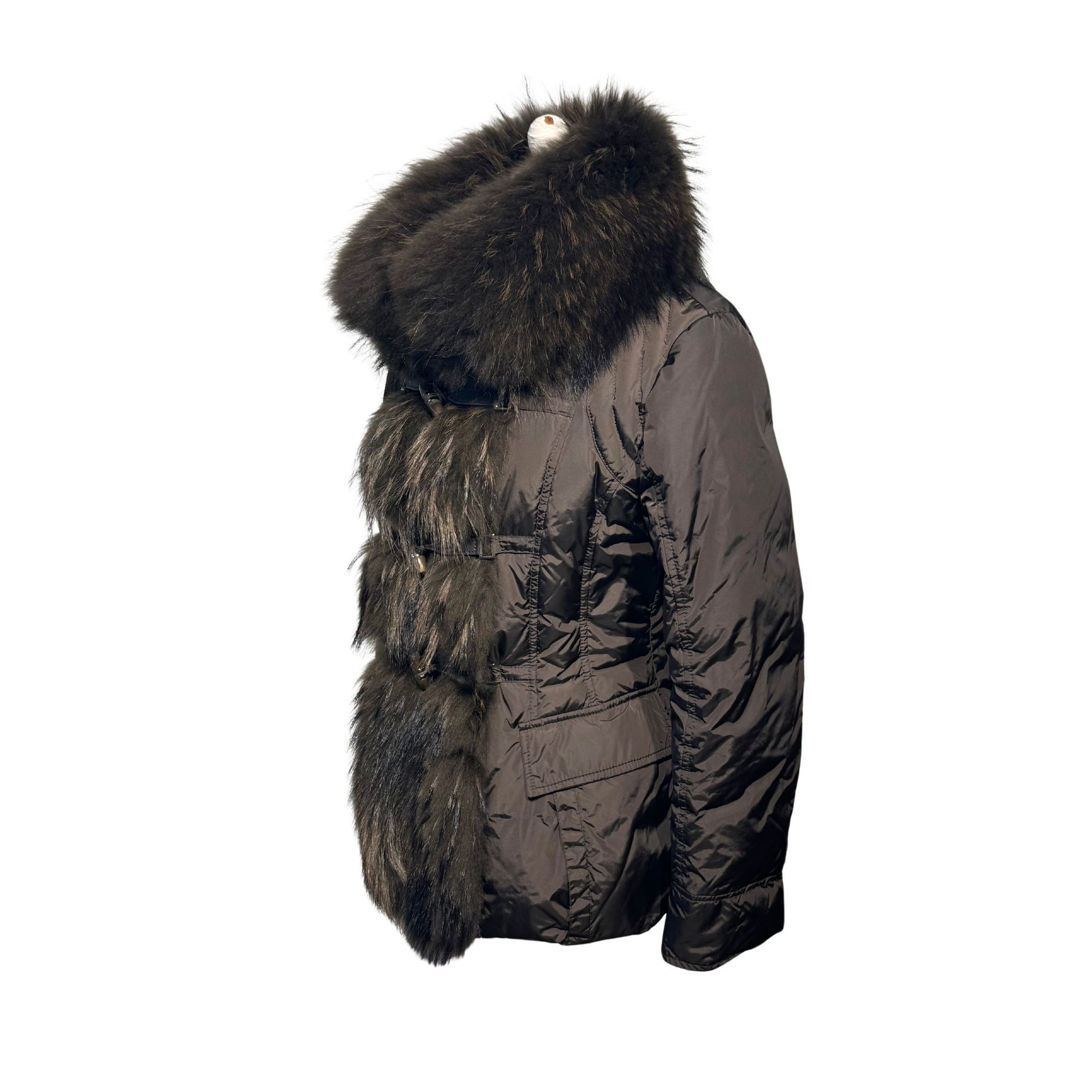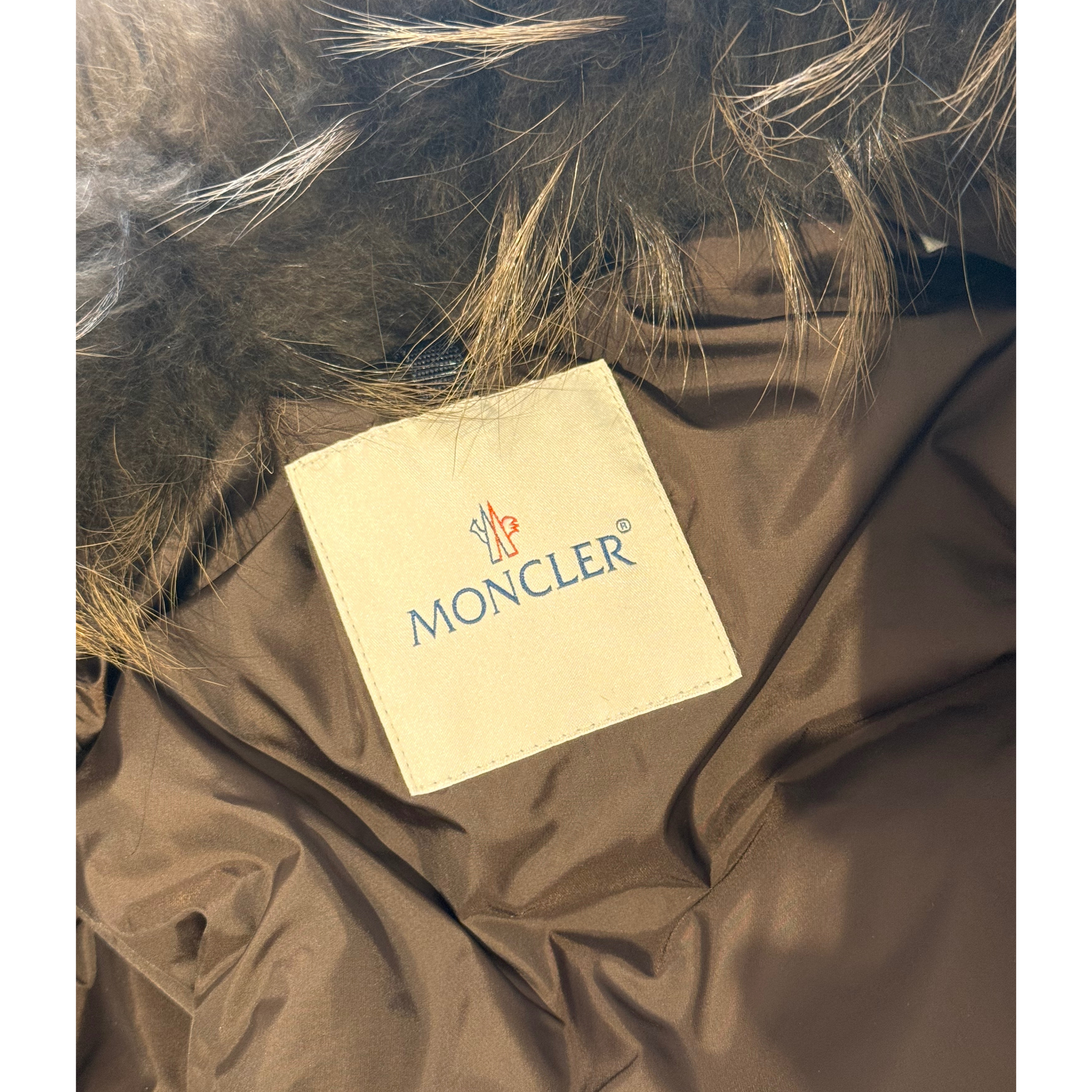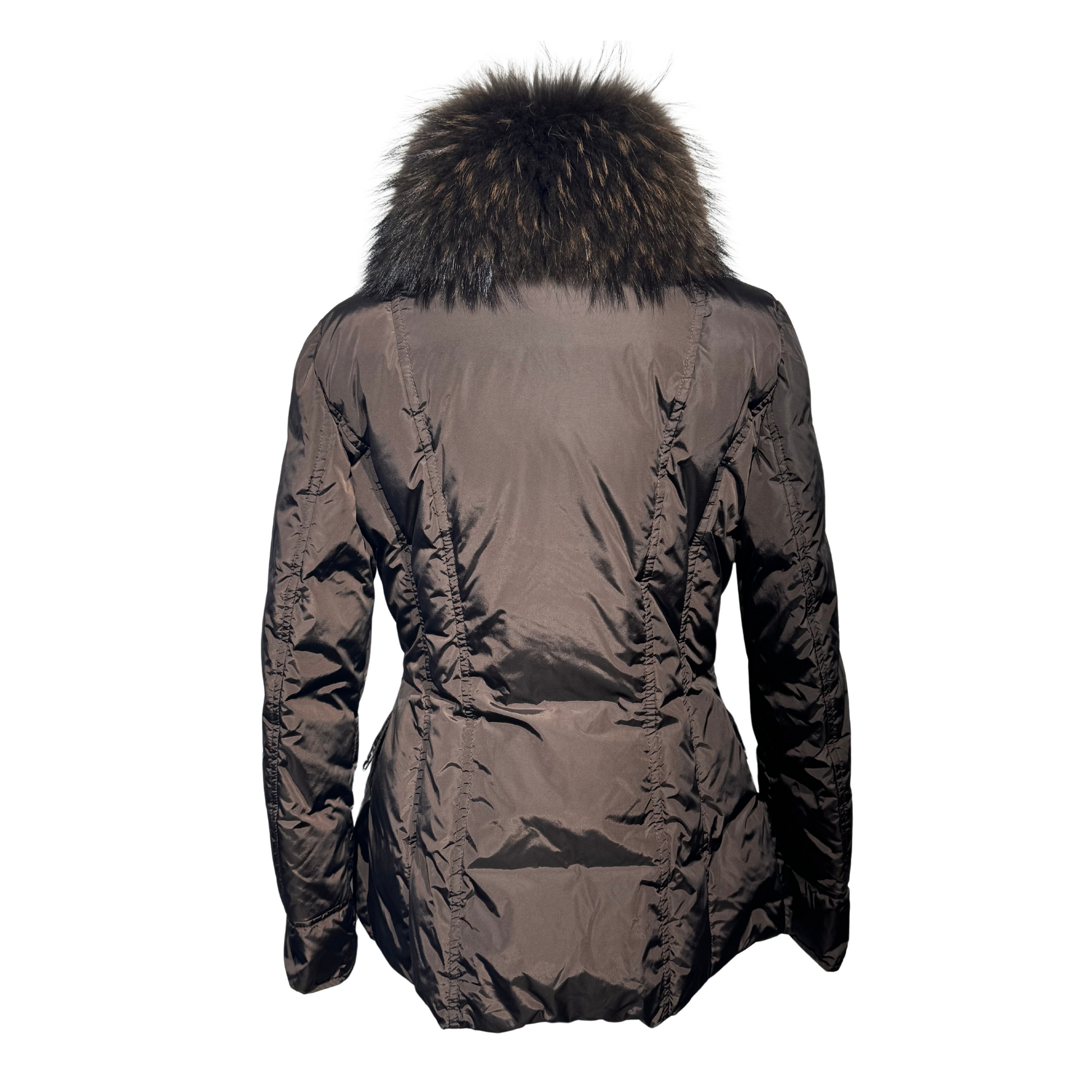 Piumino color cioccolato Moncler impreziosito frontalmente da pelo di volpe. Apertura con bottoncini e alamari. Tasche laterali.