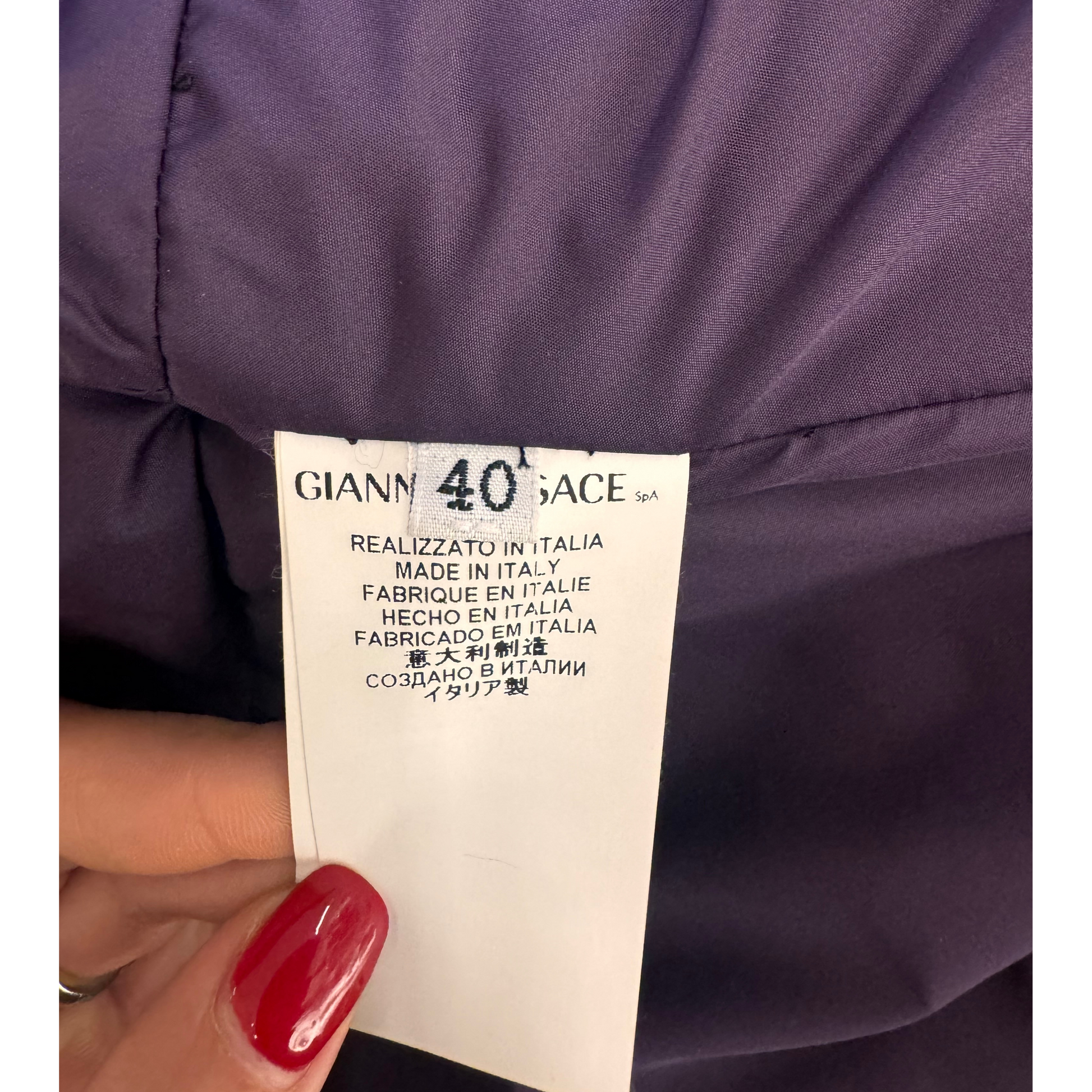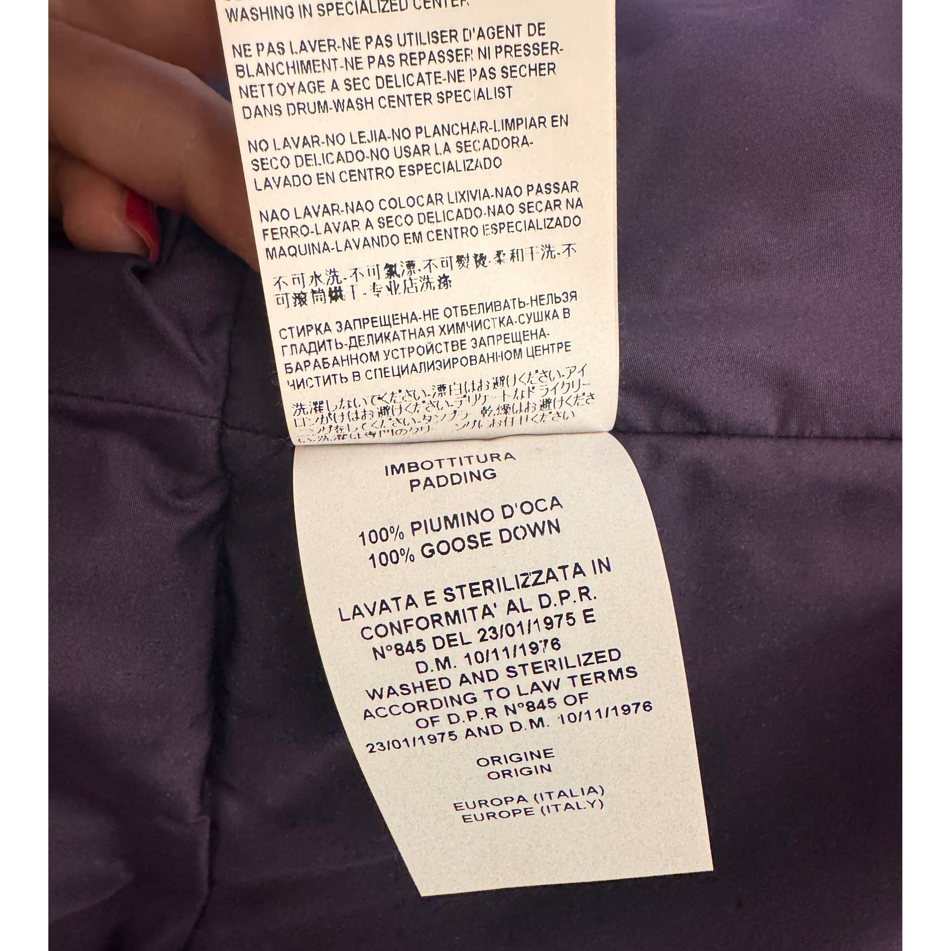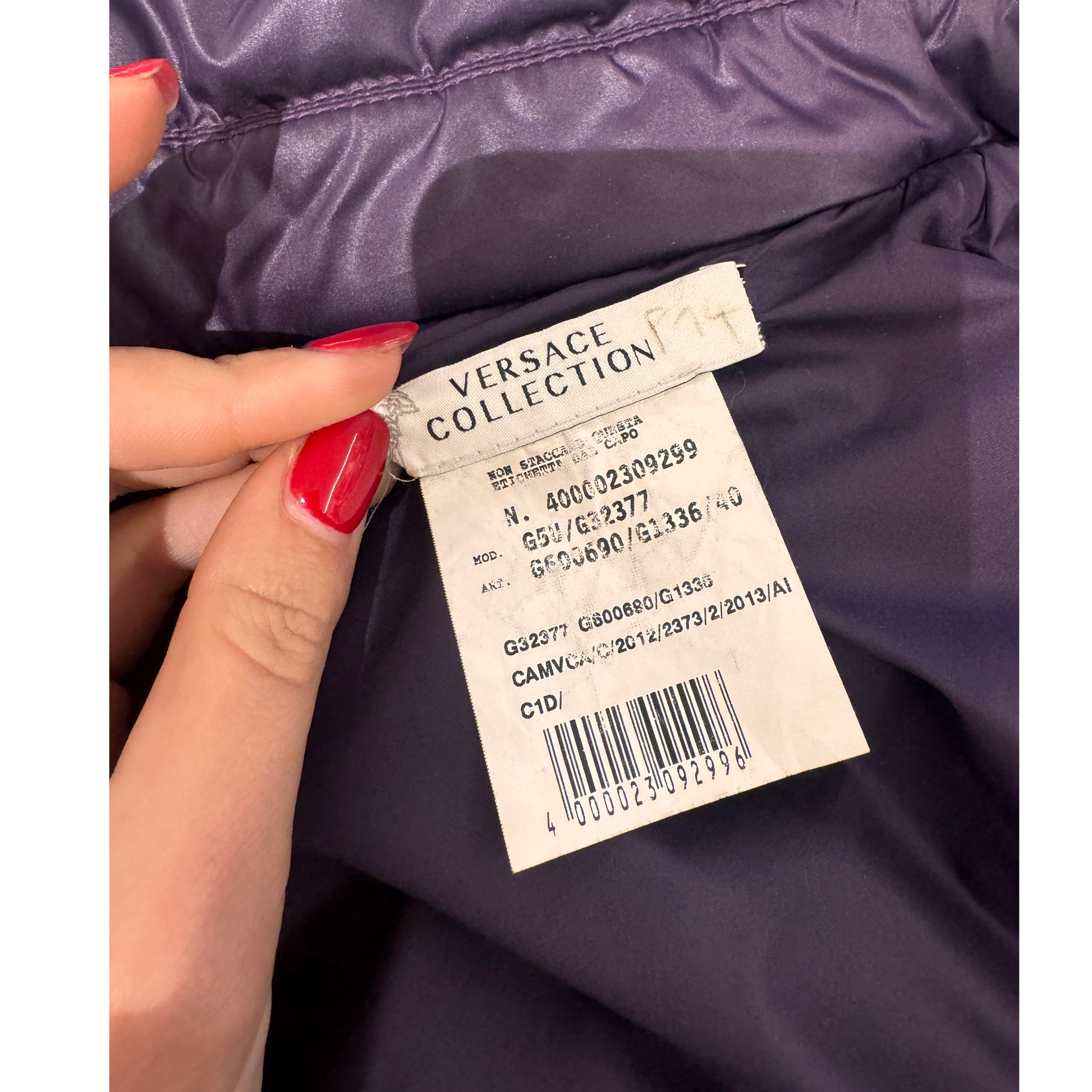 Piumino viola di Versace con inserti e maniche in lana del medesimo colore. Apertura frontale con bottoni e cerniera. Doppie tasche. Collo pronunciato. Sfiancato .