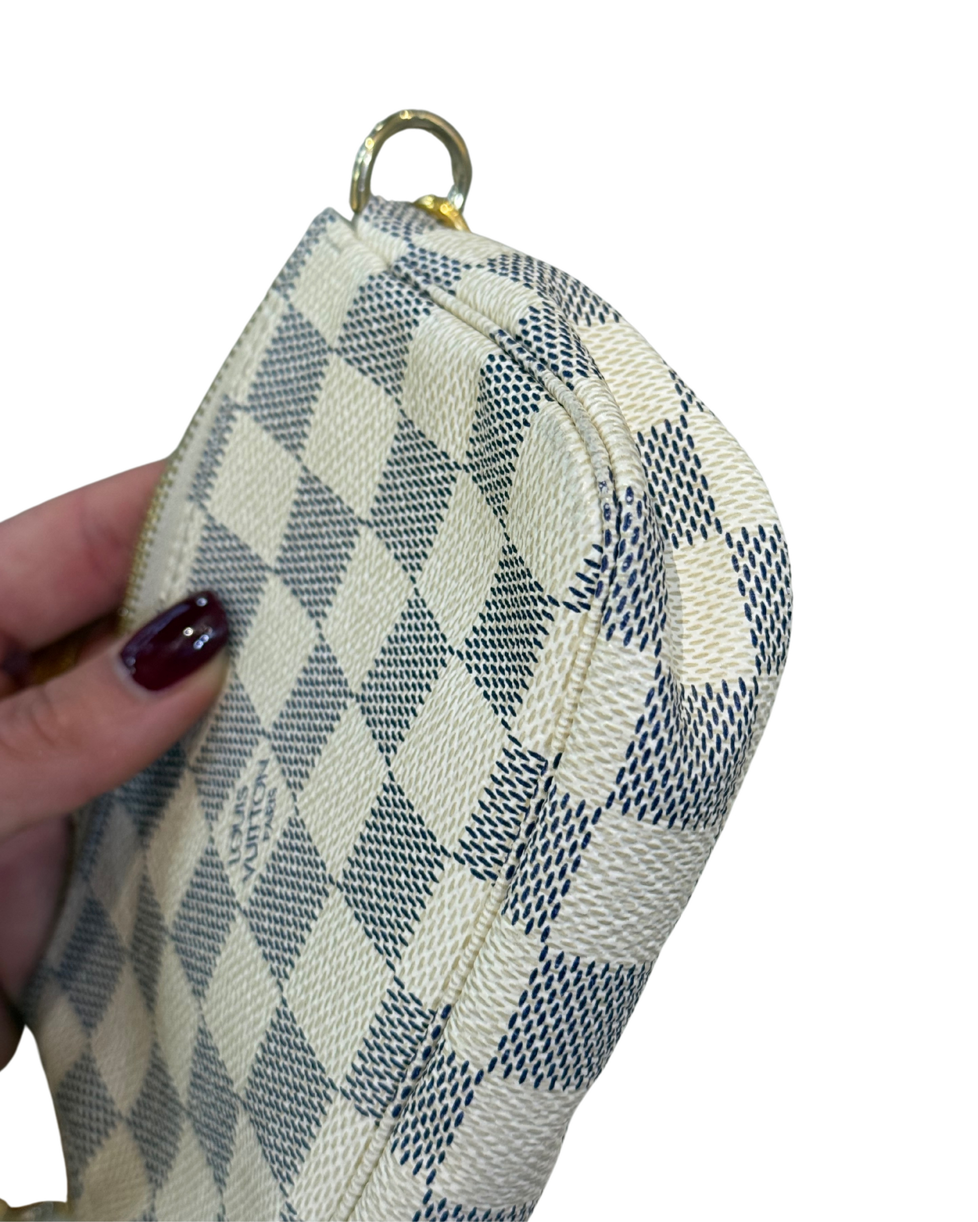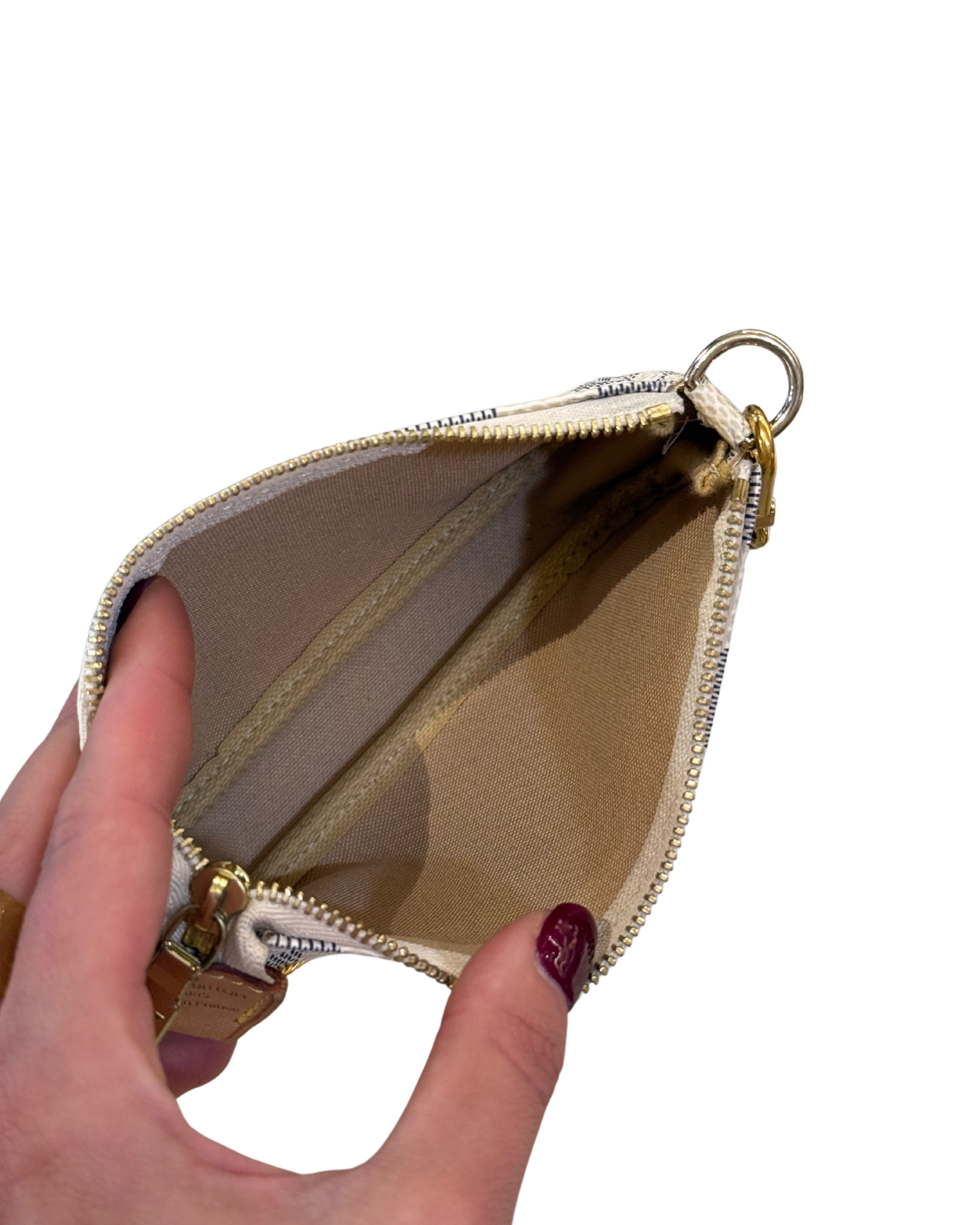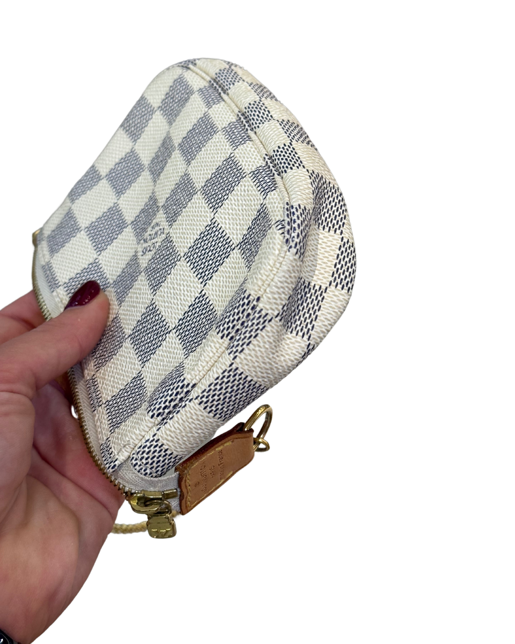 Mini pochette Accessorise LOUIS VUITTON in tela damier azur. Rifiniture in vacchetta naturale . Apertura superiore con cerniera. Catenella non amovibile dorata. (CODICE: DU 0079)