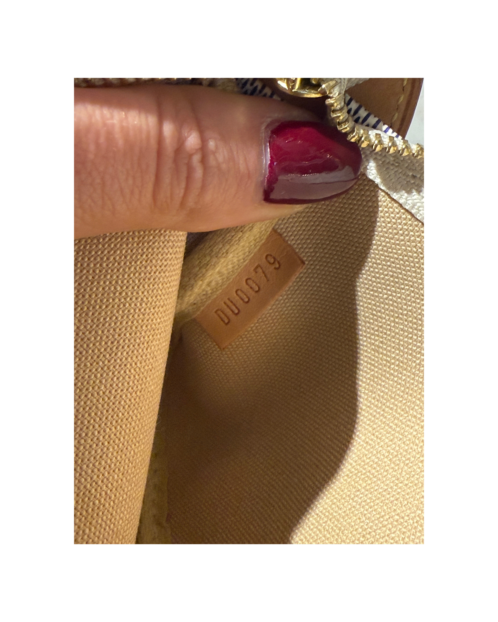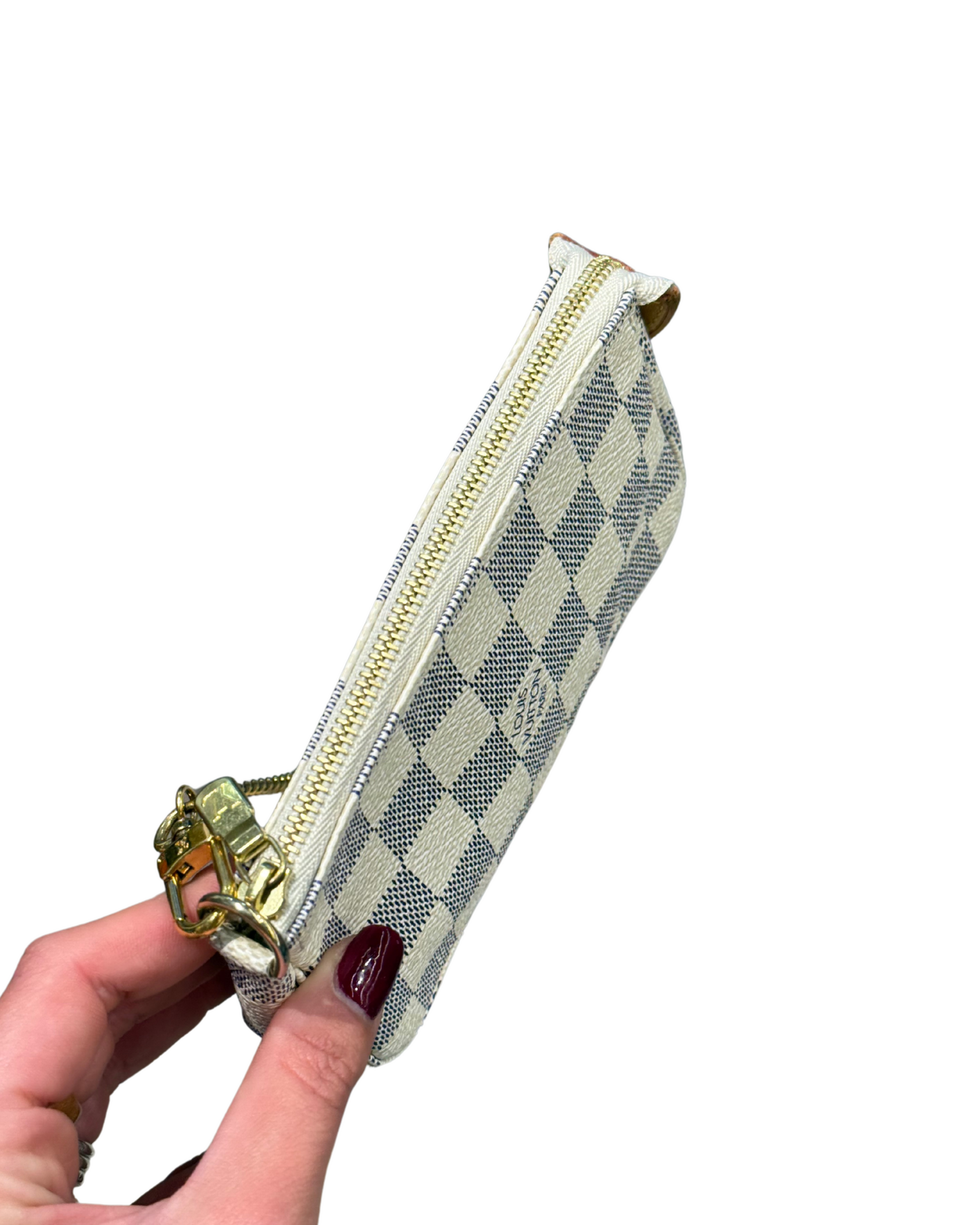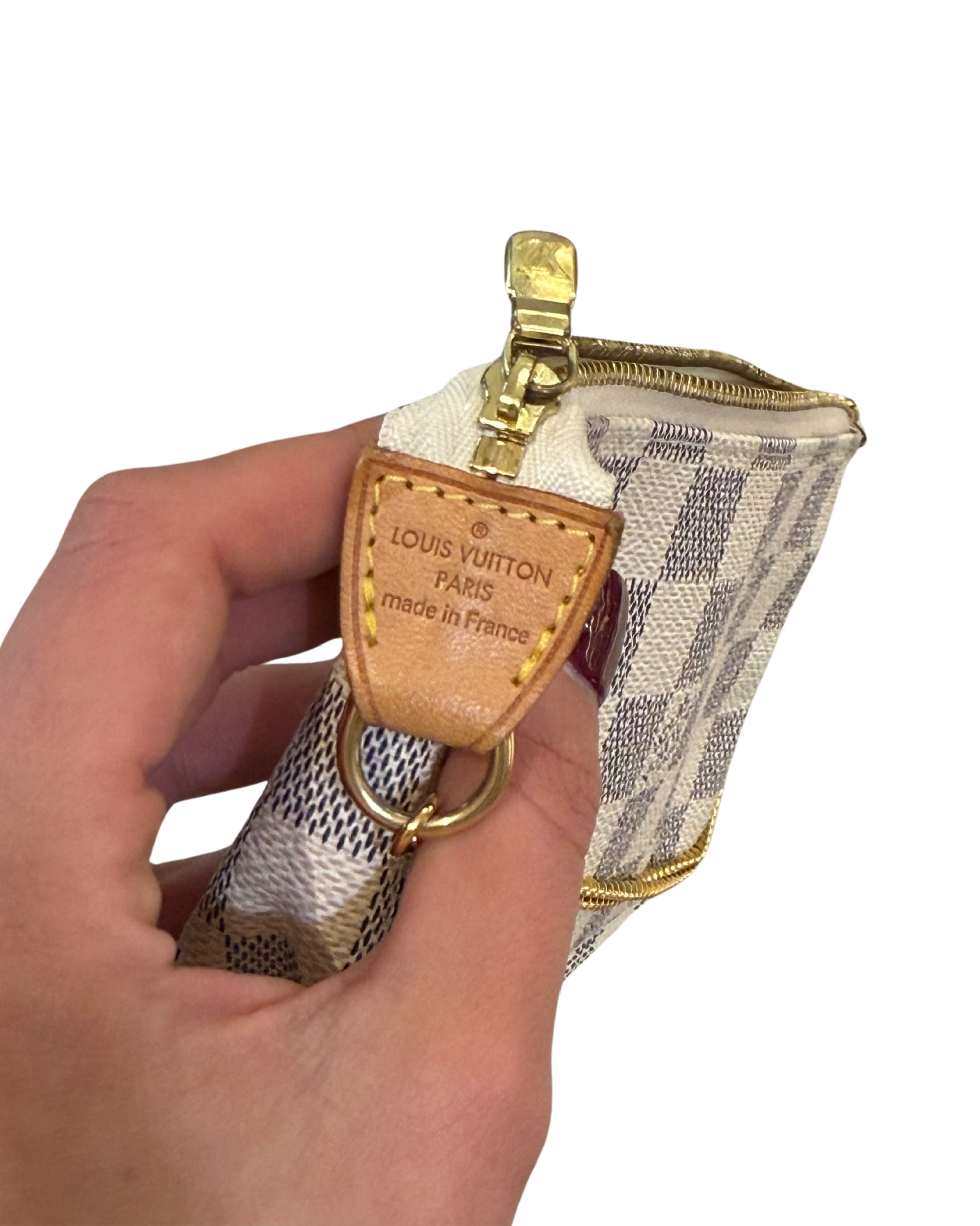 Mini pochette Accessorise LOUIS VUITTON in tela damier azur. Rifiniture in vacchetta naturale . Apertura superiore con cerniera. Catenella non amovibile dorata. (CODICE: DU 0079)