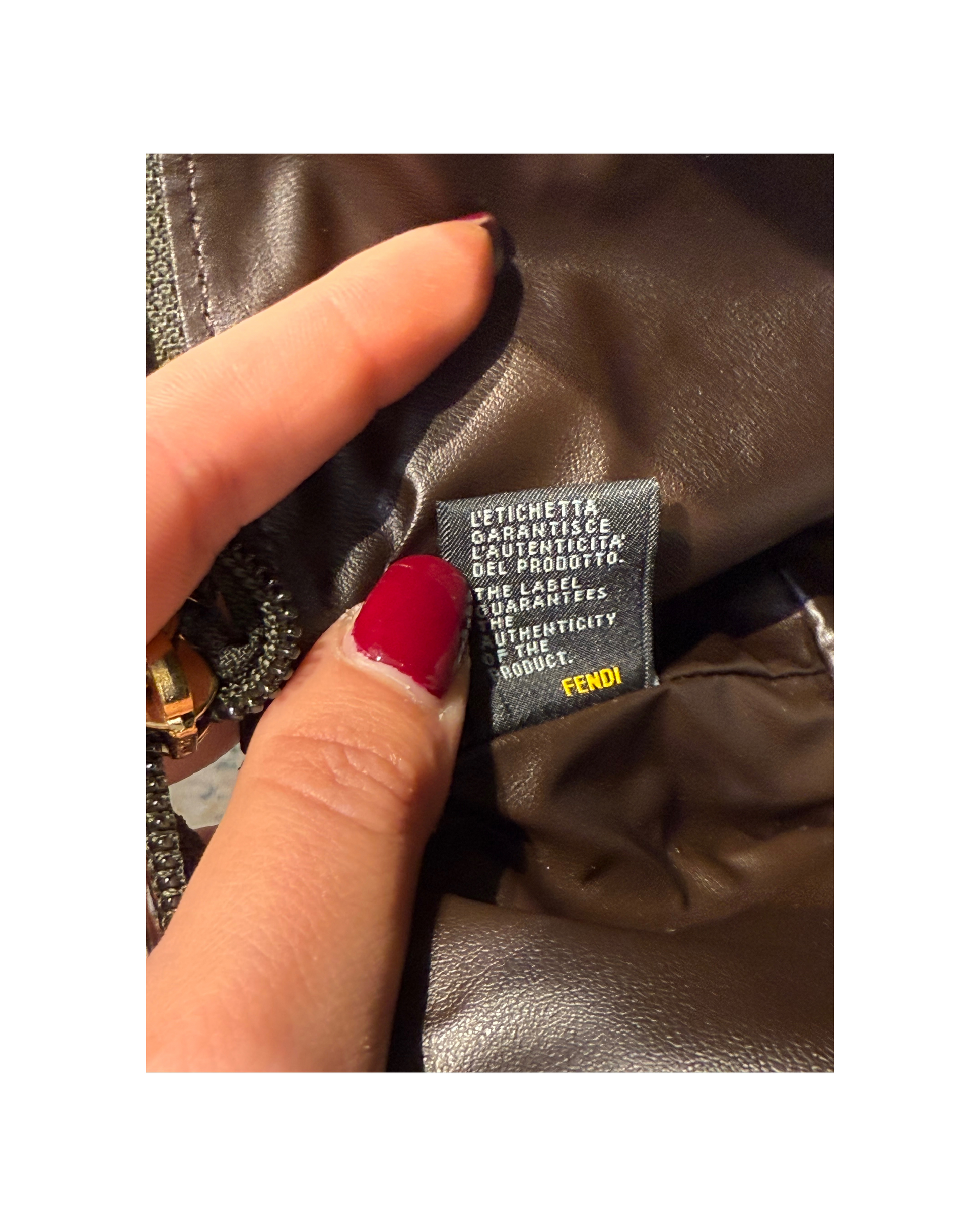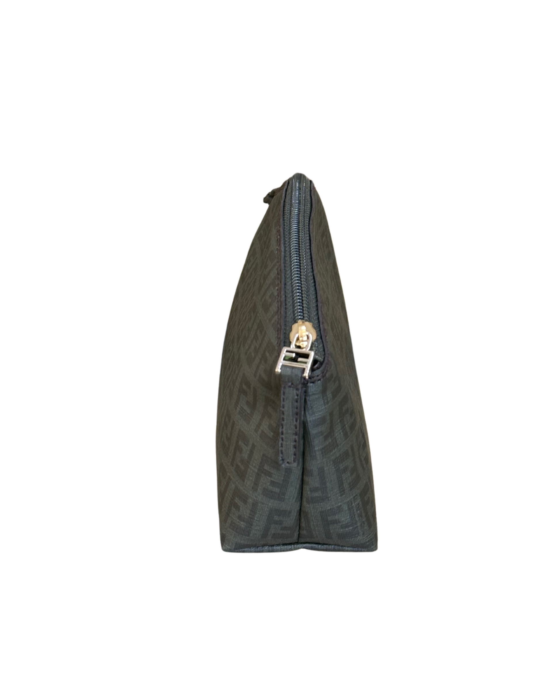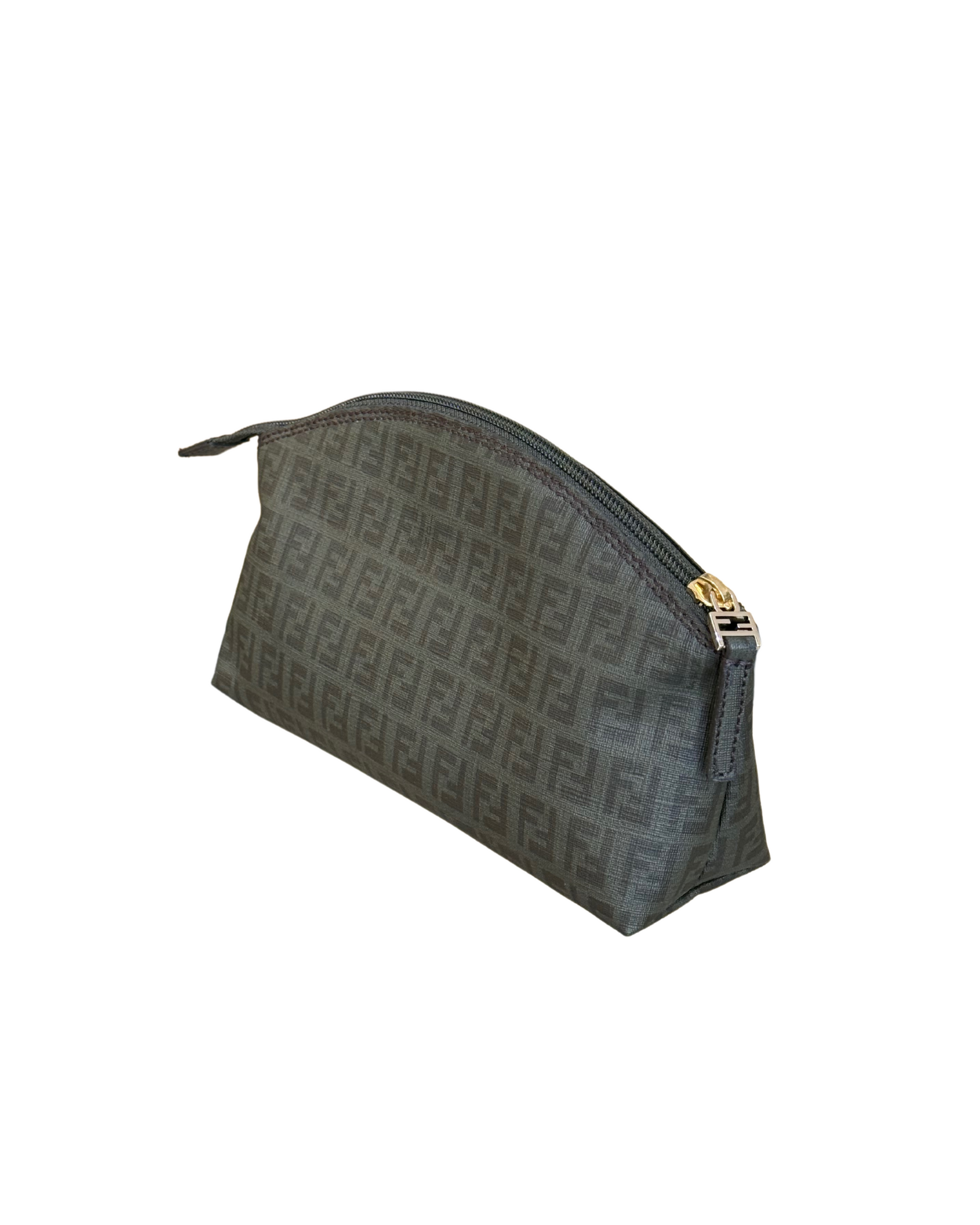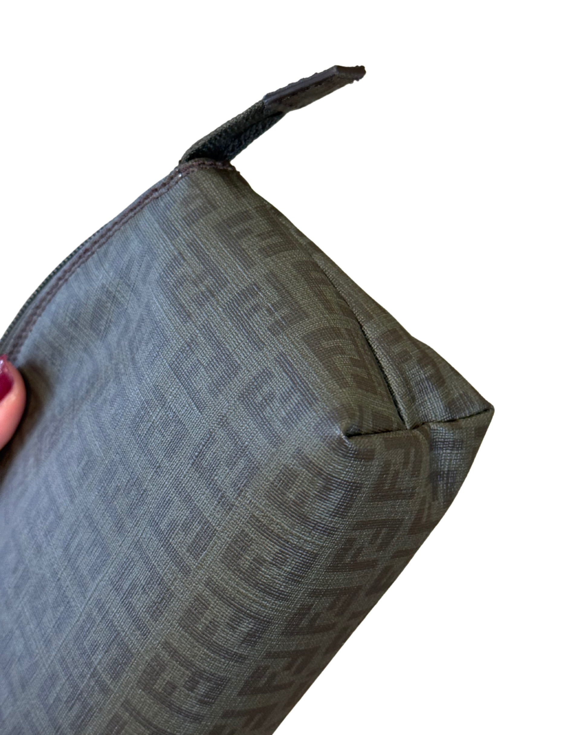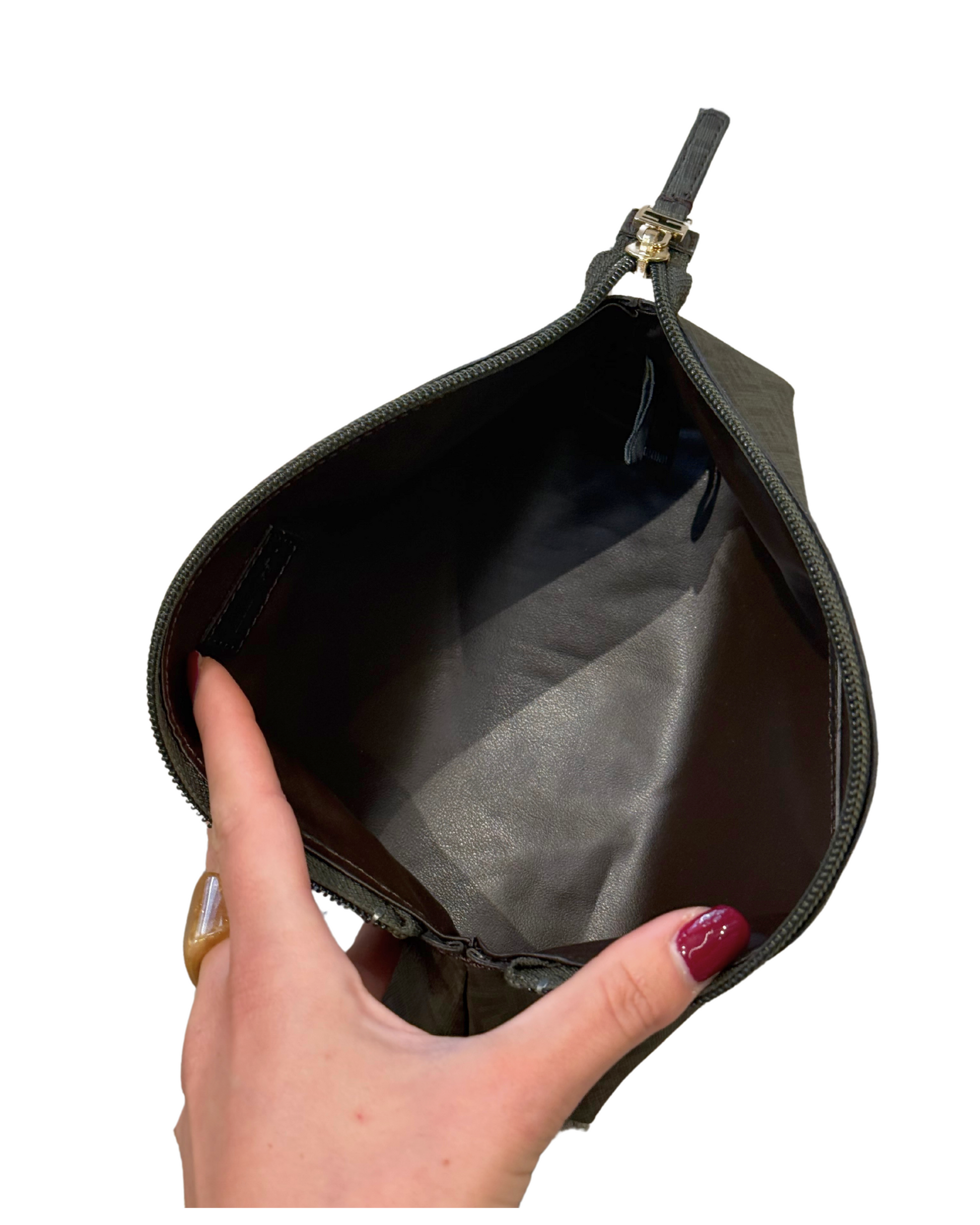 Piccola pochette a mano con trama fendi zucchina FF all-over verde oliva/grigio antracite. Apertura superiore con cerniera, tiralampo in pelle con ciondolo argentato. Interno in pelle marrone. Perfetta come beauty, portatrucchi o pochette da inserire in una borsa più grande. (codice: 2111 7N0005 YG1 109)