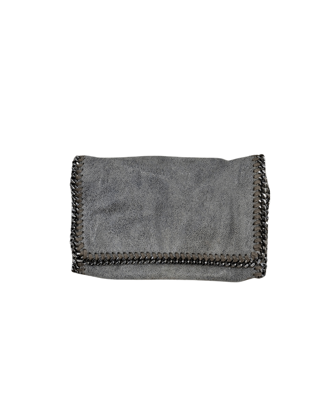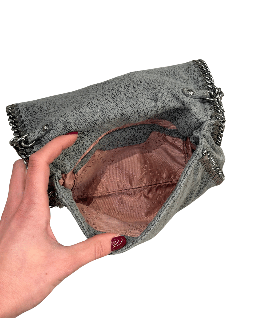 Pochette Falabella di Stella McCartney, con il suo iconico profilo in catena che incornicia tutta la silhouette. Realizzata in materiale Green effetto suede grigio La struttura è morbida e pieghevole, tipica del modello, con chiusura a bottone magnetico. All’interno troviamo una fodera logata color cipria. La tracolla in catena permette di indossarla comodamente crossbody, rendendola pratica ma sempre d’impatto.