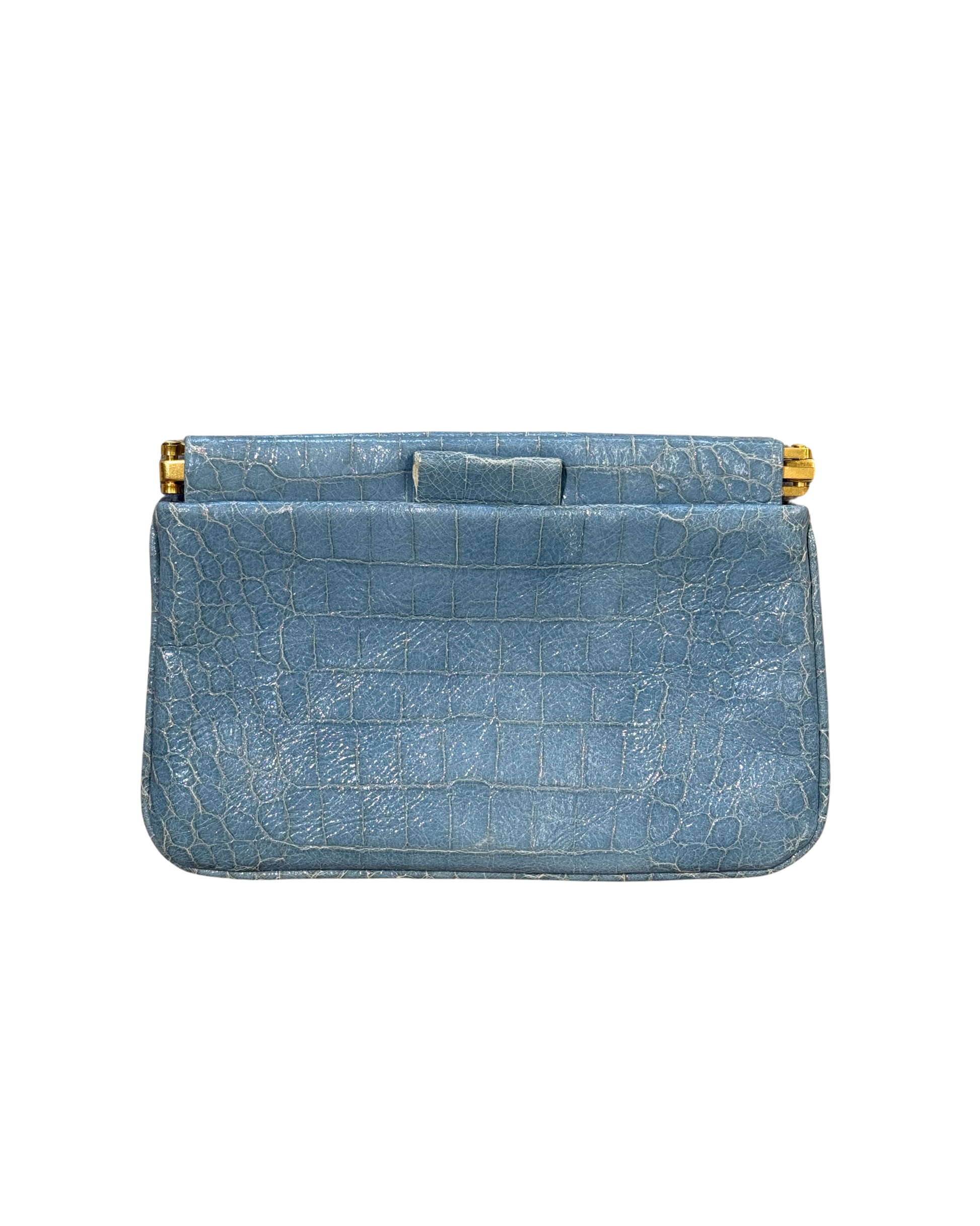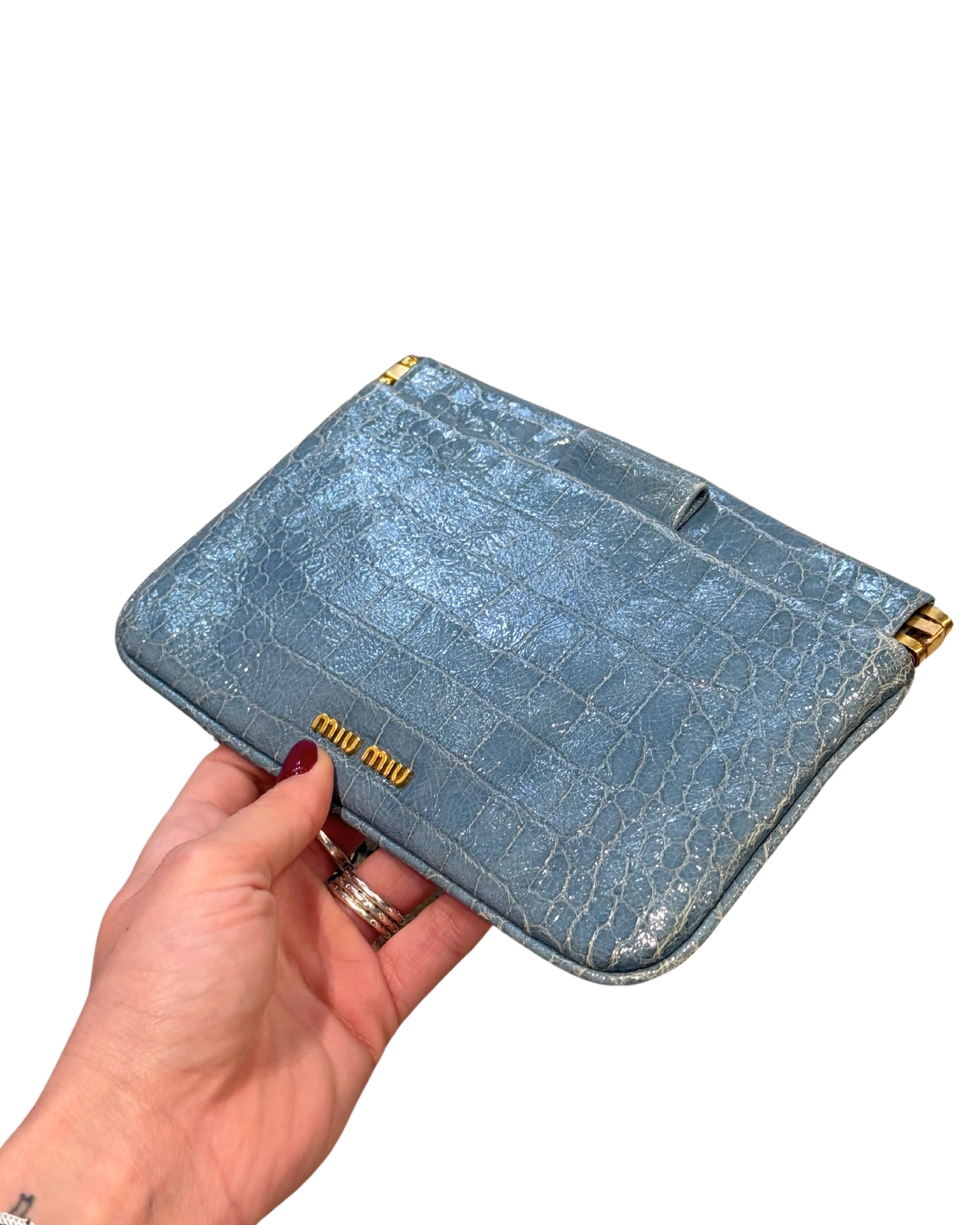 Pochette MiuMiu realizzata in pelle stampa cocco azzurra. Logo frontale in metallo dorato. Apertura superiore. Interno in tessuto marrone, tasca piatta.