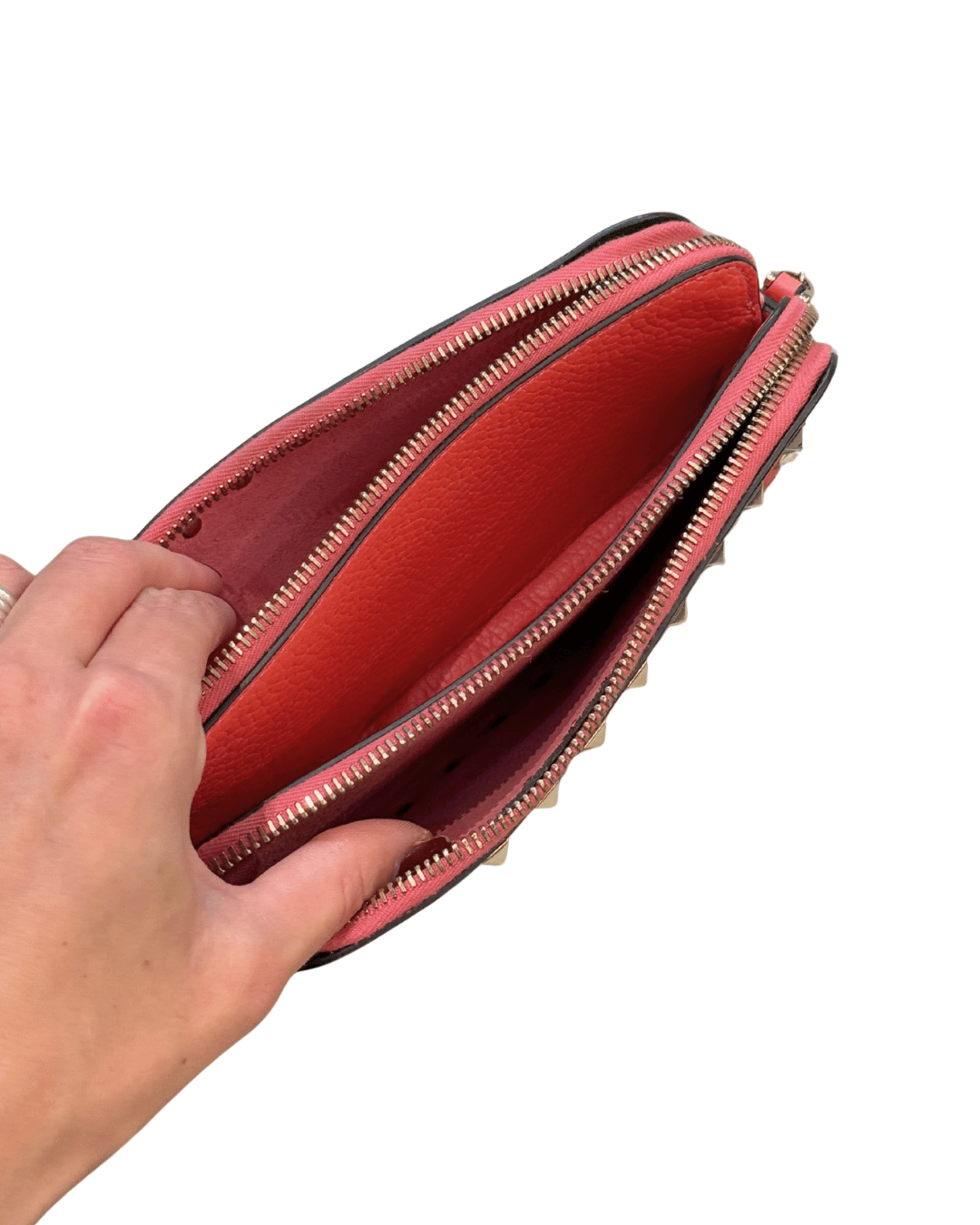 La pochette Rockstud di Valentino Garavani è un accessorio compatto ma di grande carattere. Realizzata in pelle martellata color rosa/salmone, è impreziosita dalle iconiche borchie Rockstud argentate applicate a mano, simbolo del mix perfetto tra eleganza e grinta. Il modello presenta due scomparti con chiusura a zip e interni ben organizzati con tasche porta carte, rendendolo pratico per l’uso quotidiano o per le serate in cui portare con sé solo l’essenziale. Si può indossare comodamente crossbody grazie alla presenza della catenella sottile. Un piccolo gioiello di pelletteria, ideale per aggiungere un tocco audace e sofisticato a ogni look.