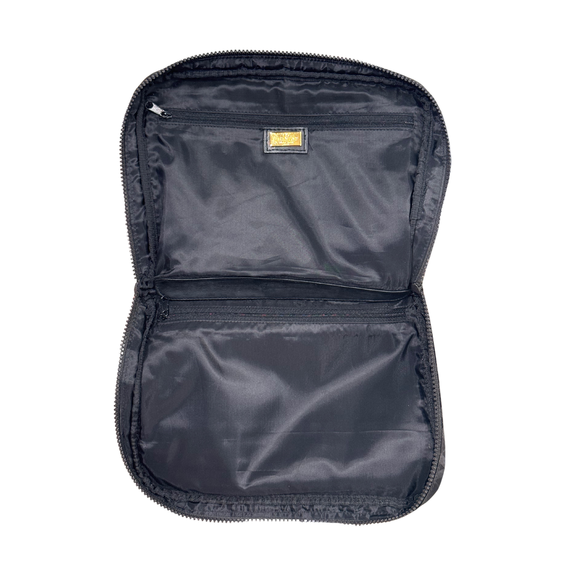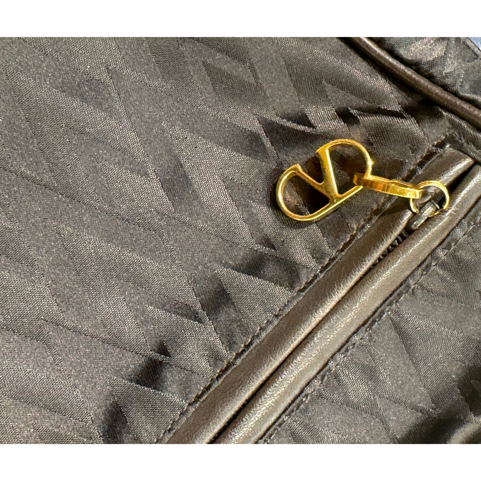 Pochette vintage Valentino realizzate in tessuto tecnico marrone. Tasca frontale esterna con cerniera. APertura superiore con cerniera. Ciondolo V in metallo dorato in corrispondenza dei cursori. Interno in tessuto