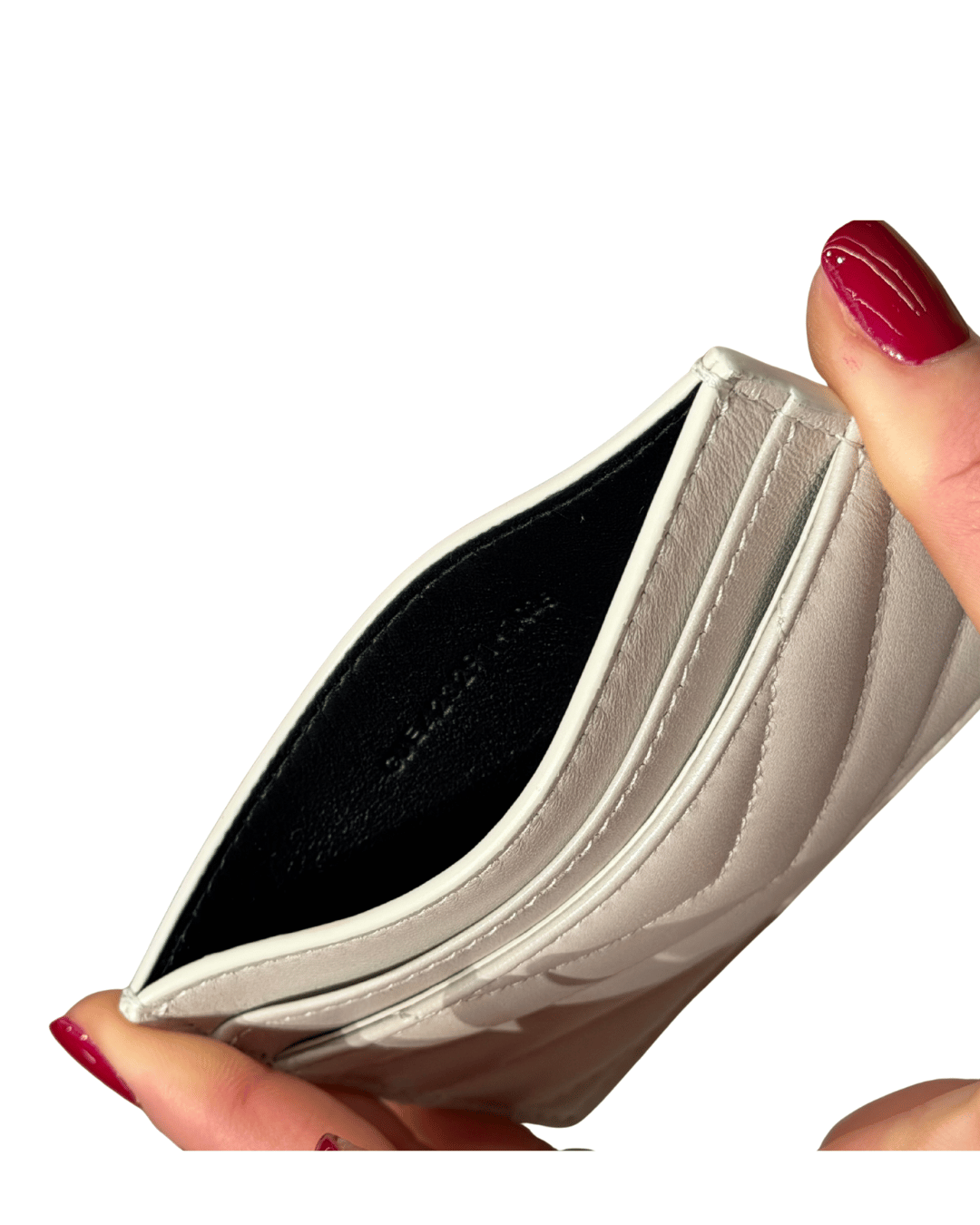 Porta carte Saint Laurent realizzato in morbida pelle liscia color bianco avorio, impreziosito dall’iconica trapuntatura Chevron e dal logo YSL in metallo dorato applicato sul fronte. Compatto ed elegante, è pensato per accompagnare la quotidianità con stile: dispone di più fessure per carte e di una tasca centrale per banconote o ricevute, mantenendo una linea sottile che lo rende perfetto anche per borse mini o tasche.(CODICE: GUE423229 1025)