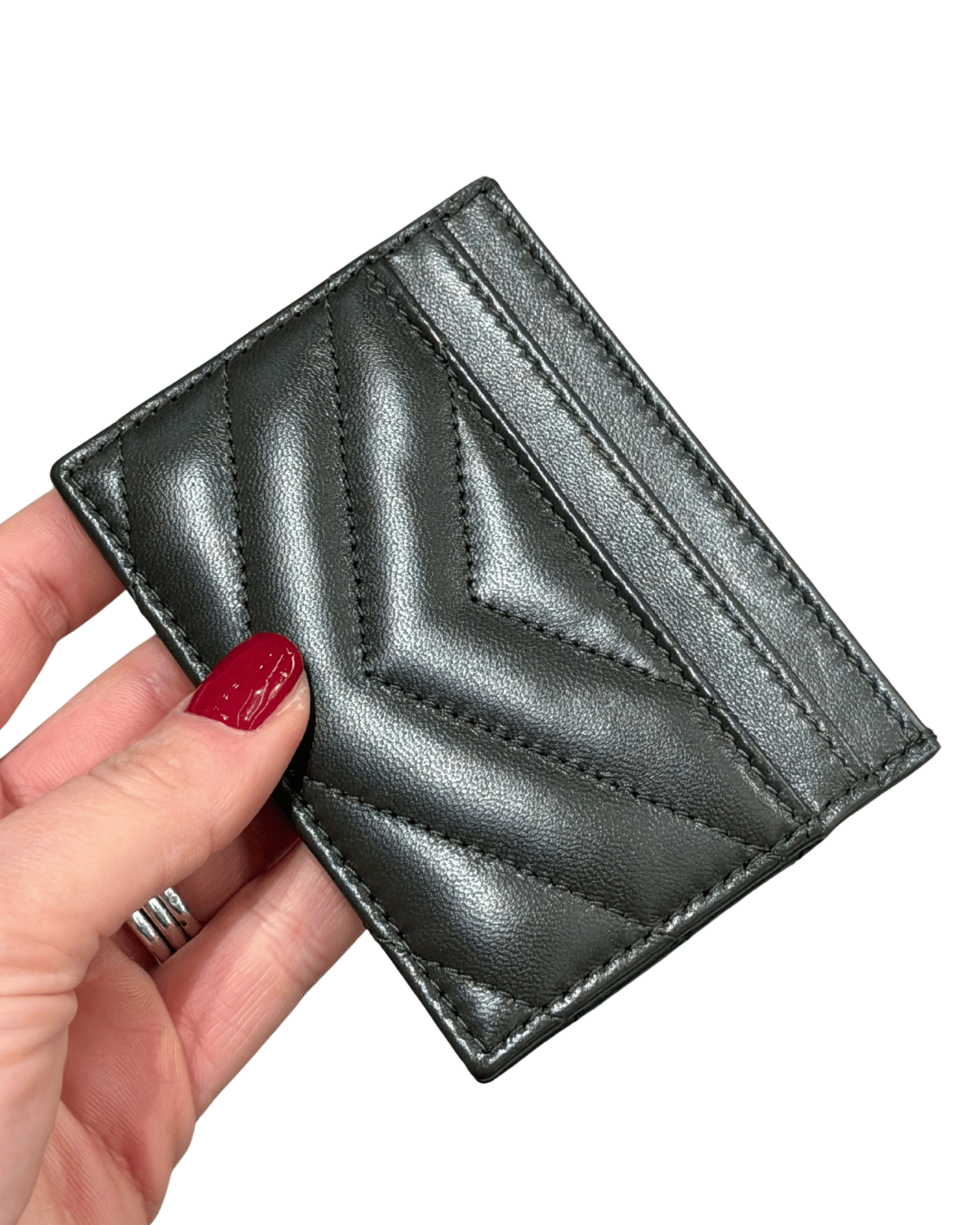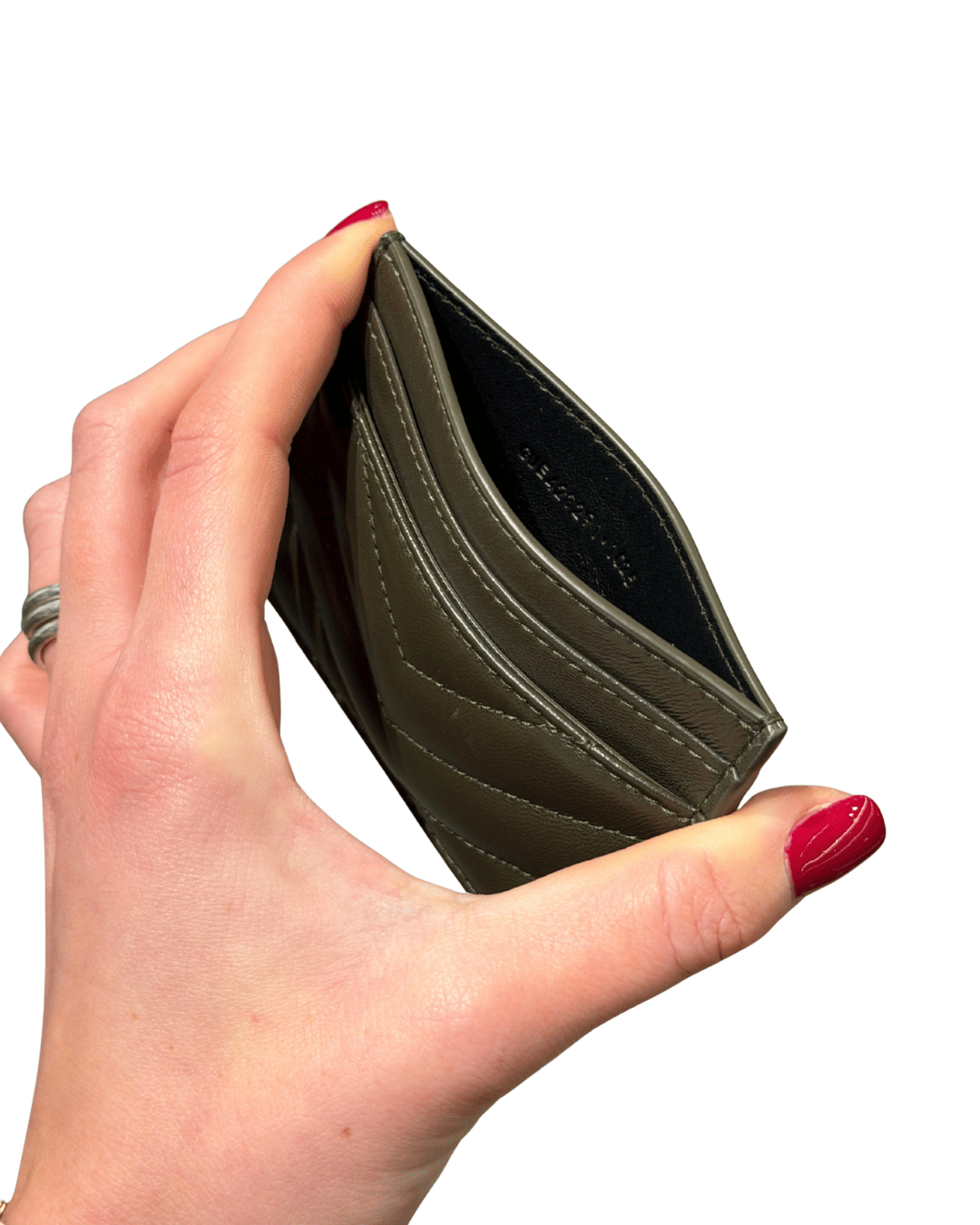 Porta carte Saint Laurent realizzato in morbida pelle liscia color fango/ verde scuro, impreziosito dall’iconica trapuntatura Chevron e dal logo YSL in metallo dorato applicato sul fronte. Compatto ed elegante, è pensato per accompagnare la quotidianità con stile: dispone di più fessure per carte e di una tasca centrale per banconote o ricevute, mantenendo una linea sottile che lo rende perfetto anche per borse mini o tasche.(CODICE: GUE423229 1025)