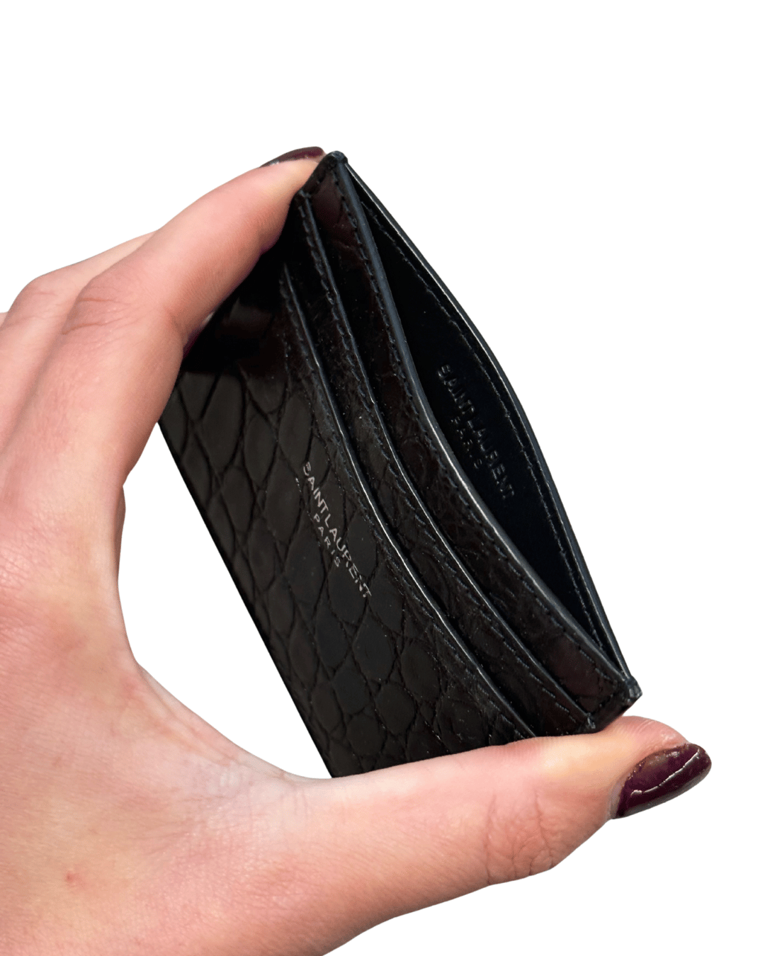 Portacarte Saint Laurent Paris in pelle nera con effetto coccodrillo lucido.