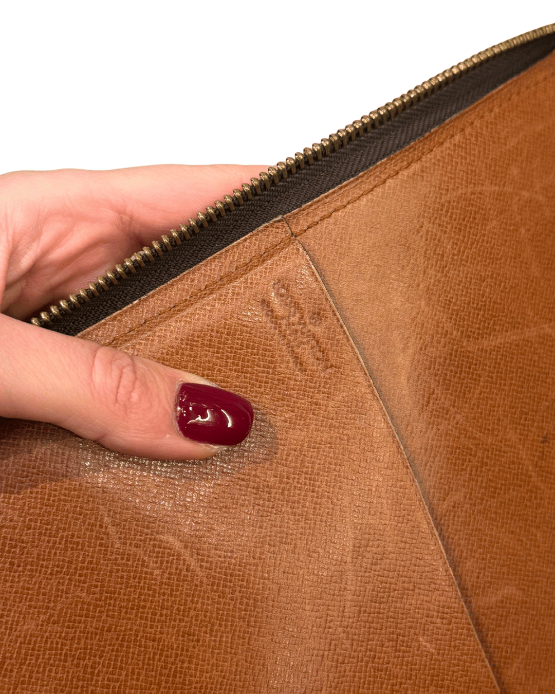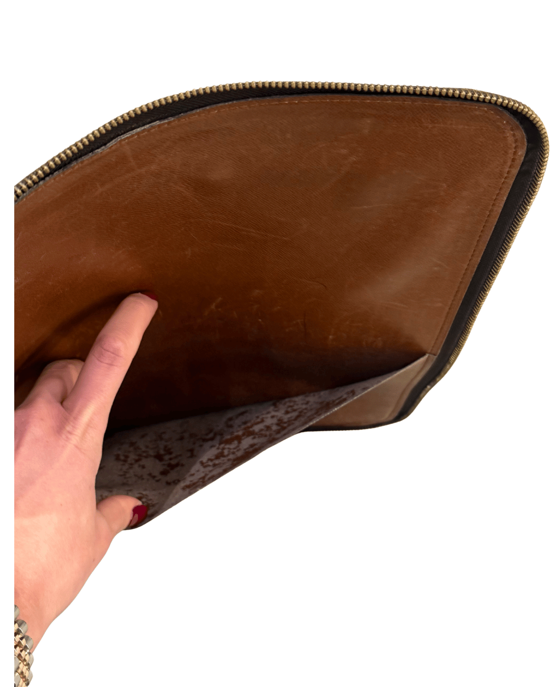 Condizioni: presenta segni del tempo coerenti con l’età vintage: usura visibile sulla pelle interna, segni di utilizzo e patina sul manico, oltre a lievi abrasioni sugli angoli e lungo i profili, come da foto. La tela Monogram risulta ben conservata e la zip scorre correttamente.