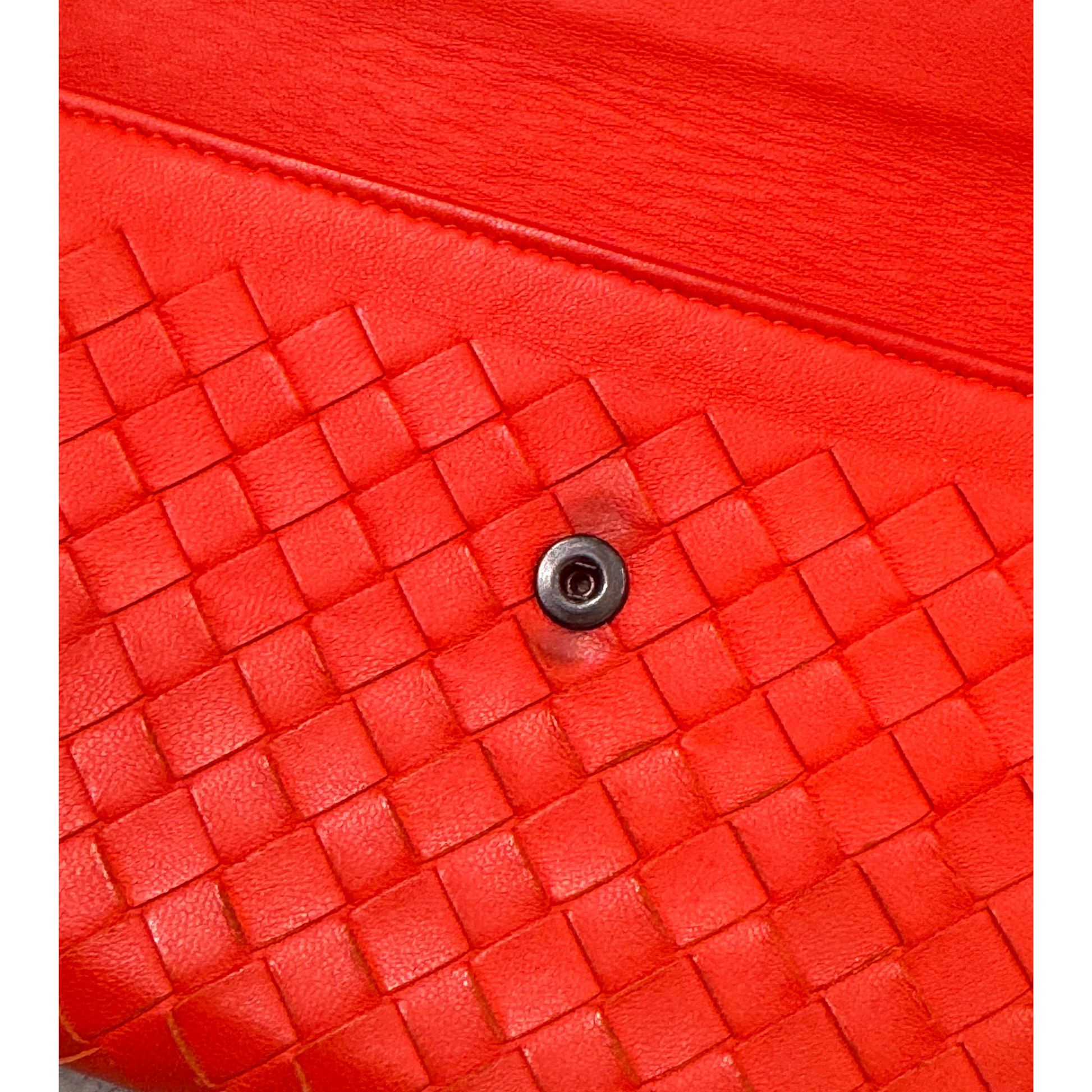 Portafoglio Bottega Veneta realizzato in morbida pelle intrecciata color corallo. Apertura frontale con bottone, all'interno scomparti per card contanti e monete.