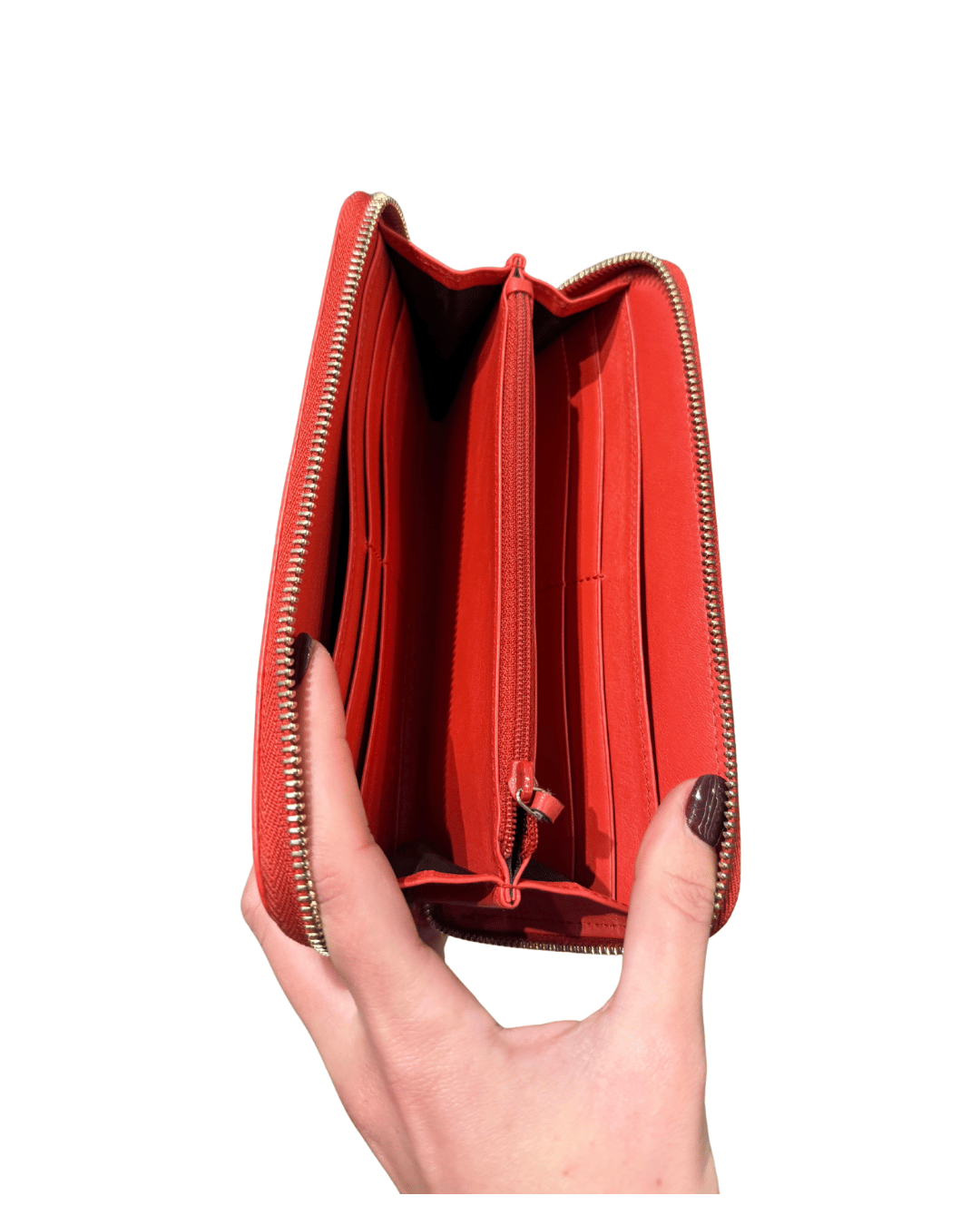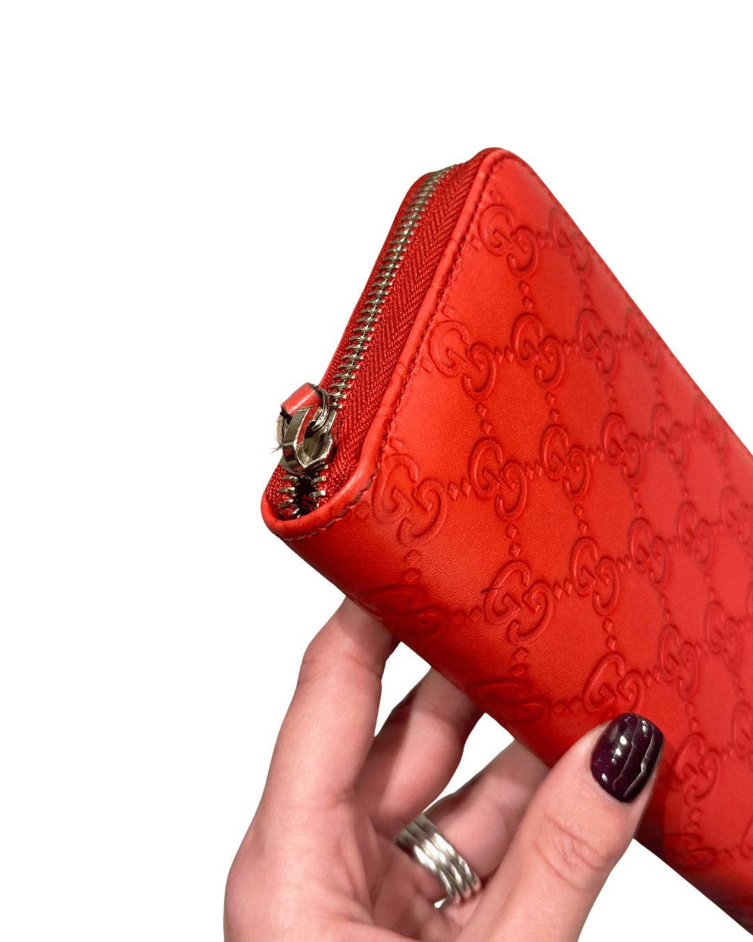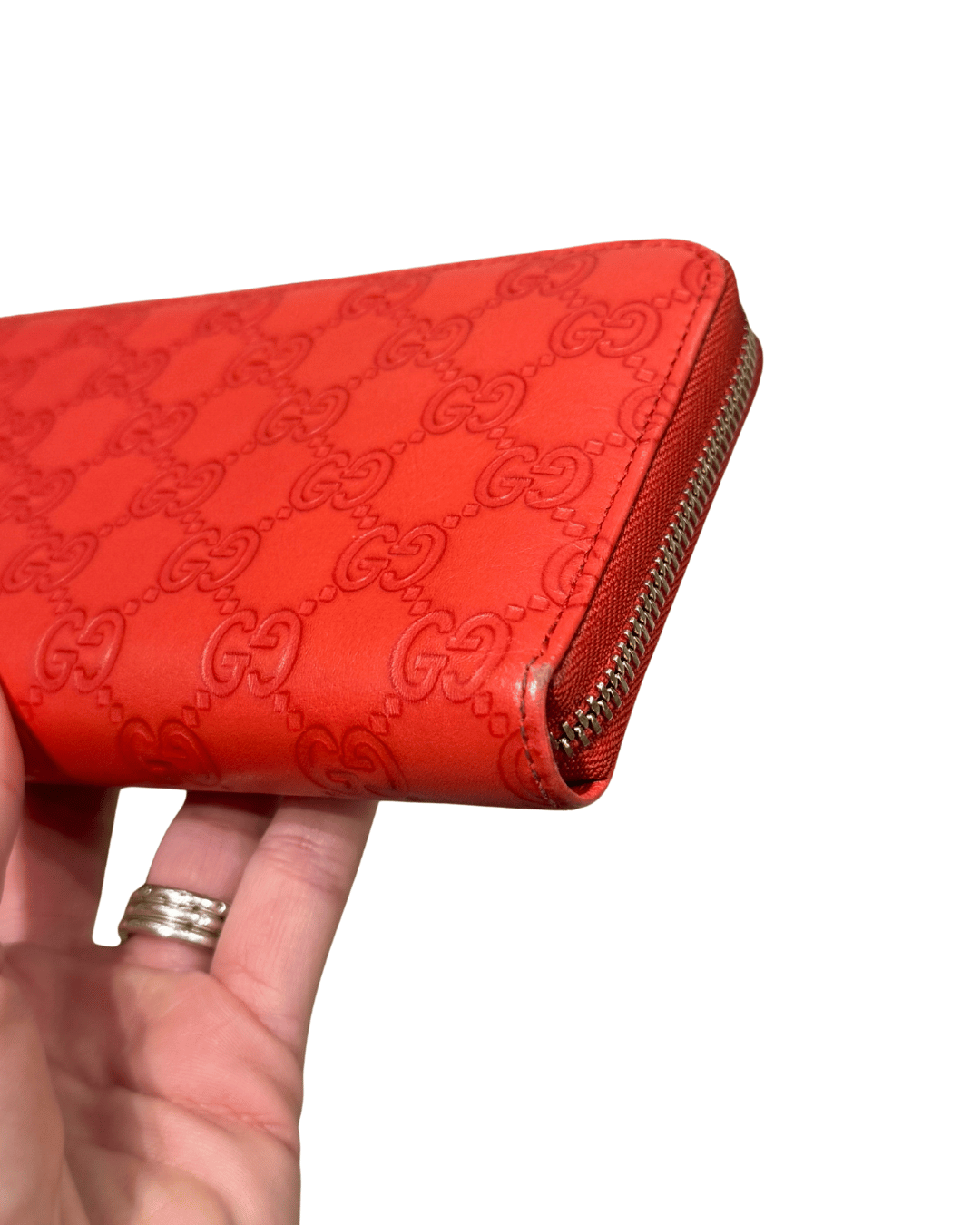 Portafoglio zip-around firmato Gucci, realizzato in pelle color corallo con iconico motivo GG embossato su tutta la superficie. L’interno, perfettamente organizzato, offre numerosi scomparti per carte, banconote e una tasca centrale con zip per le monete. La zip dorata con tiralampo in pelle e la silhouette elegante lo rendono un accessorio raffinato e senza tempo.