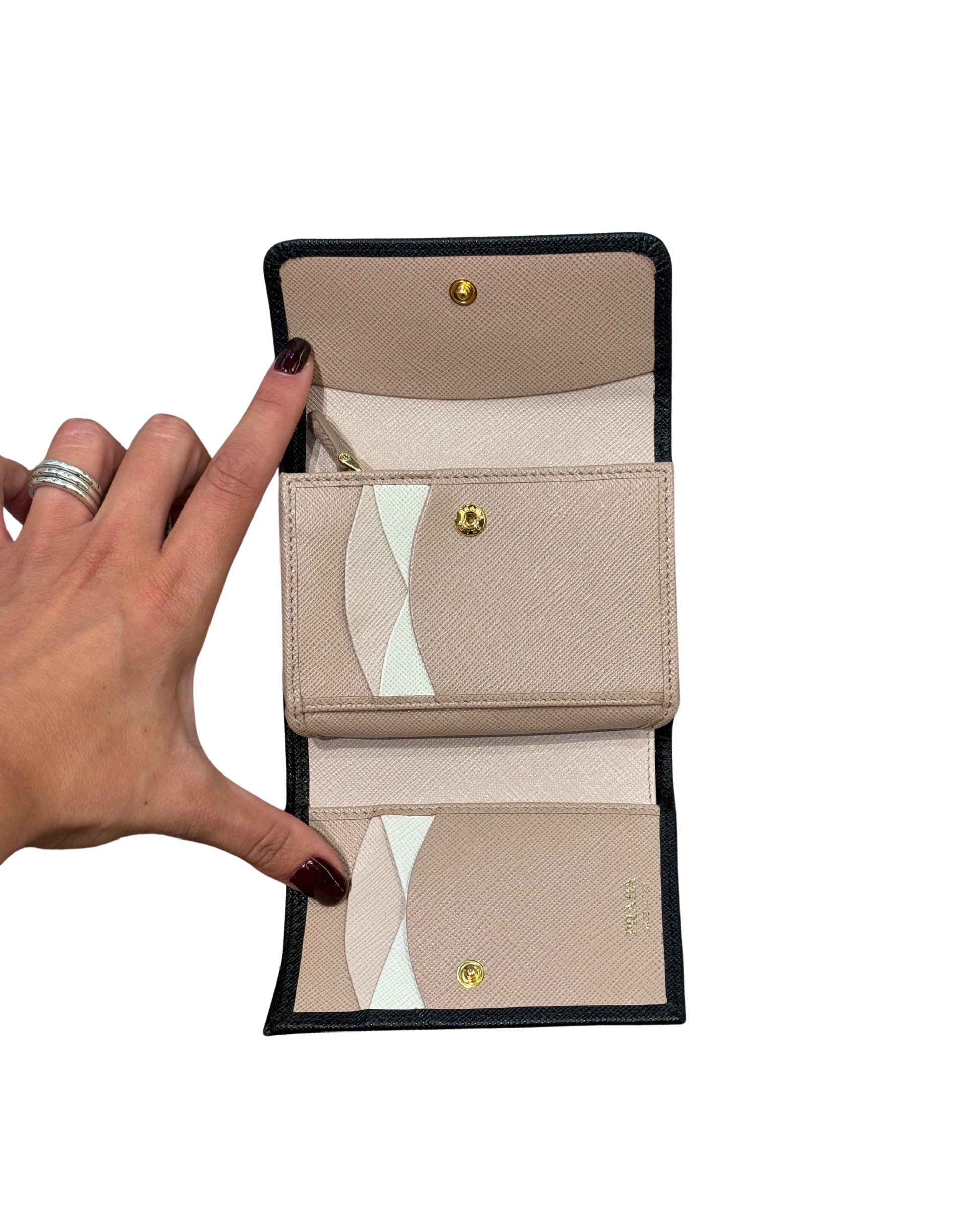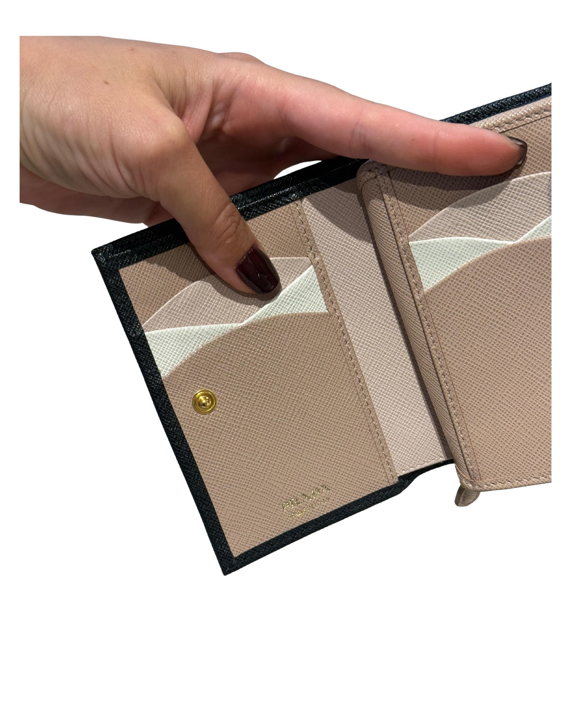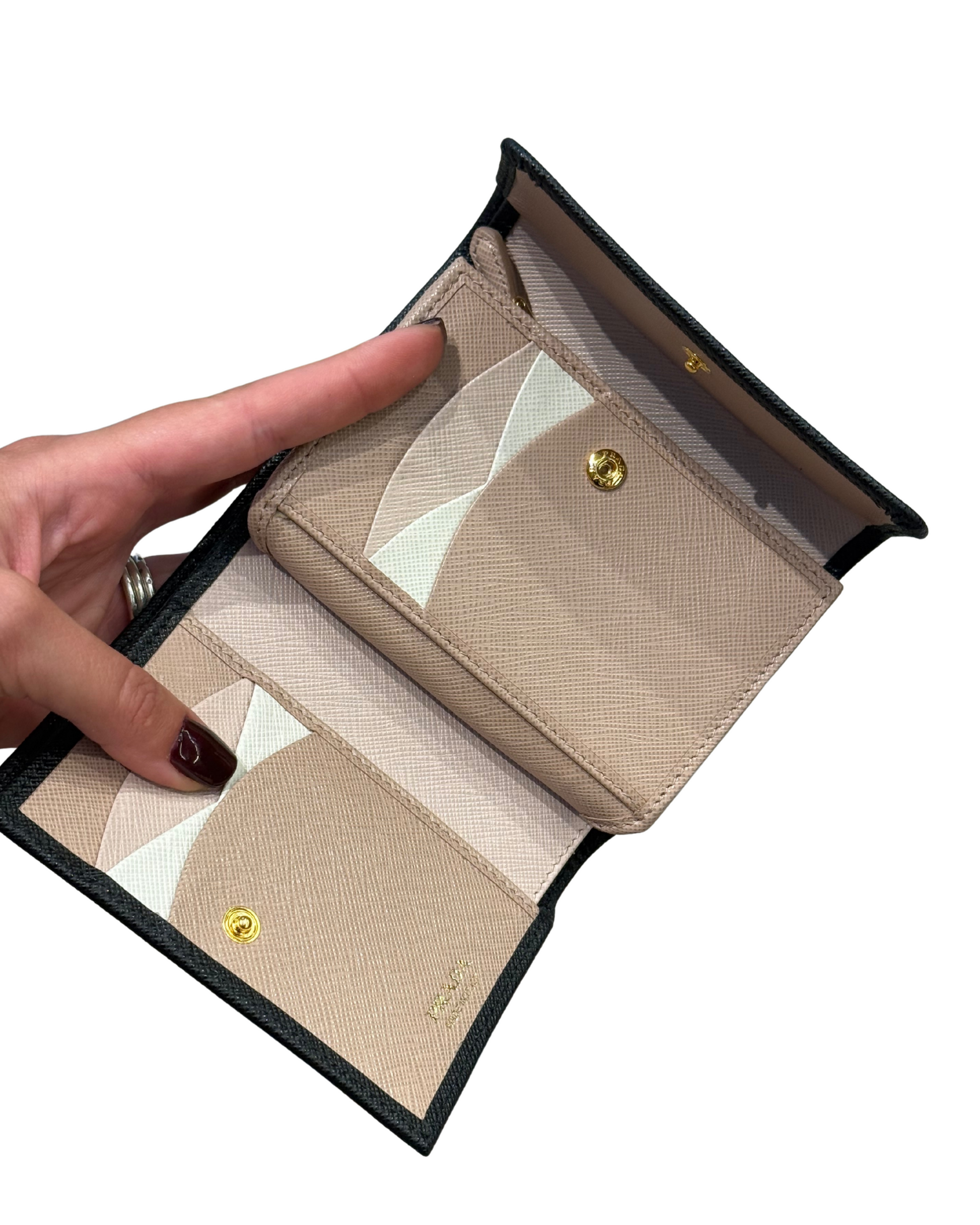 Portafoglio compatto Prada realizzato in pelle saffiano nera, presenta il logo Prada Milano in metallo dorato sulla patta frontale. L'interno, in pelle tricolore sui tono neutri, offre scomparti per card, tasca portamonete con zip , scomparto per banconote e due tasche piatte aggiuntive. La chiusura a bottone a pressiamo garantisce sicurezza e professionalità. Dimensioni compatte ideali per borse di piccole dimensioni.