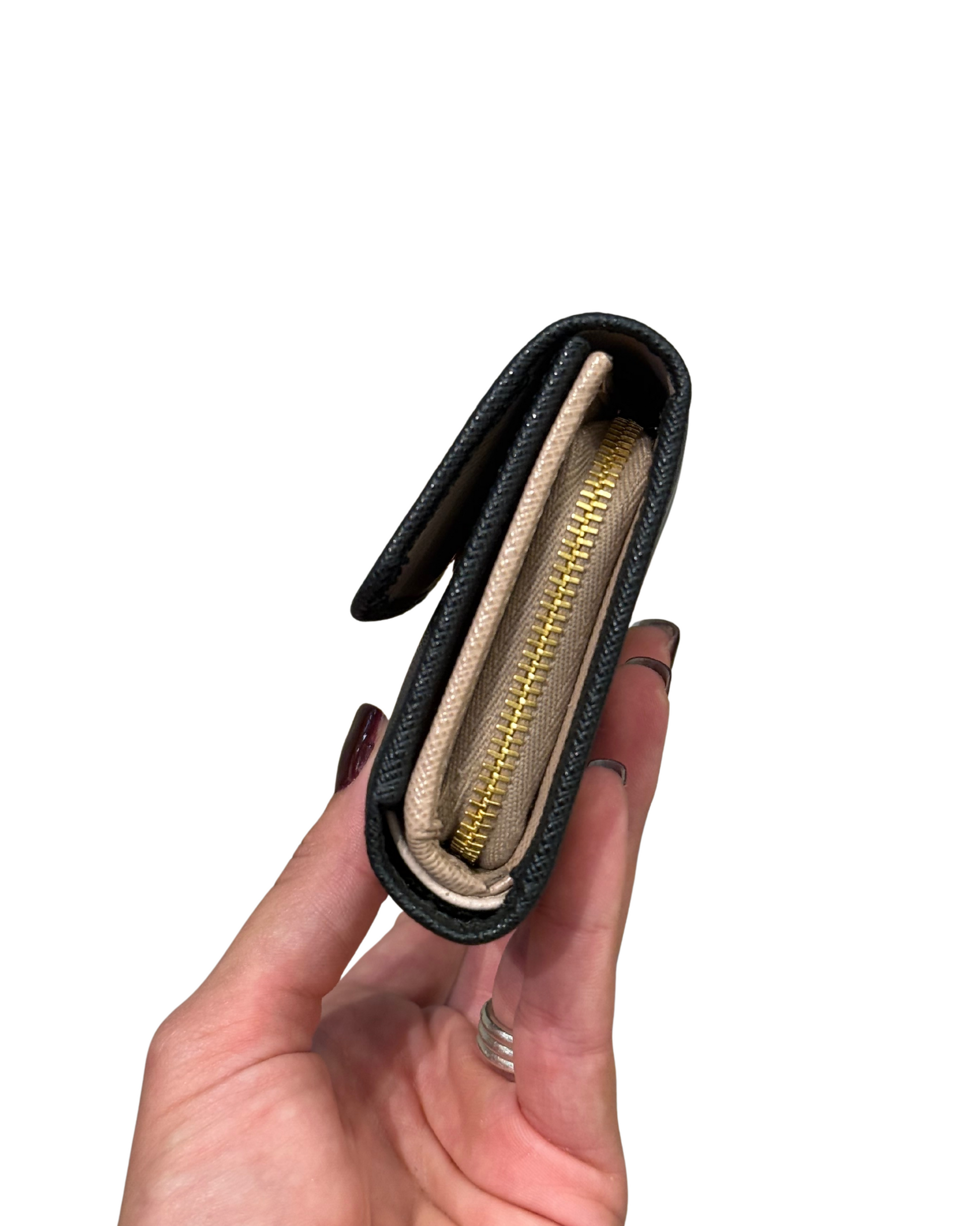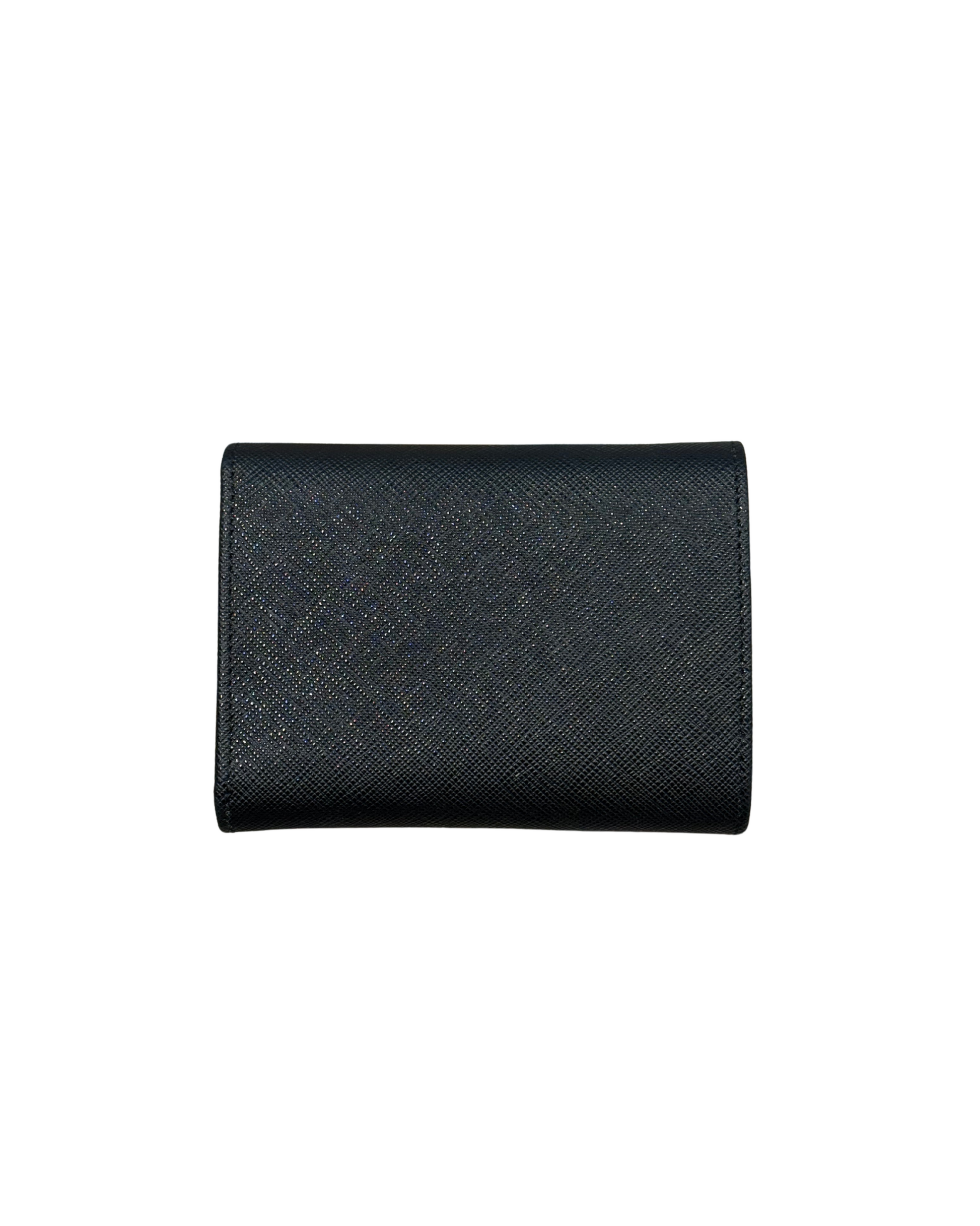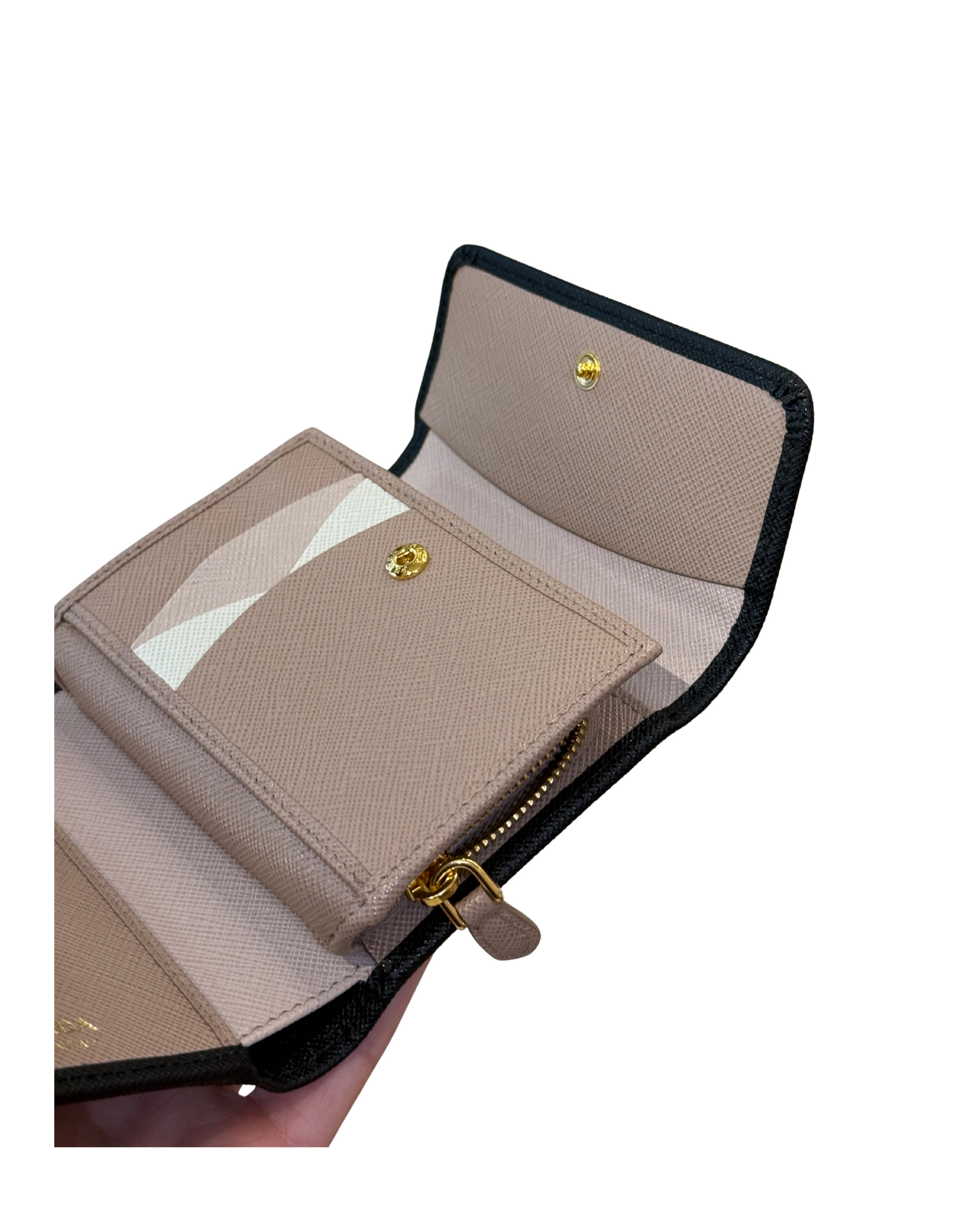 Portafoglio compatto Prada realizzato in pelle saffiano nera, presenta il logo Prada Milano in metallo dorato sulla patta frontale. L'interno, in pelle tricolore sui tono neutri, offre scomparti per card, tasca portamonete con zip , scomparto per banconote e due tasche piatte aggiuntive. La chiusura a bottone a pressiamo garantisce sicurezza e professionalità. Dimensioni compatte ideali per borse di piccole dimensioni.