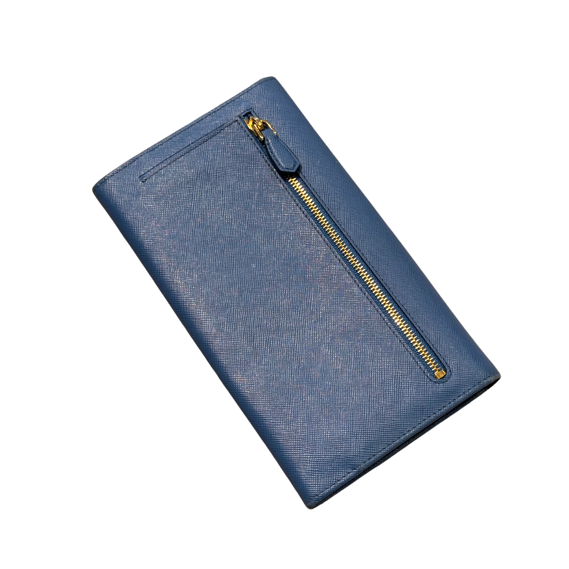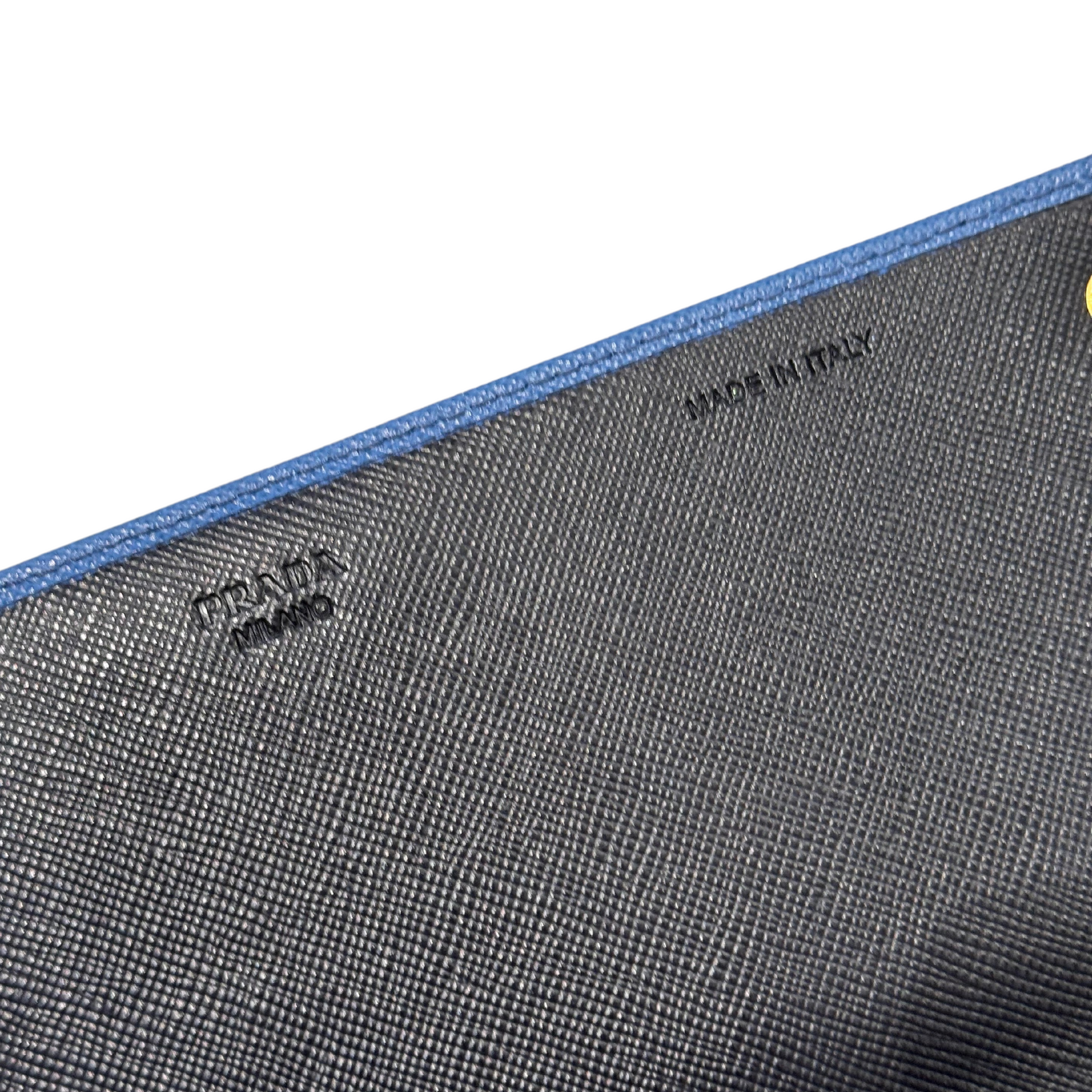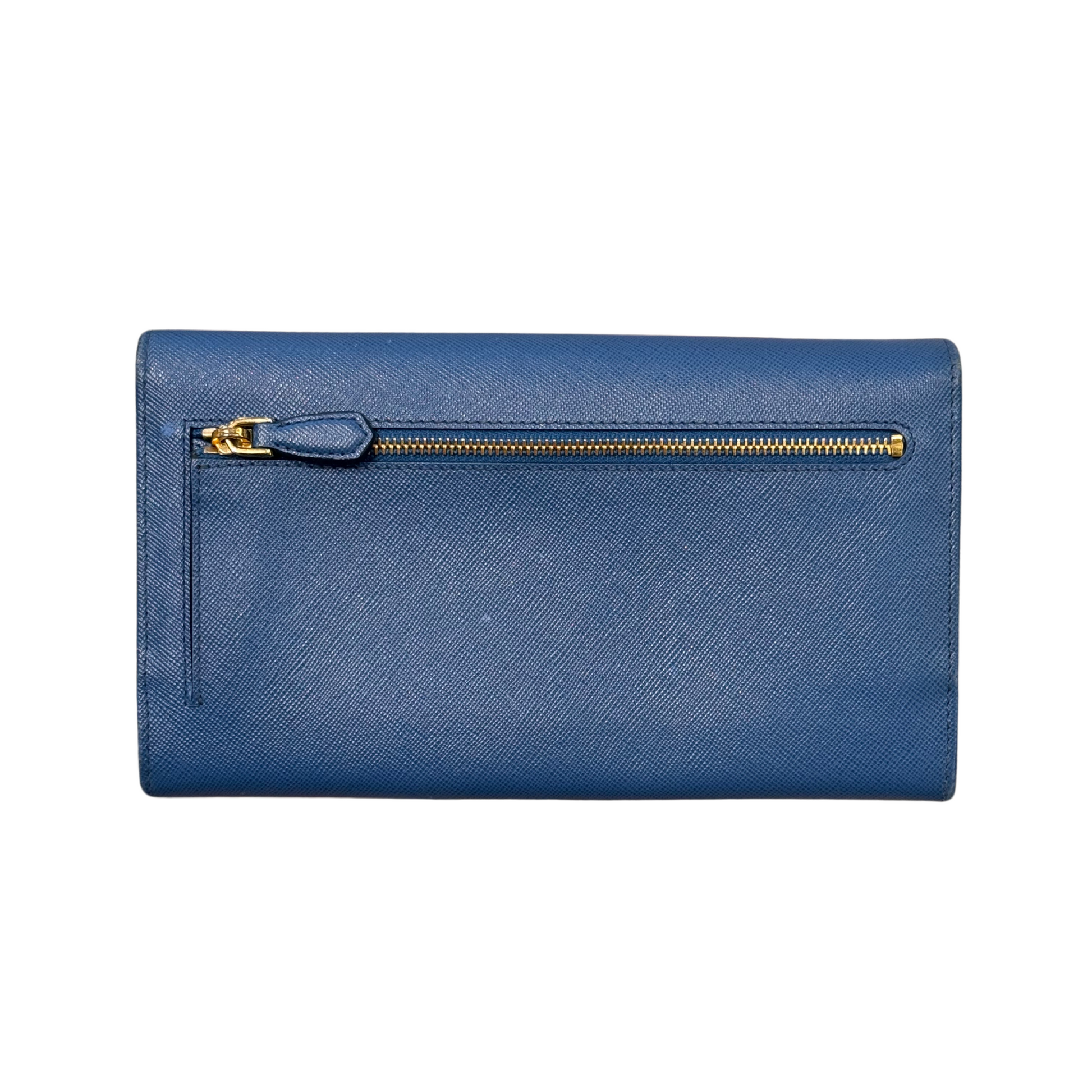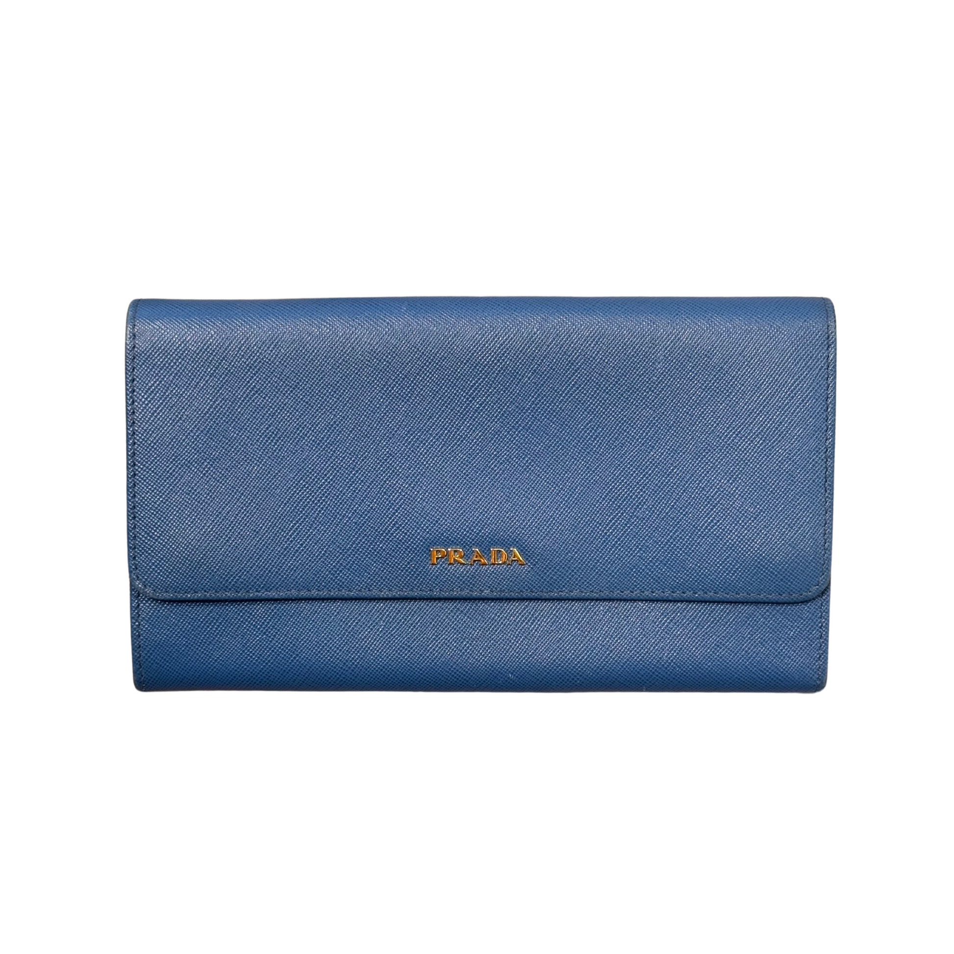 Portafoglio di Prada in pelle saffiano azzurra, logo lettering frontale. Tasca esterna posteriore con cerniera. Apertura frontale con bottoni. Metalleria dorata. Interno in pelle , scomparti per card, contanti e monete. Le dimensioni permettono di inserire all'interno anche il cellulare, così da indossarlo anche come pochette. ( la luce non rende bene il colore, richiedere ulteriori foto o video)