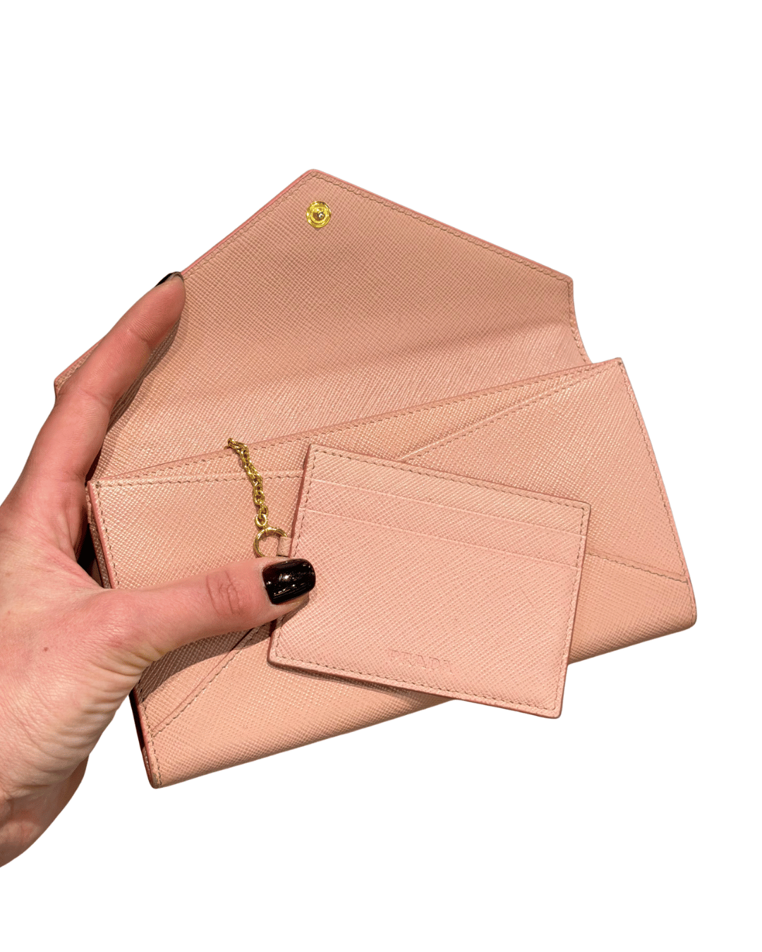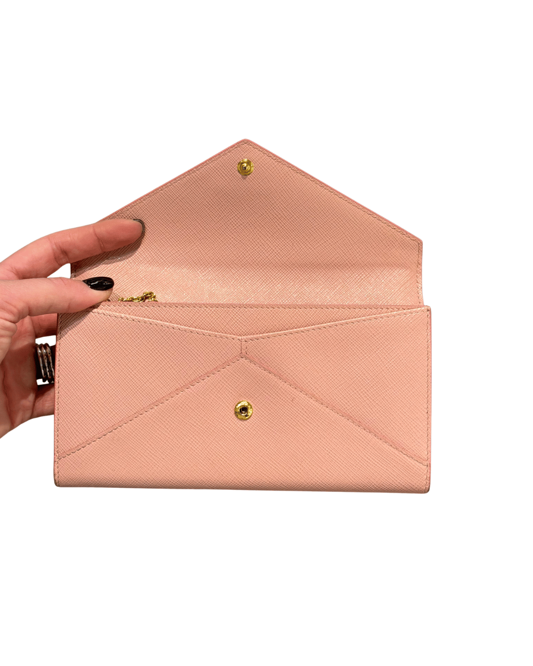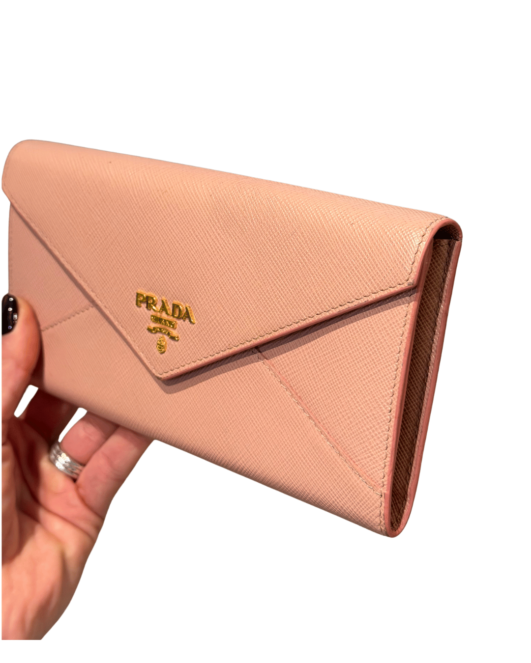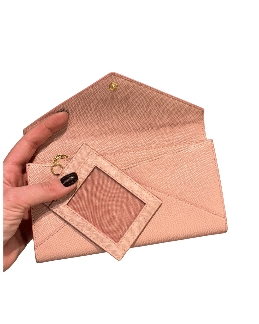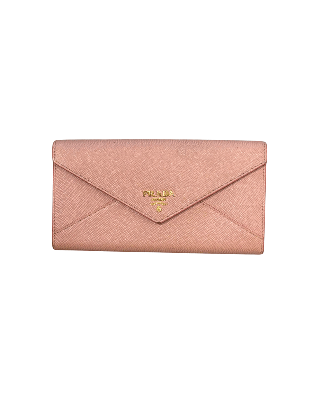 Portafoglio Prada in pelle Saffiano rosa, un modello elegante e femminile con classica chiusura a patta e logo PRADA Milano dorato frontale. Il design a busta lo rende raffinato e pratico allo stesso tempo, perfetto per essere portato in borsa o anche da solo come pochette. Interno organizzato con scomparti per banconote, tasca con zip per monete, numerosi slot per carte e comodo portatessere removibile coordinato.