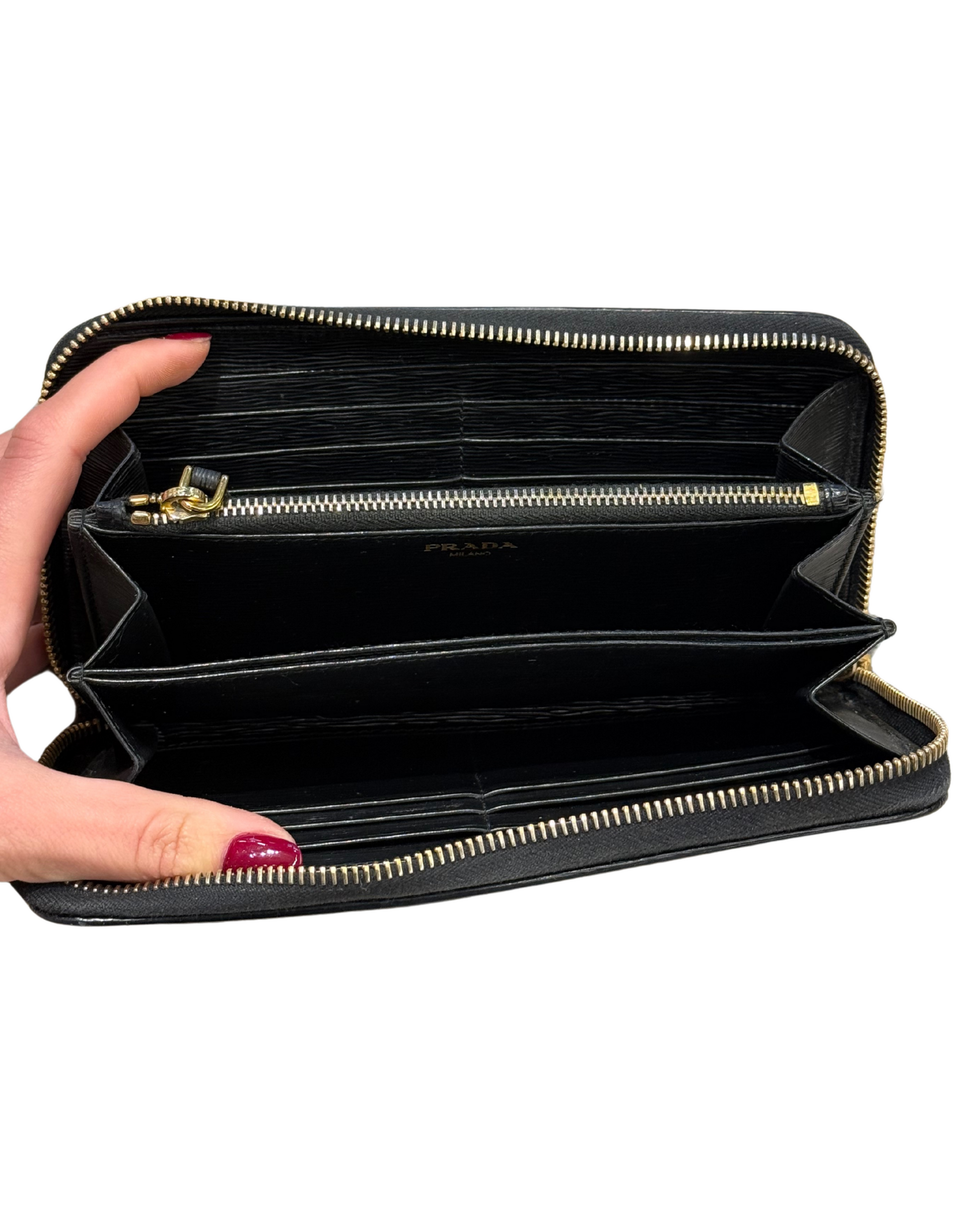 Portafoglio di Prada nero realizzato in tessuto tecnico con rifiniture in pelle nera. Logo lettering frontale. Apertura con cerniera. All'interno scomparti per card , contanti e monete.