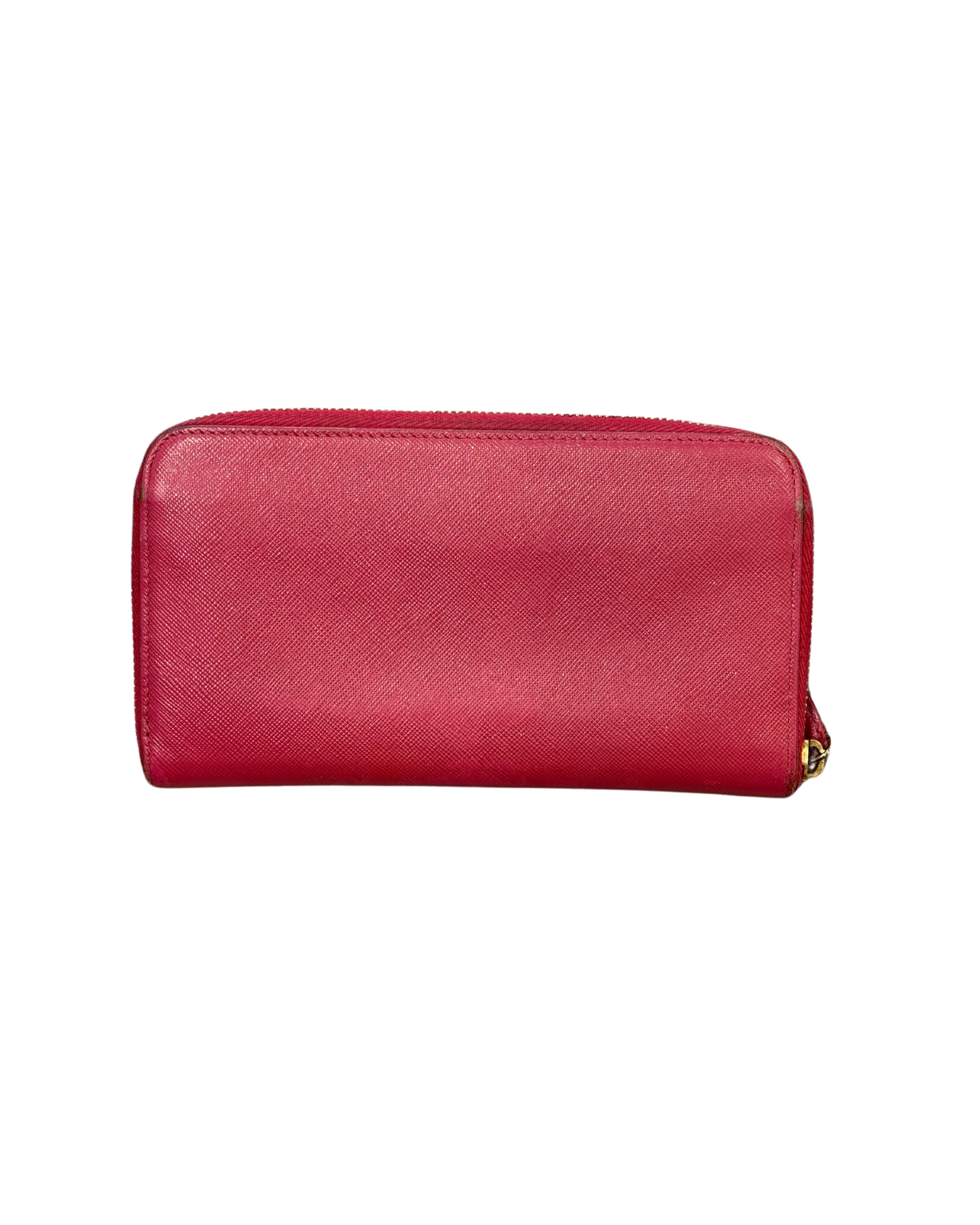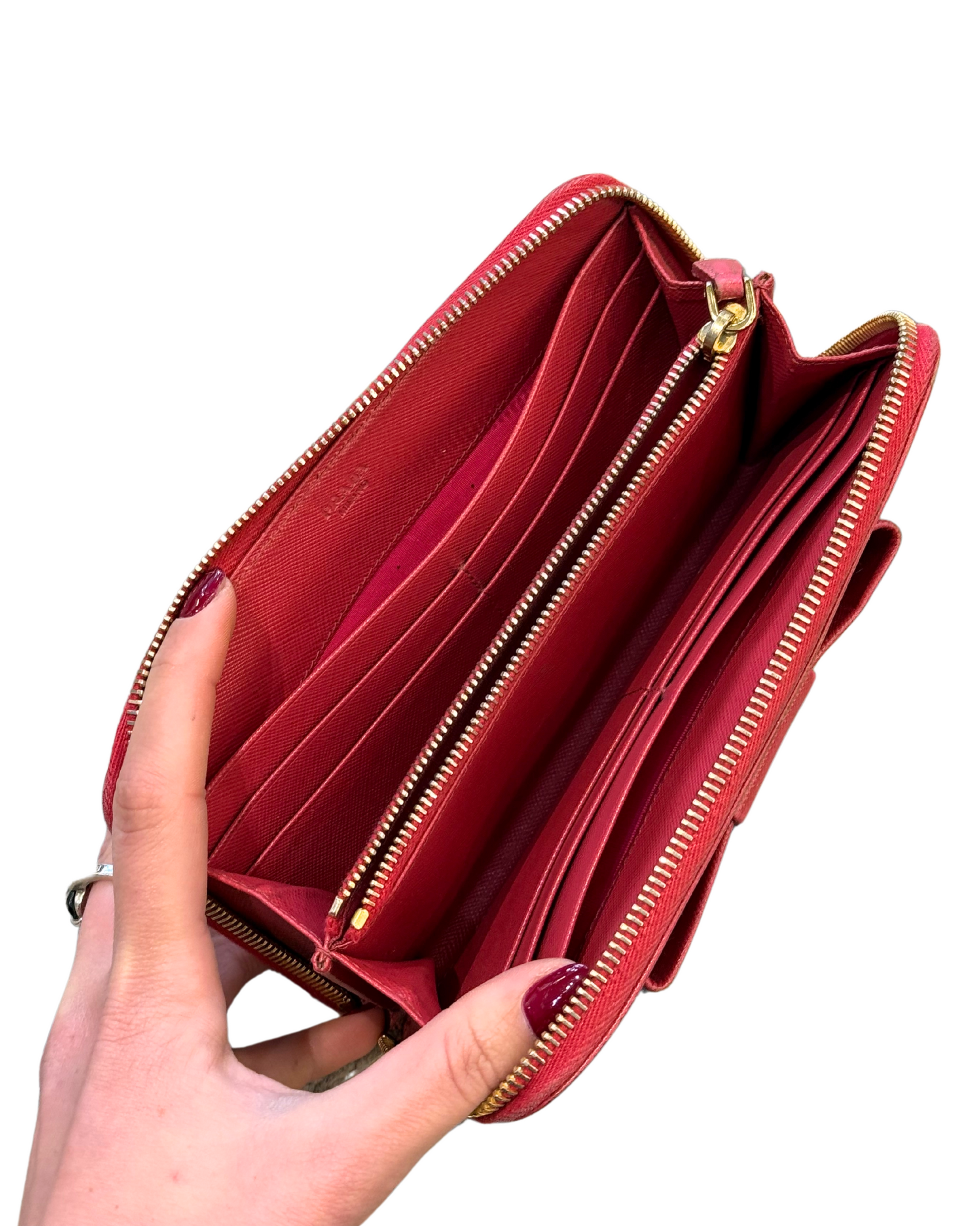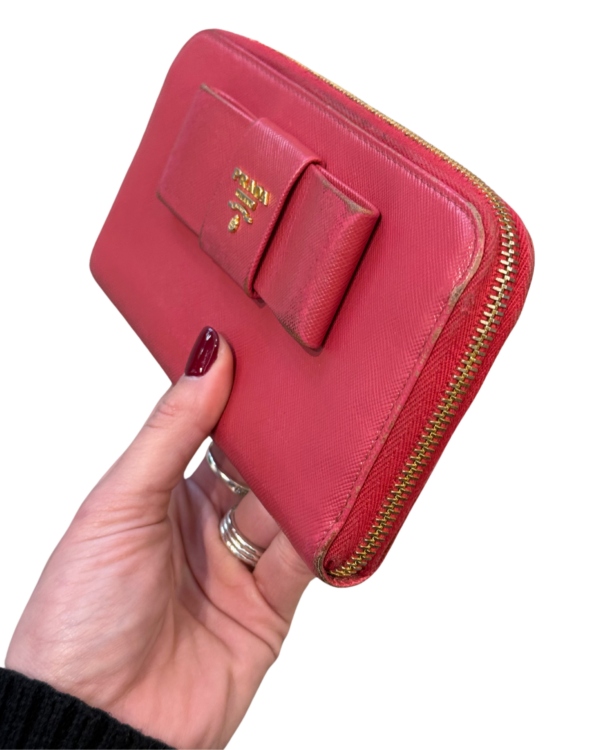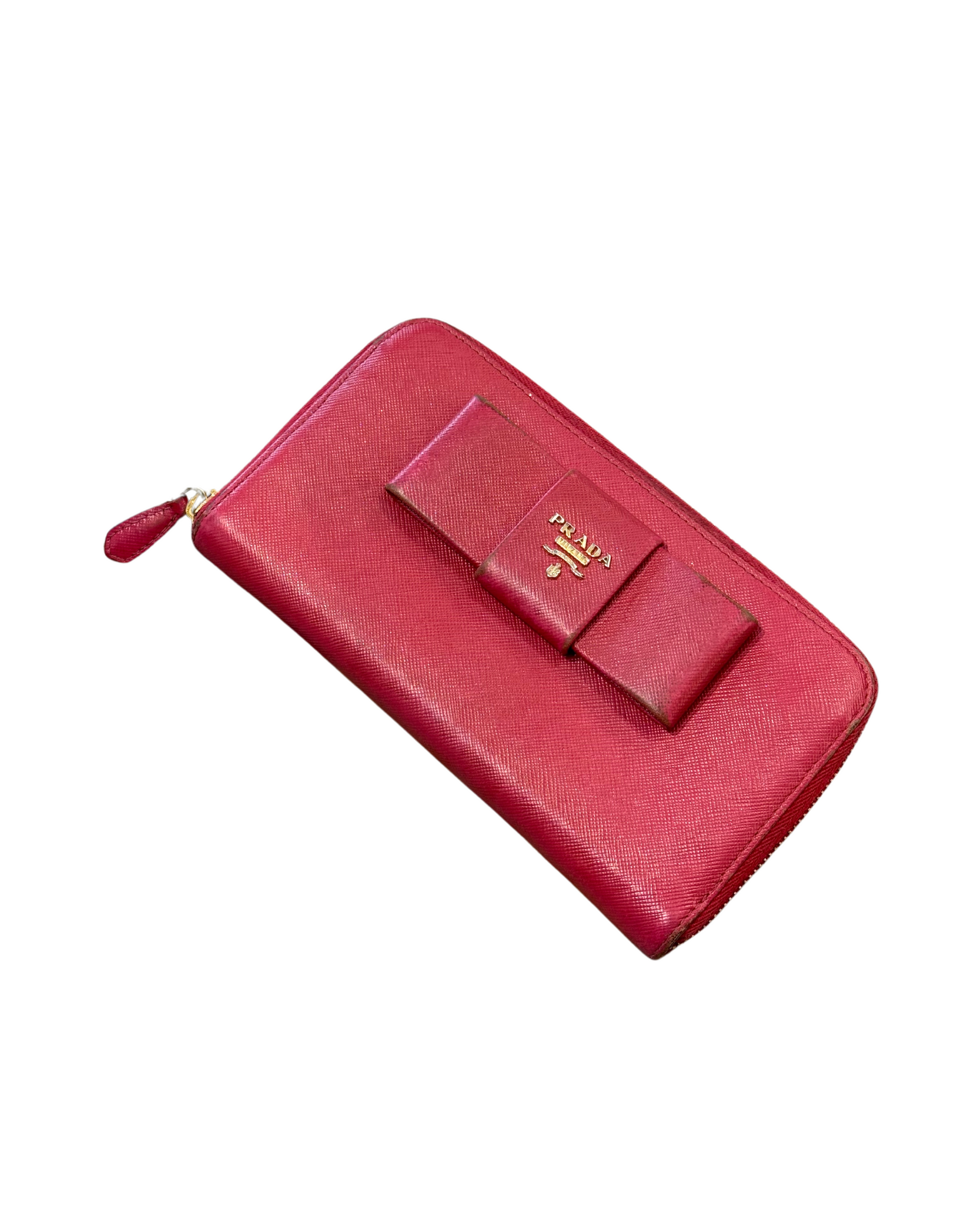 Portafoglio di Prada realizzato in tela saffiano rosa , impreziosito frontalmente da fiocco. Apertura con cerniera. Scomparti interni per card, contanti e monete.