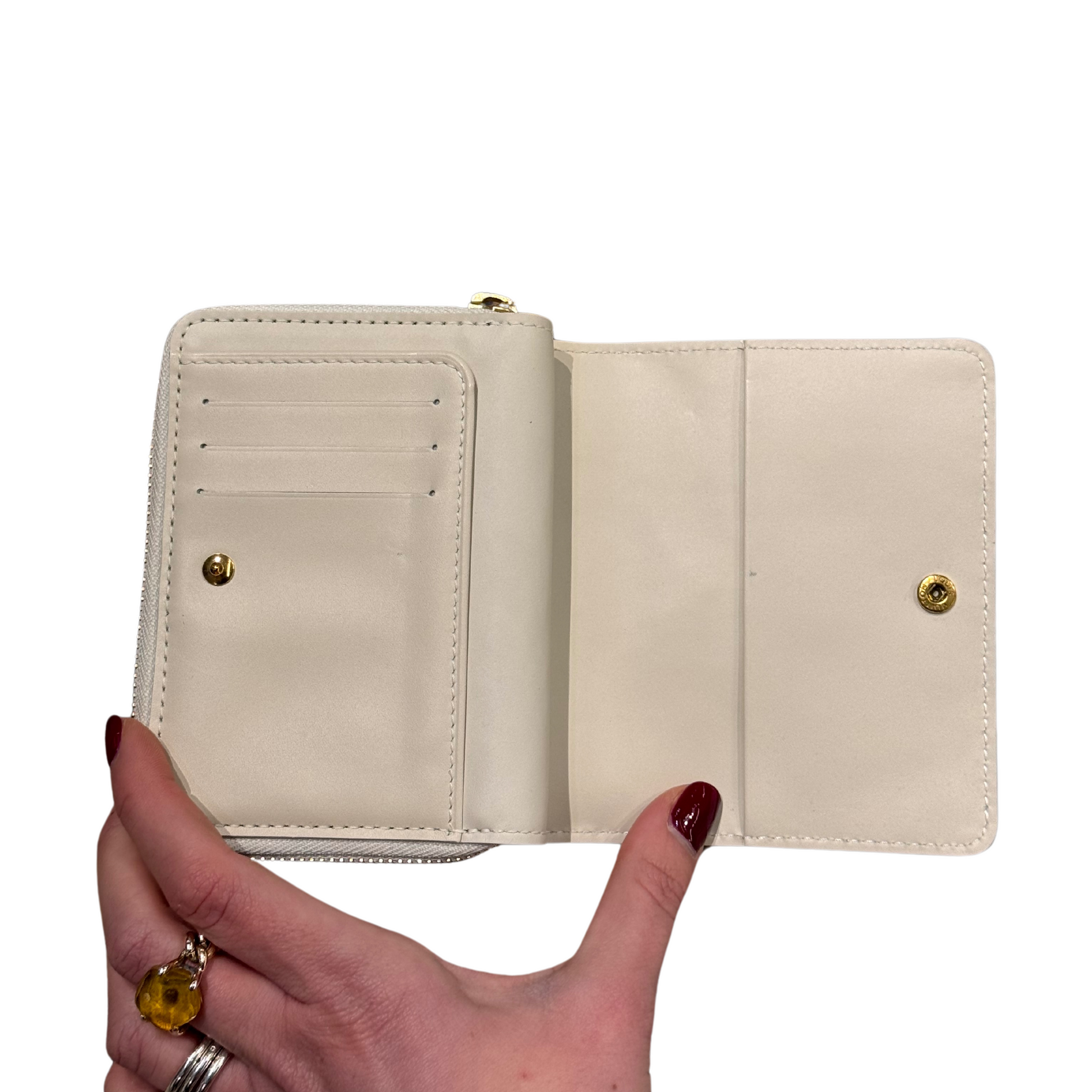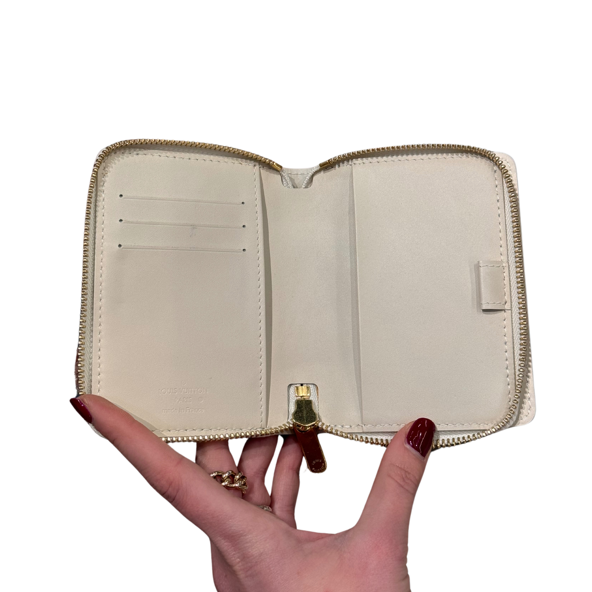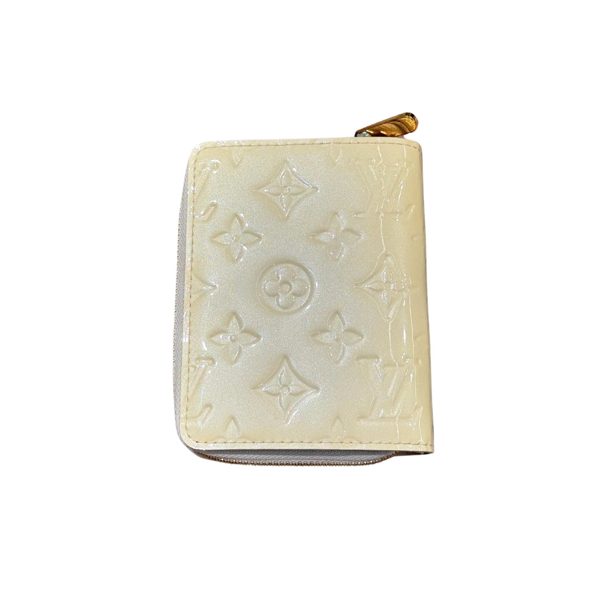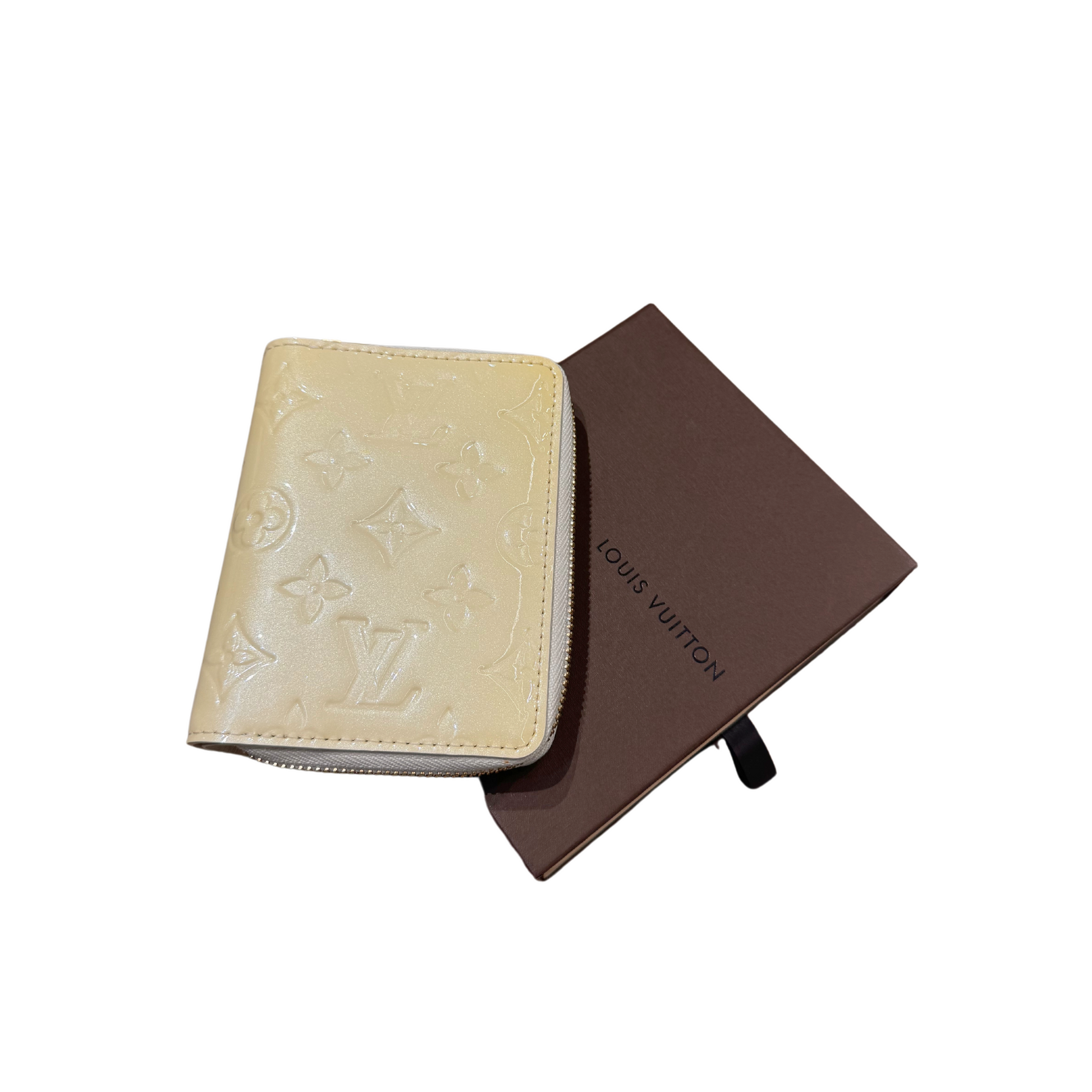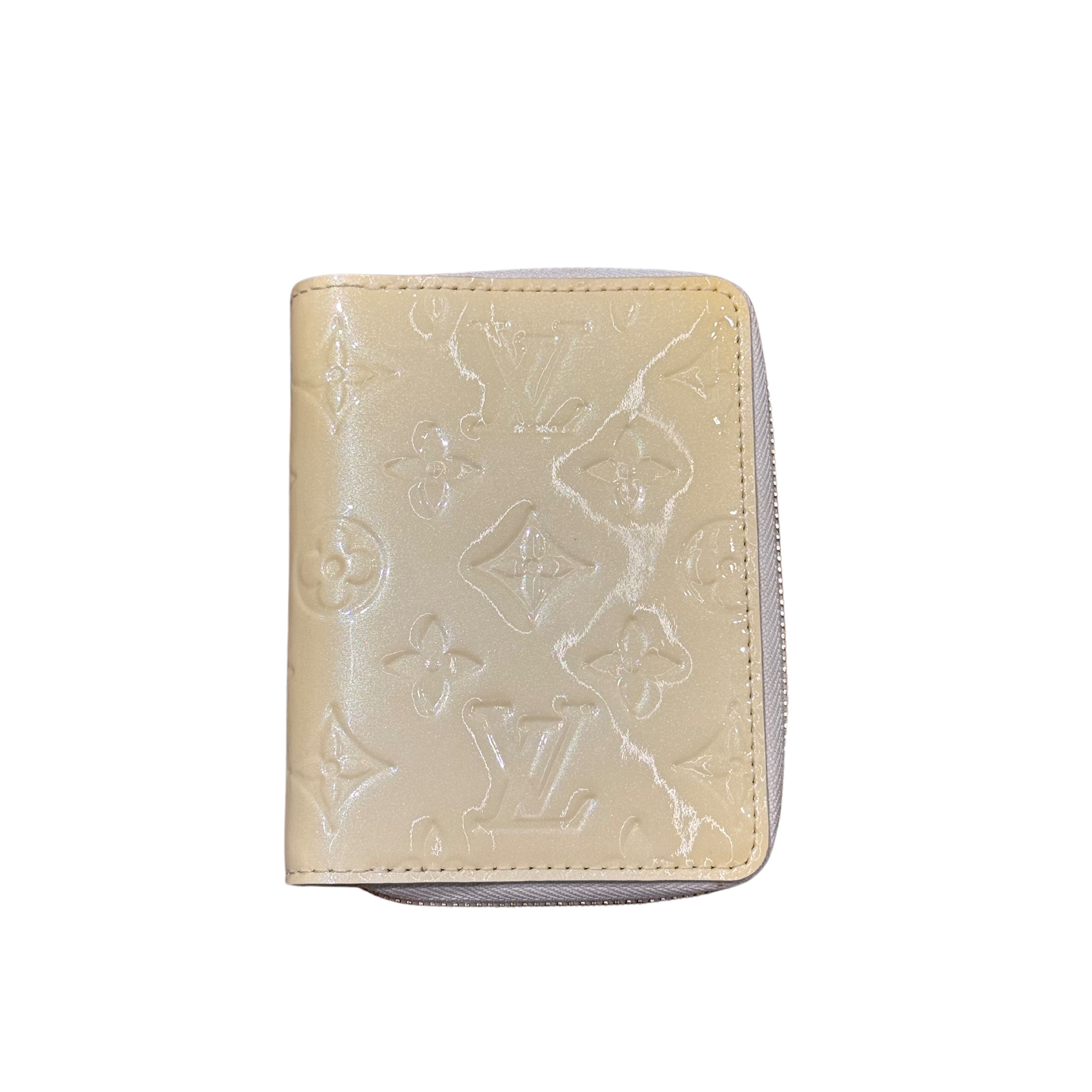 Portafoglio LOUIS VUITTON realizzato in pelle verniciata color burro con monogrm impresso. Suddiviso in due scomparti principali, uno apertura con bottone e all'interno fessure per card e l'altro con cerniera con altre fessure. Metalleria dorata. Il colore è burro con piccole sfumature tendenti al giallo tenue.