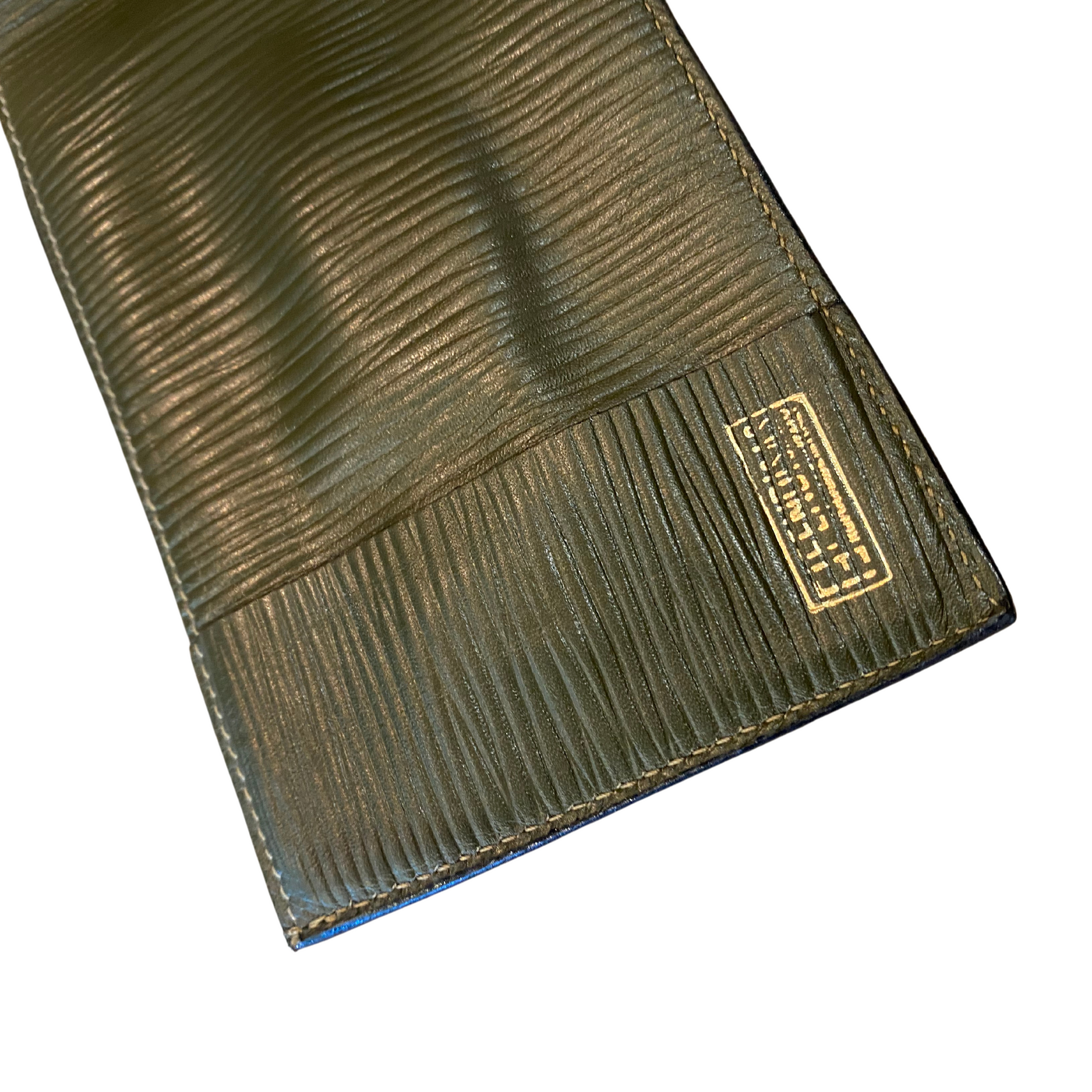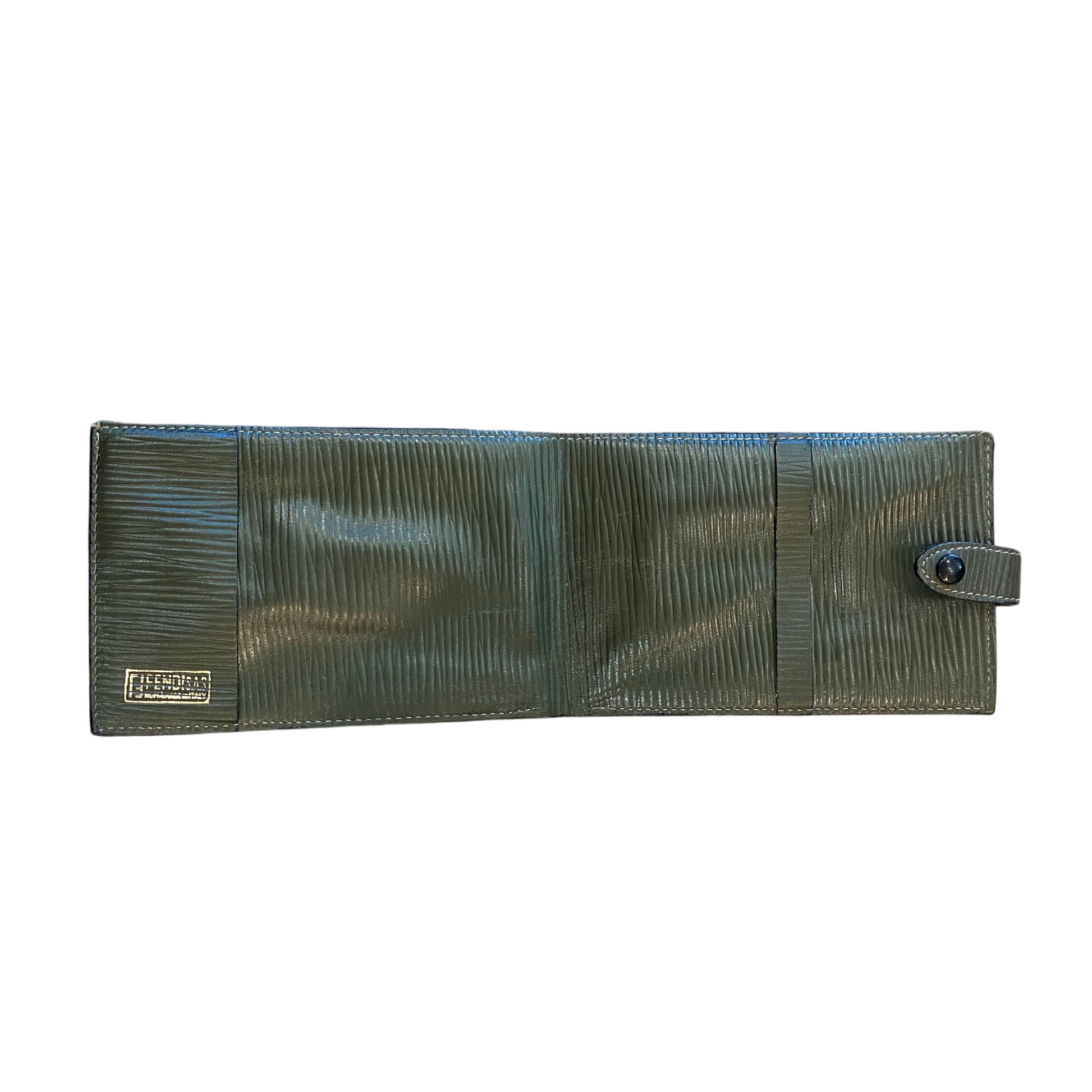 Portassegni vintage Fendi. Corpo in tela monogram verde oliva e rifiniture in pelle del medesimo colore. Apertura con bottoncino. Interno in pelle, possibilità di inserirci assegni e anche contanti essendo dotato di porta banconote.