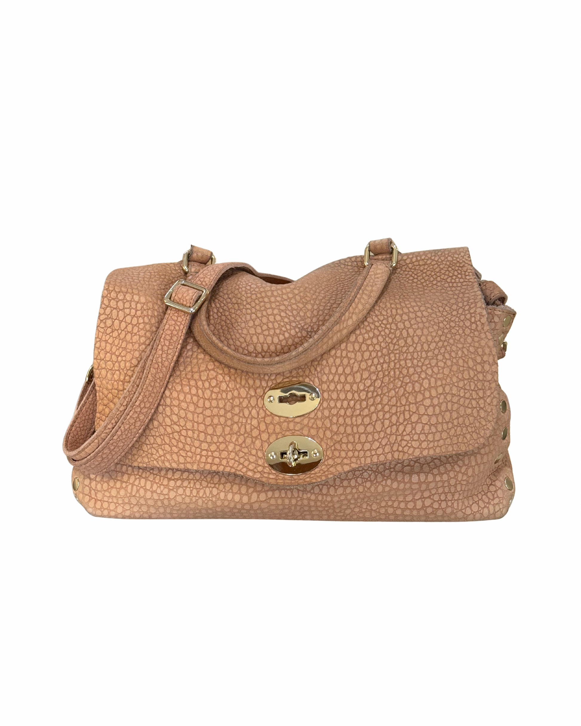 Elegante e raffinata Postina di Zanellato, realizzata in suede con particolare lavorazione effetto rettile che la rende unica e sofisticata. Arricchita da dettagli in metallo dorato, presenta la classica chiusura a girello frontale con doppie fibbie, iconica del modello. Dotata di manico singolo e tracolla regolabile/amovibile, può essere indossata a mano, a spalla o crossbody. L’interno è ampio e foderato in tessuto, con tasca con zip per la massima praticità.