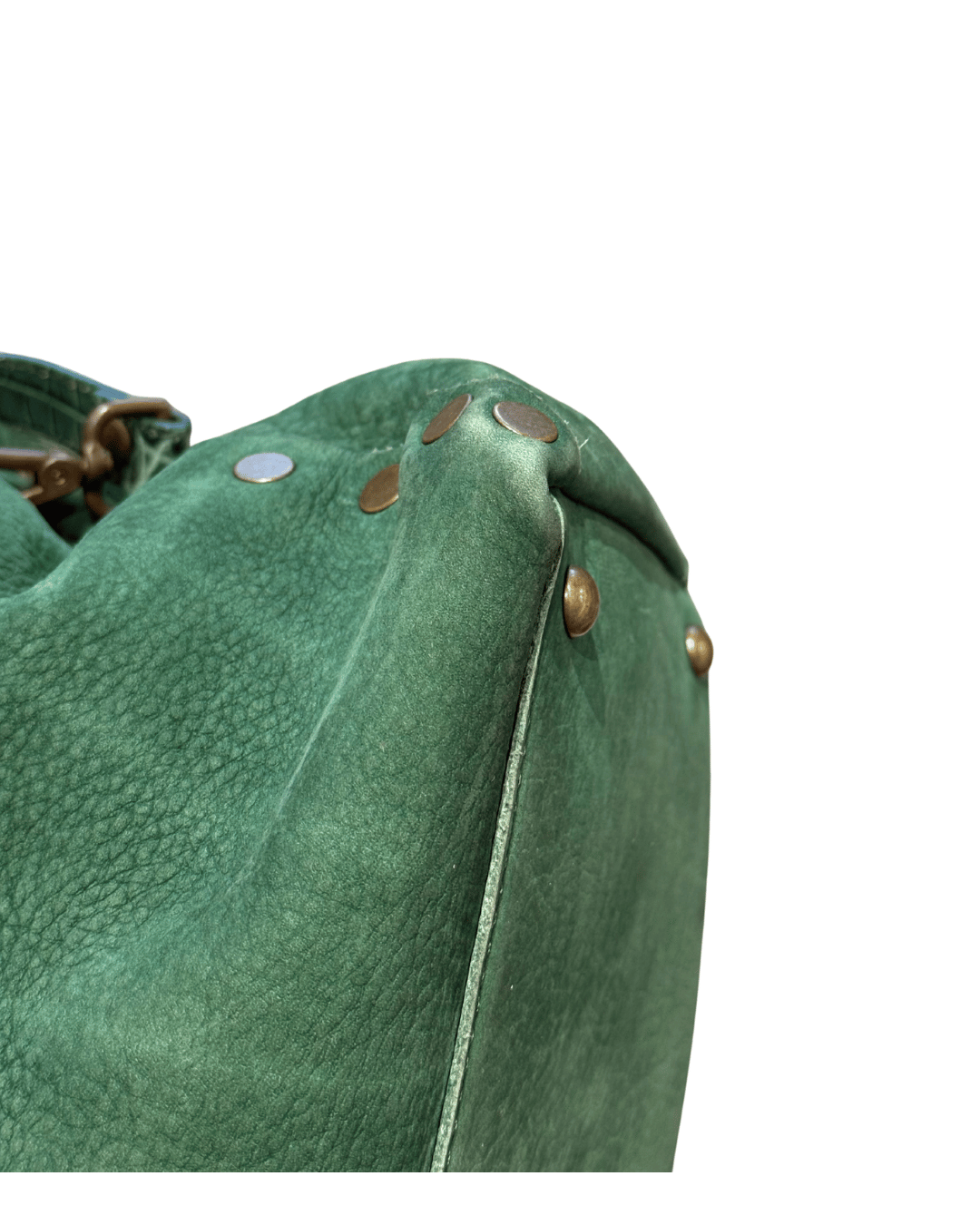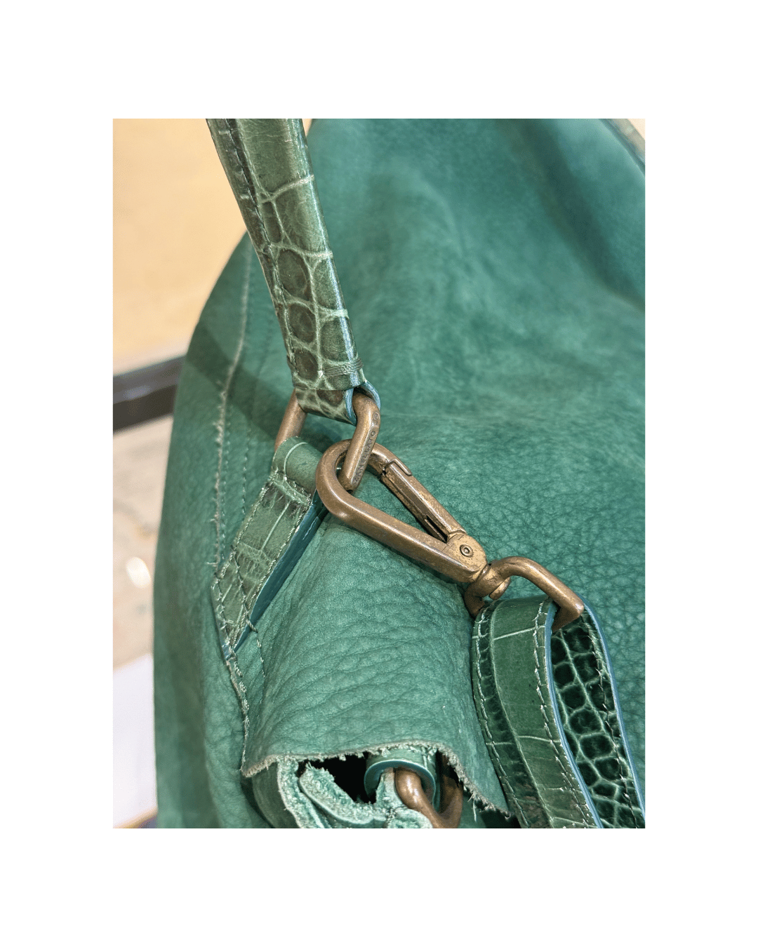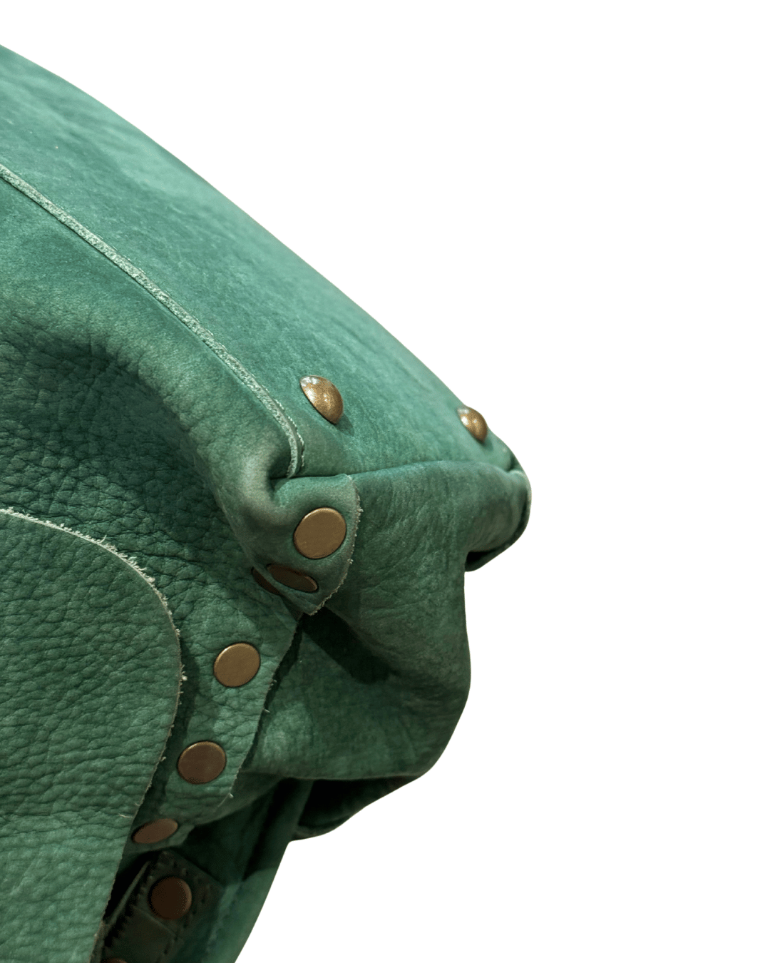 Un classico senza tempo firmato Zanellato: la celebre Postina in versione verde, realizzata in pelle martellata con dettagli in pelle effetto cocco sul manico e sulla tracolla. La chiusura a girello in metallo anticato e le borchie laterali donano al modello un carattere deciso ma elegante. La borsa è dotata di doppio manico: uno superiore per portarla a mano e una tracolla regolabile per indossarla a spalla o crossbody, adattandosi con praticità ad ogni occasione. L’interno è spazioso, organizzato con scomparti e tasca con zip, perfetto per contenere tutto il necessario con stile.