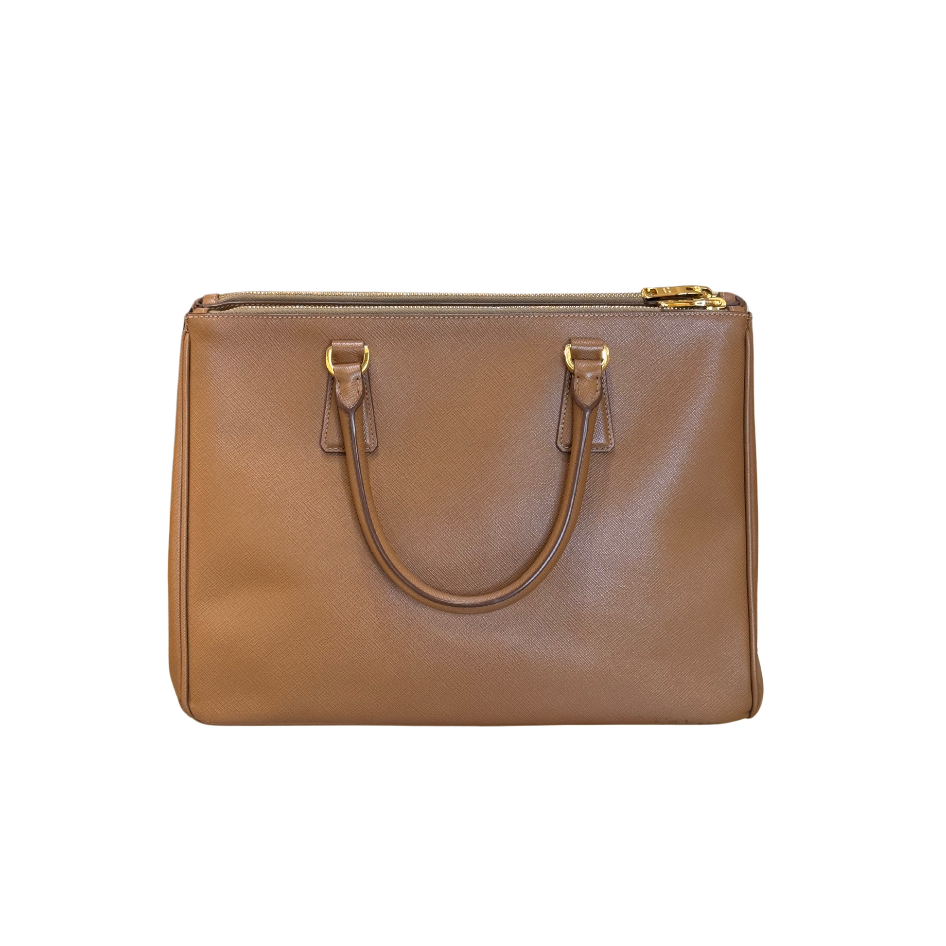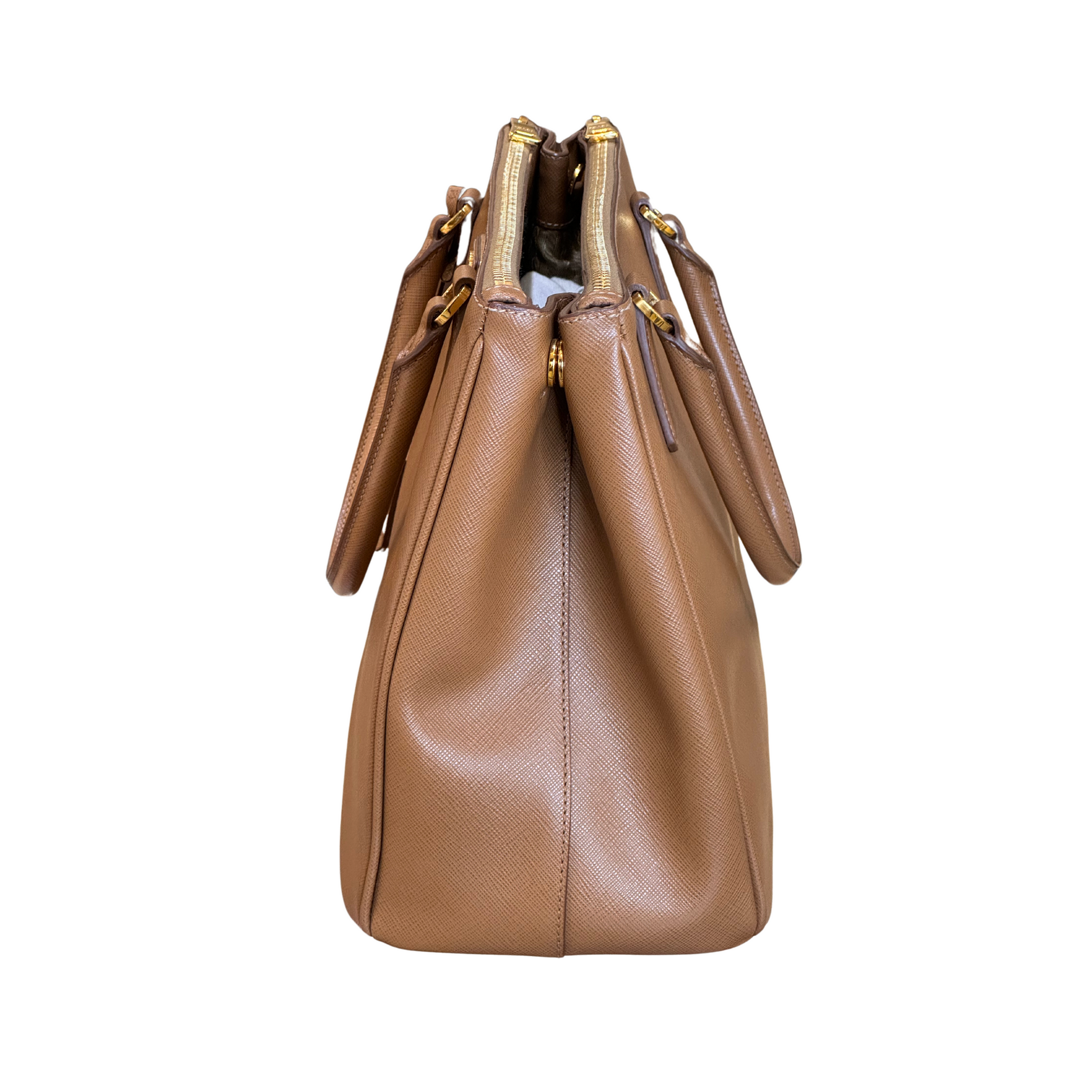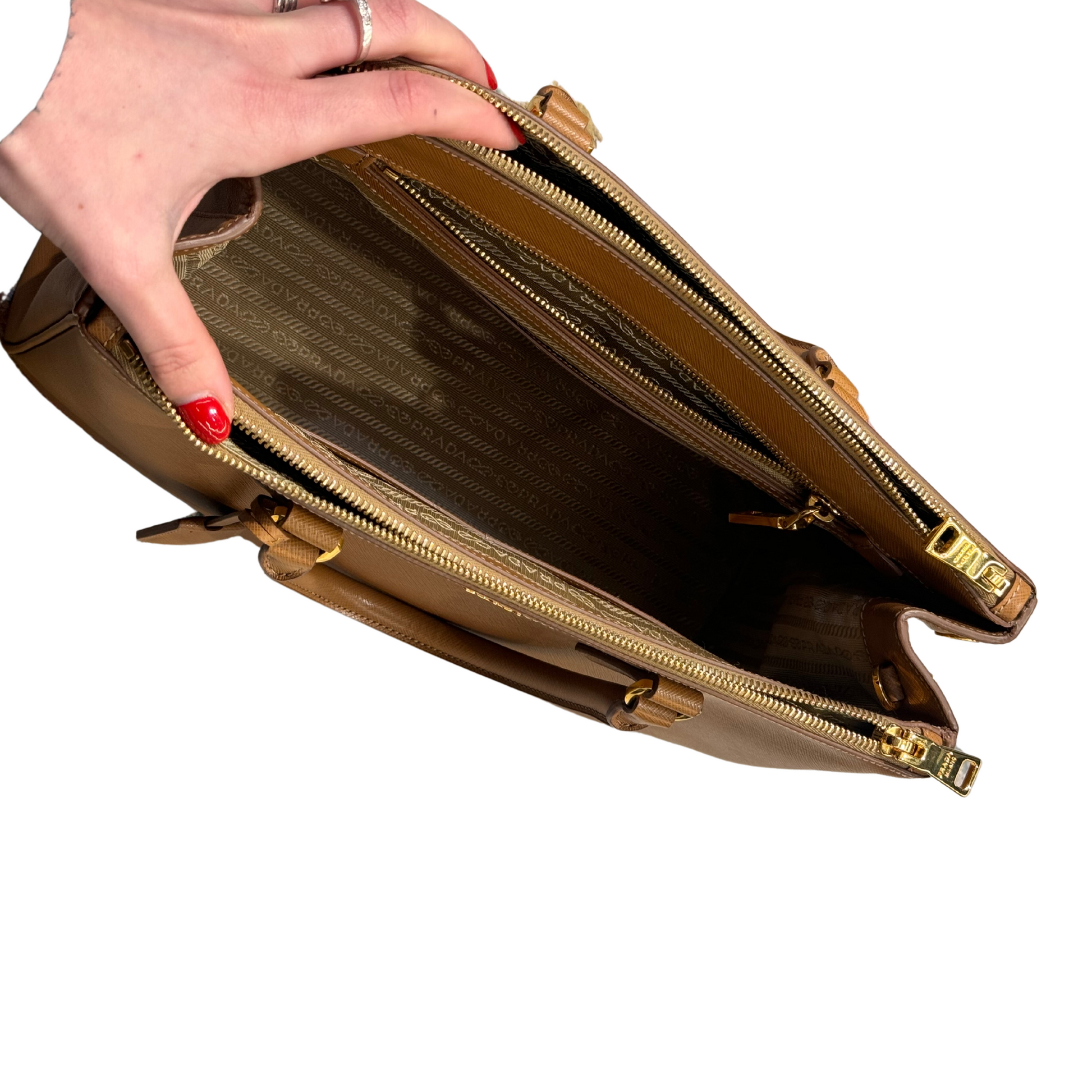 Borsa Prada in pelle saffiano color cuoio. Doppi manici arrotolati in pelle e tracolla amovibile. Logo lettering in metallo su triangolo. Chiusura con bottoni laterali a pressione. Portachiavi amovibile in pelle. Interno In tessuto logato, suddivido in tre scomparti di quelli laterali con cerniera. Metalleria dorata.