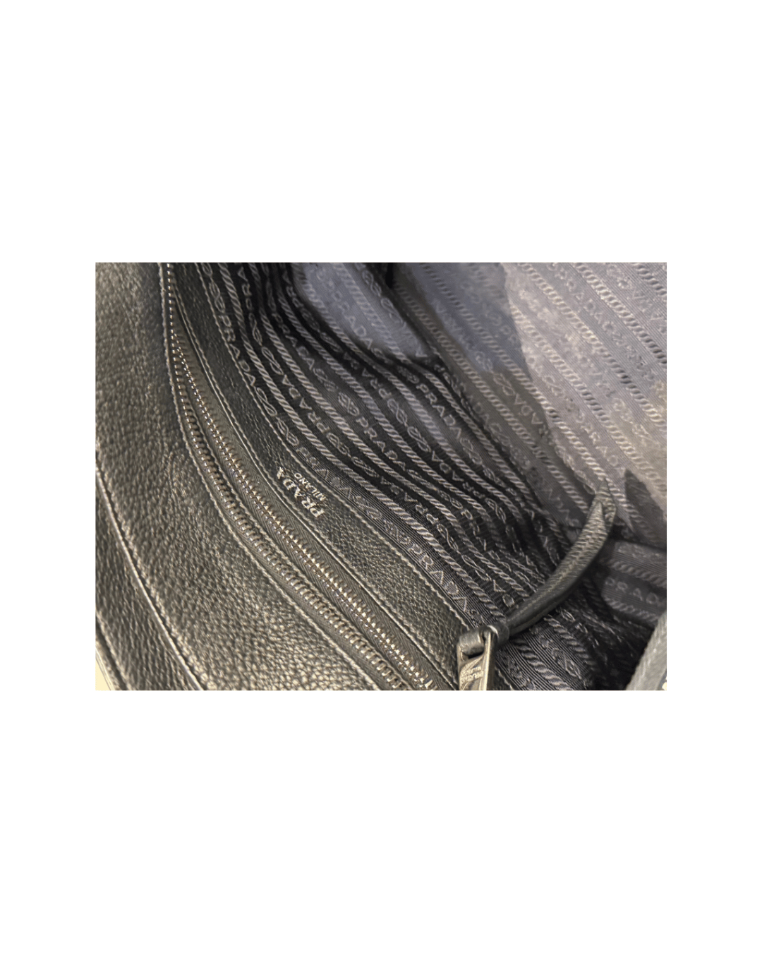 Il design è essenziale e senza tempo, valorizzato dal logo PRADA Milano in metallo argentato sul fronte, che dona un tocco iconico ma discreto. Dotata di doppi manici per una portabilità comoda a spalla,. L’interno è foderato in tessuto logato Prada e organizzato con tasca con chiusura zip, ideale per custodire gli oggetti più piccoli. La chiusura superiore con zip garantisce praticità e sicurezza.