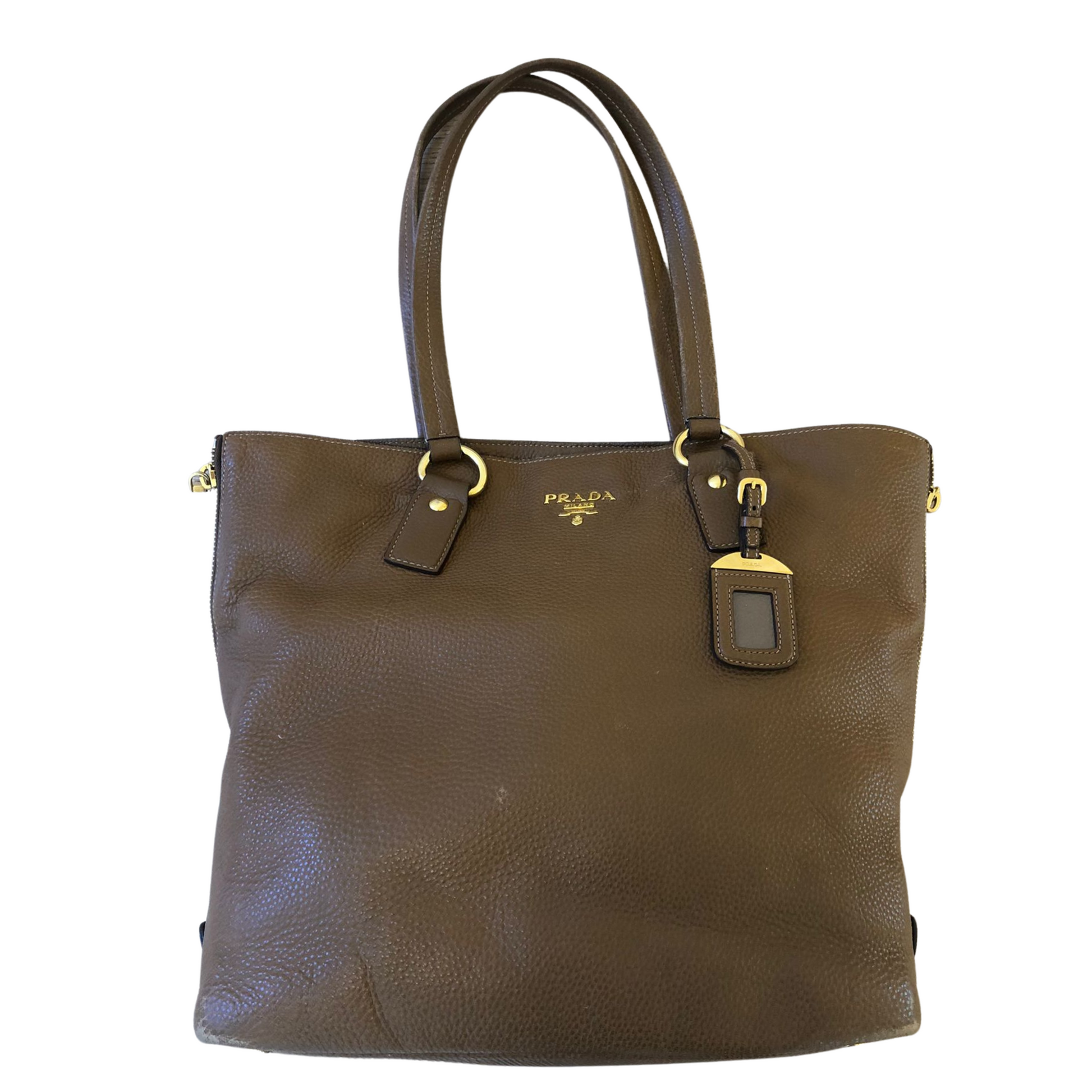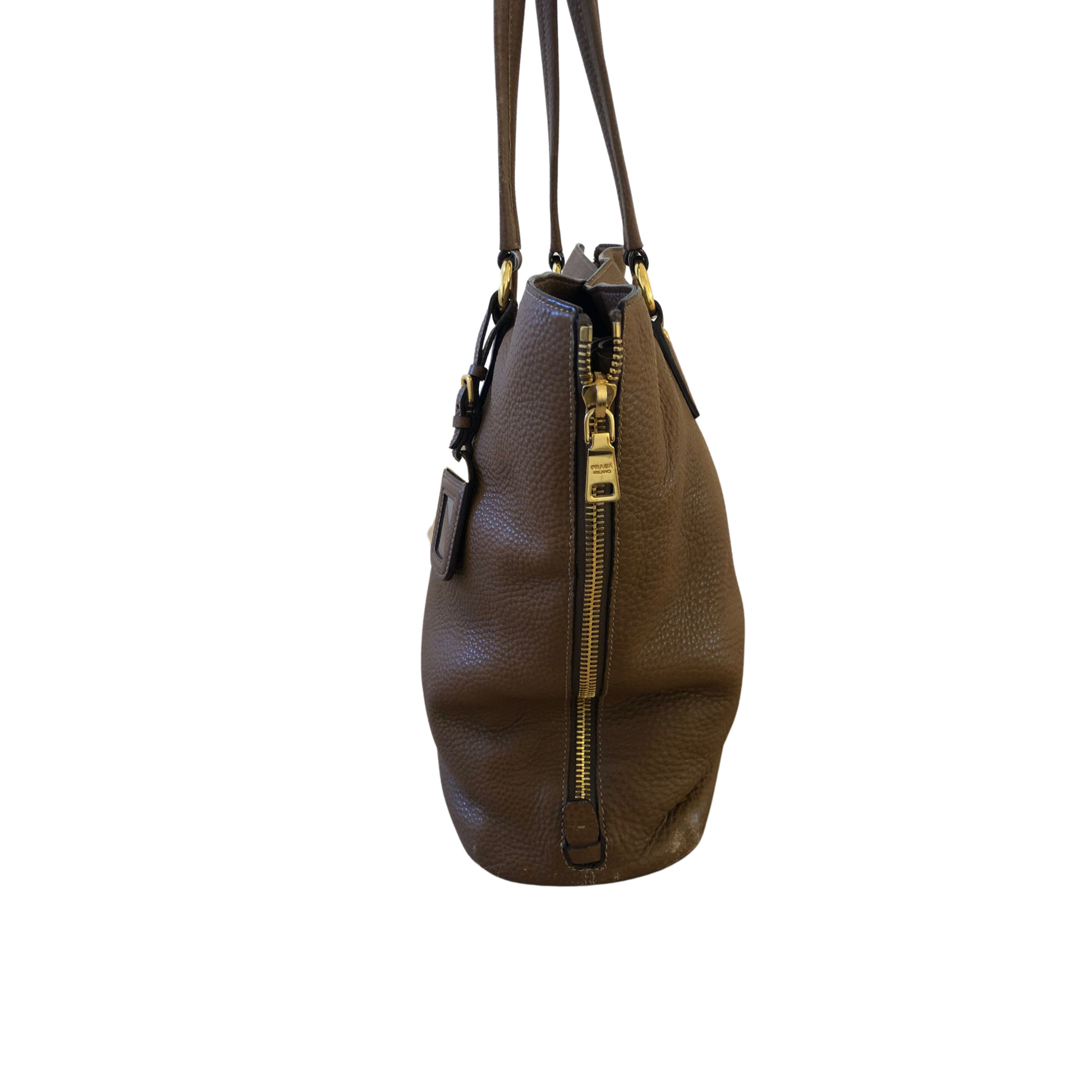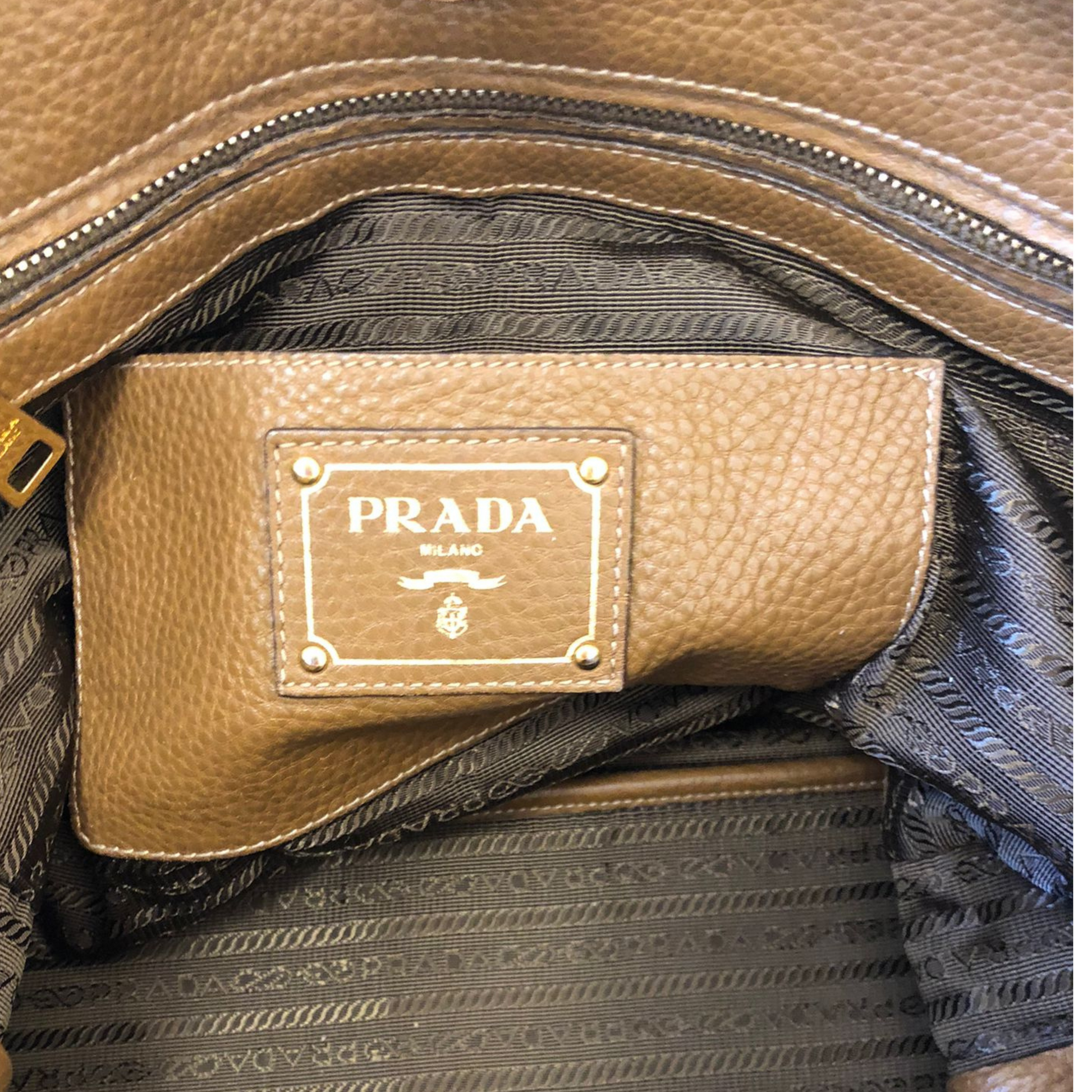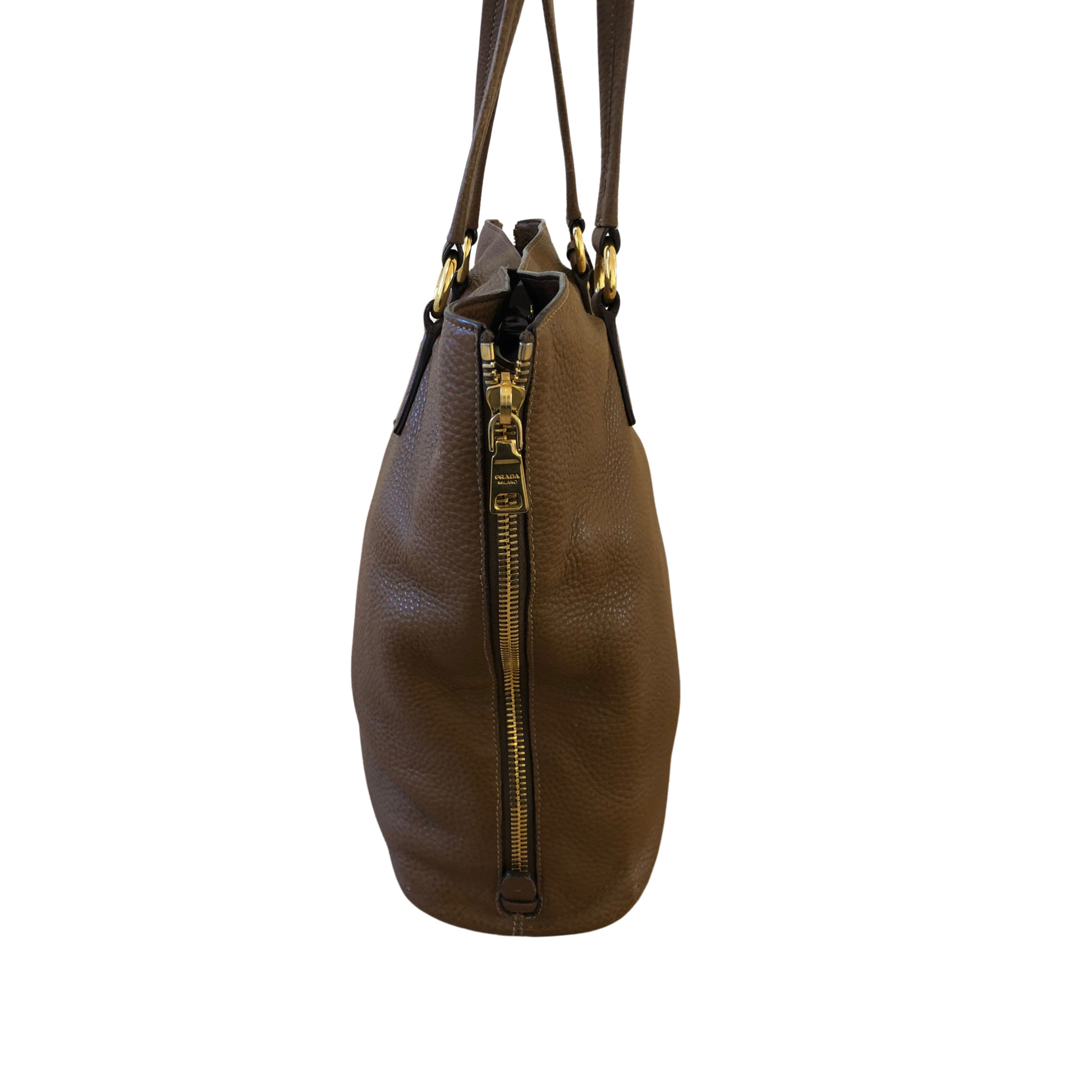 Shopping Bag Prada in pelle di vitello martellata color cammello. Manici piatti e lunghi, possibilità di indossarla sia a spalla che a mano. Dettagli in metallo dorato. Cerniere laterali che permettono di ampliare le dimensioni della borsa. Sulla base sono presenti quattro piedini di appoggio. Apertura magnetica, interno in tessuto marrone logato. Tasca con cerniera.