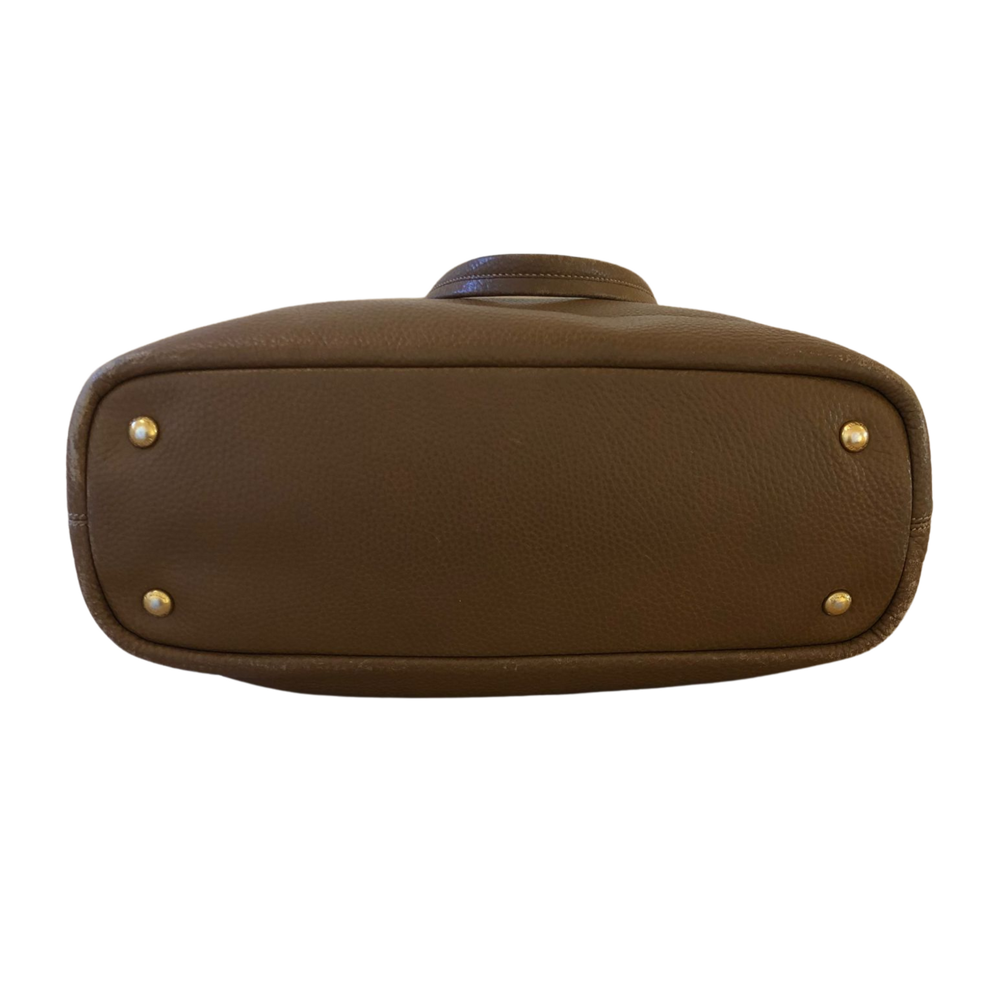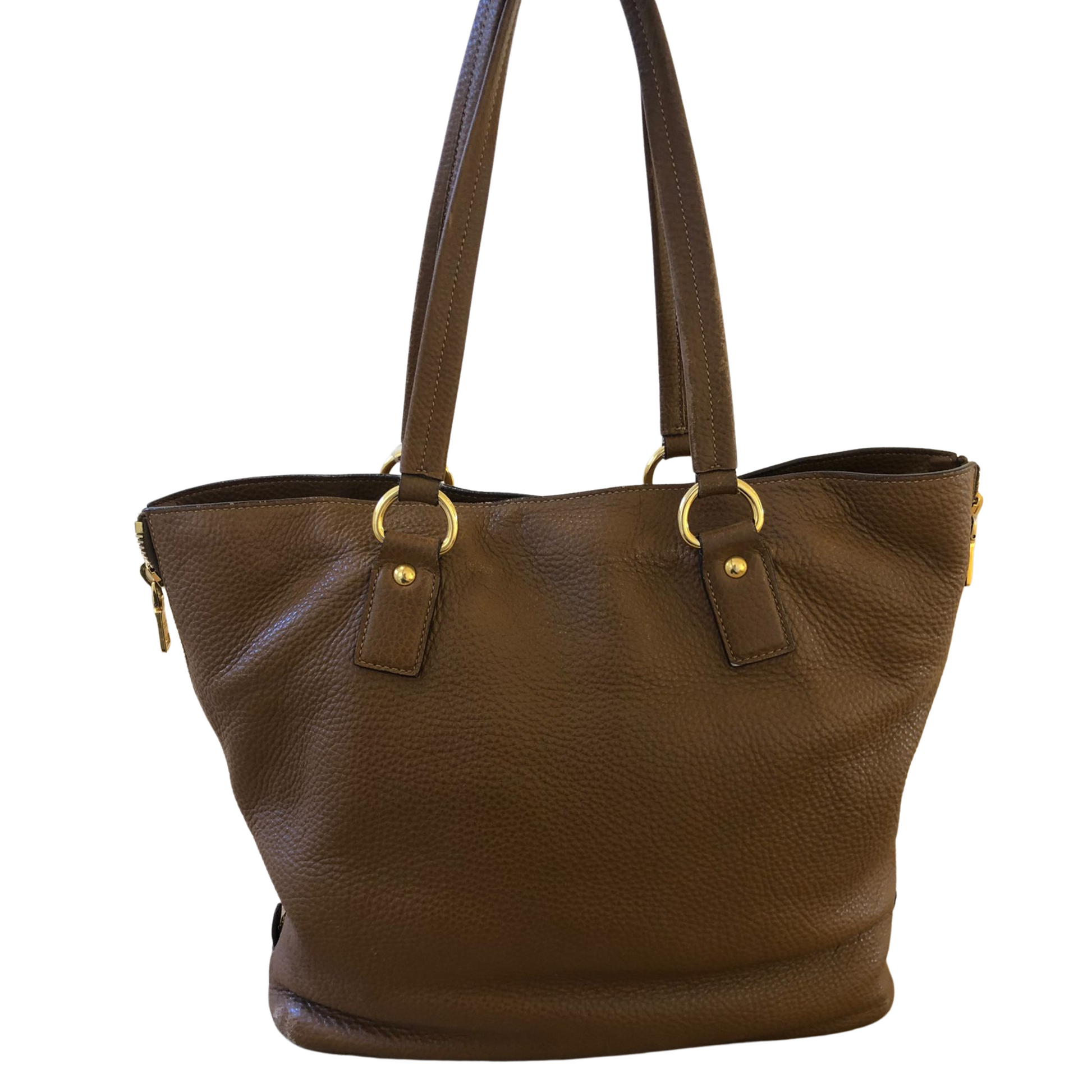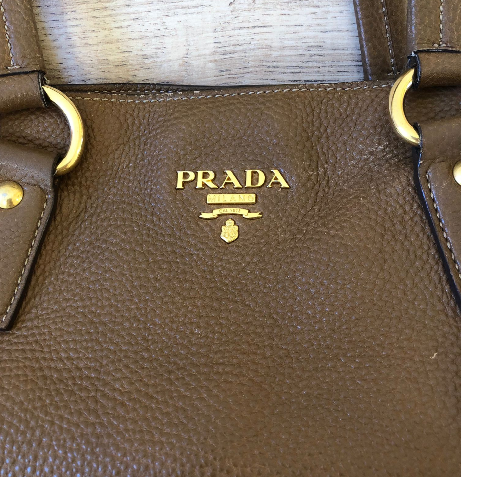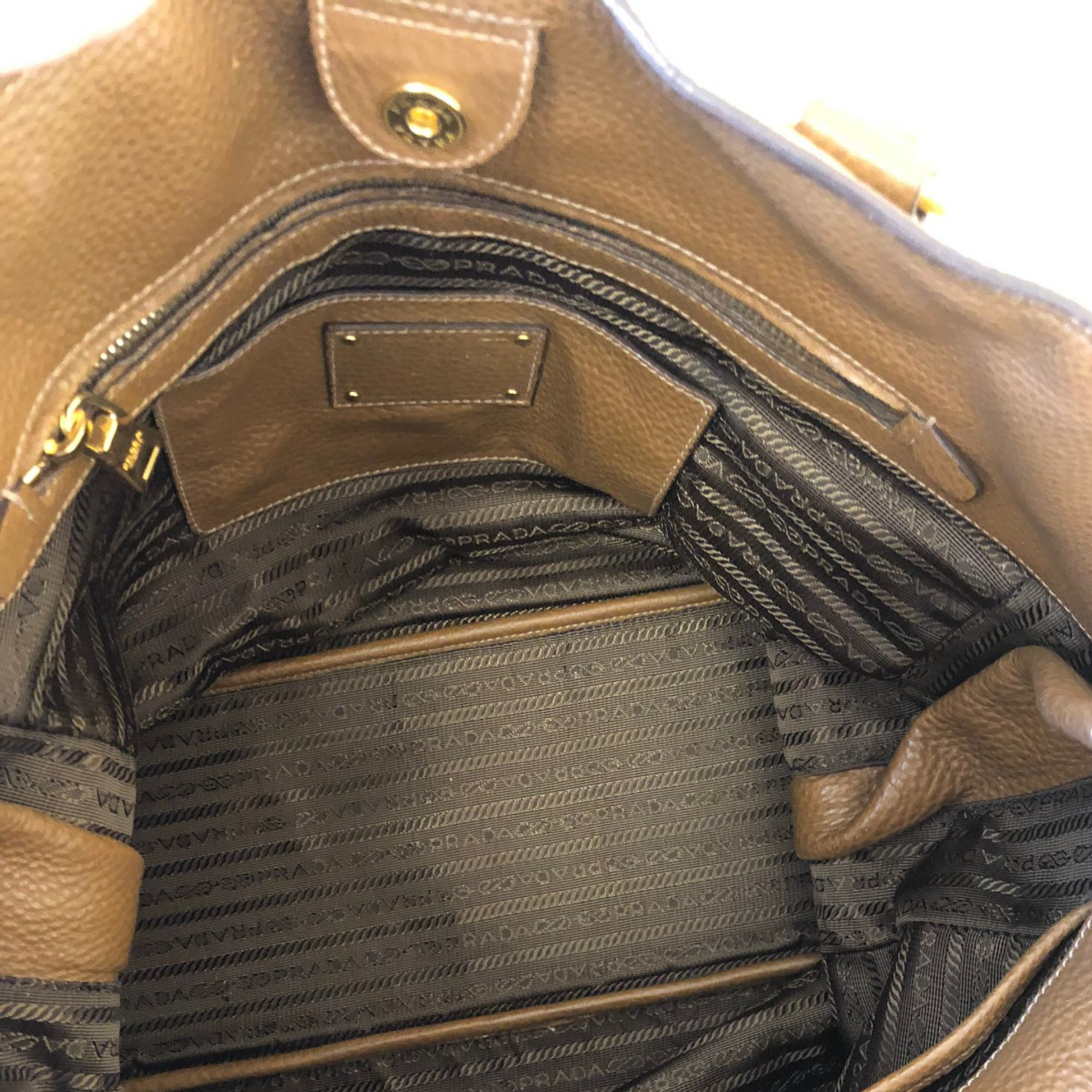 Shopping Bag Prada in pelle di vitello martellata color cammello. Manici piatti e lunghi, possibilità di indossarla sia a spalla che a mano. Dettagli in metallo dorato. Cerniere laterali che permettono di ampliare le dimensioni della borsa. Sulla base sono presenti quattro piedini di appoggio. Apertura magnetica, interno in tessuto marrone logato. Tasca con cerniera.