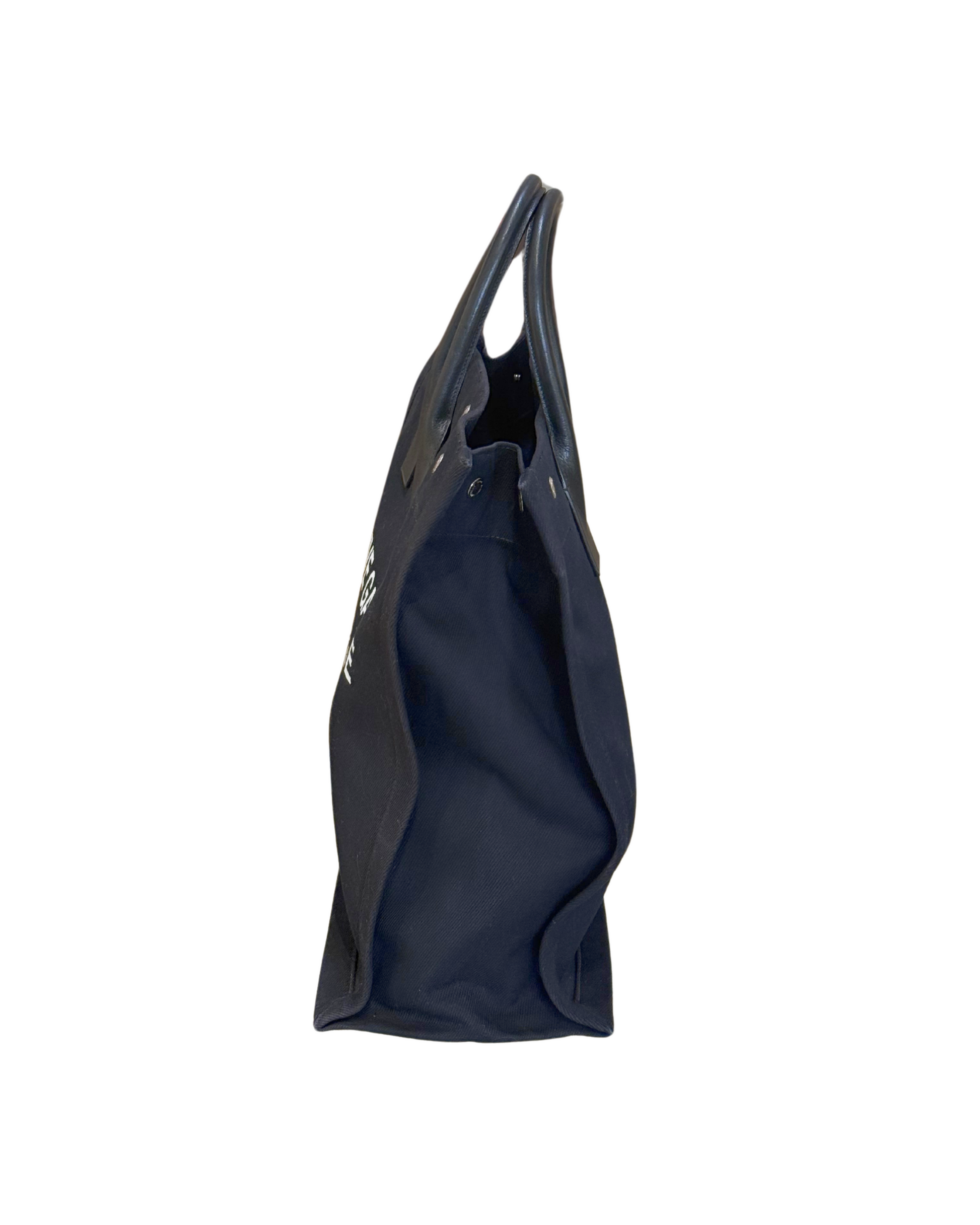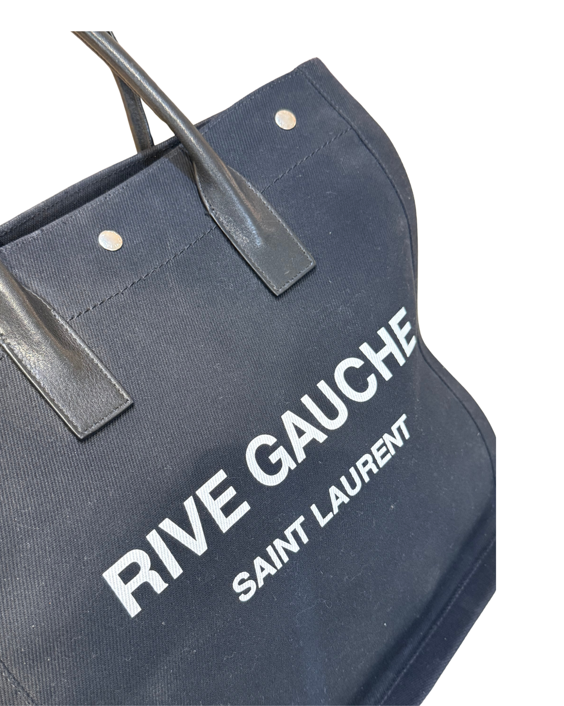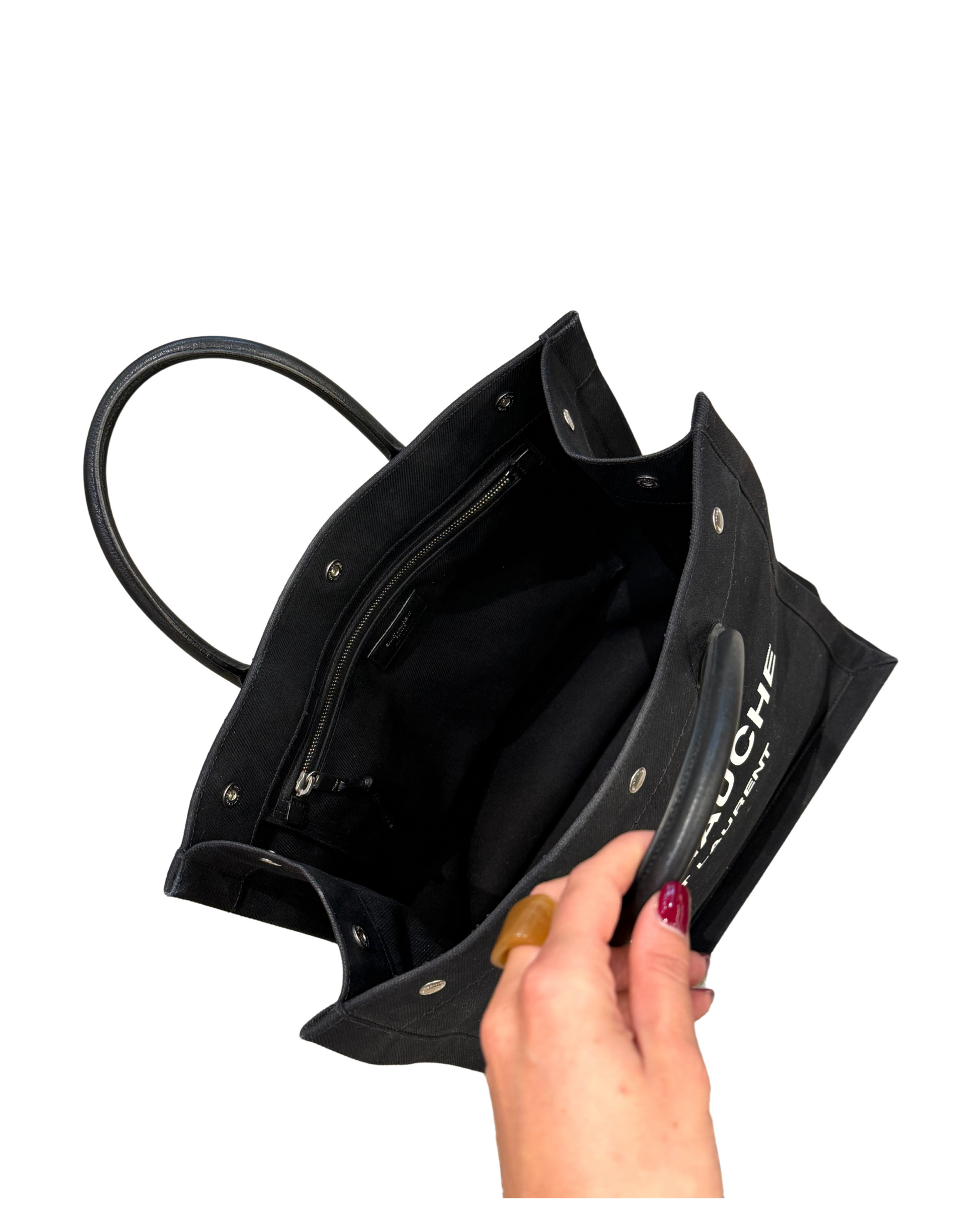 Iconica e dal carattere deciso, la borsa "Rive Gauche" di Saint Laurent è un must-have per chi ama lo stile minimalista chic. Realizzata in resistente tela nera con dettagli in pelle, presenta il logo bianco a contrasto stampato sul fronte, mentre il retro rimane pulito ed essenziale. Dotata di doppi manici in pelle liscia, è spaziosa e pratica, perfetta sia per il lavoro che per il temp libero. L'interno ospita una comoda tasca con cerniera.