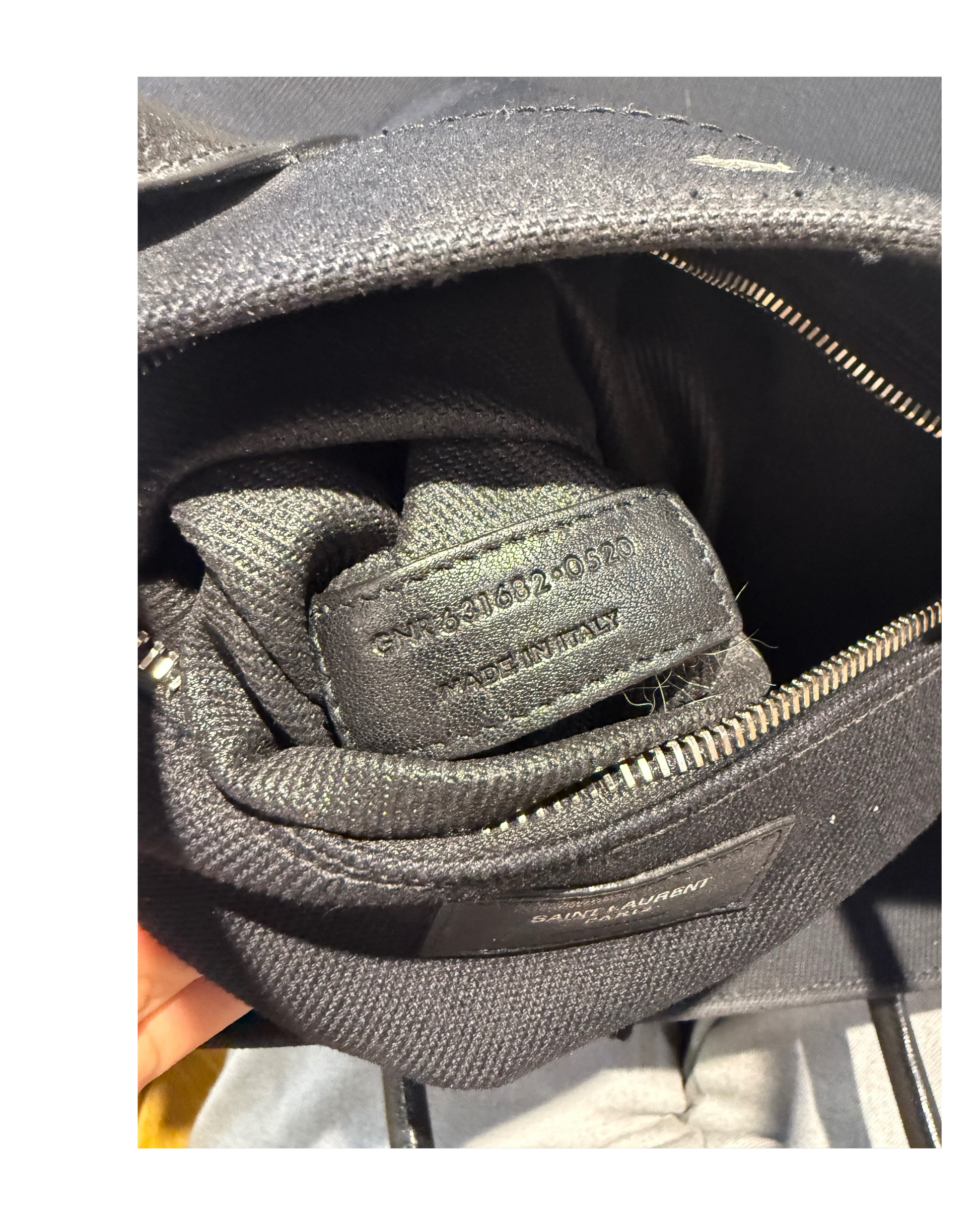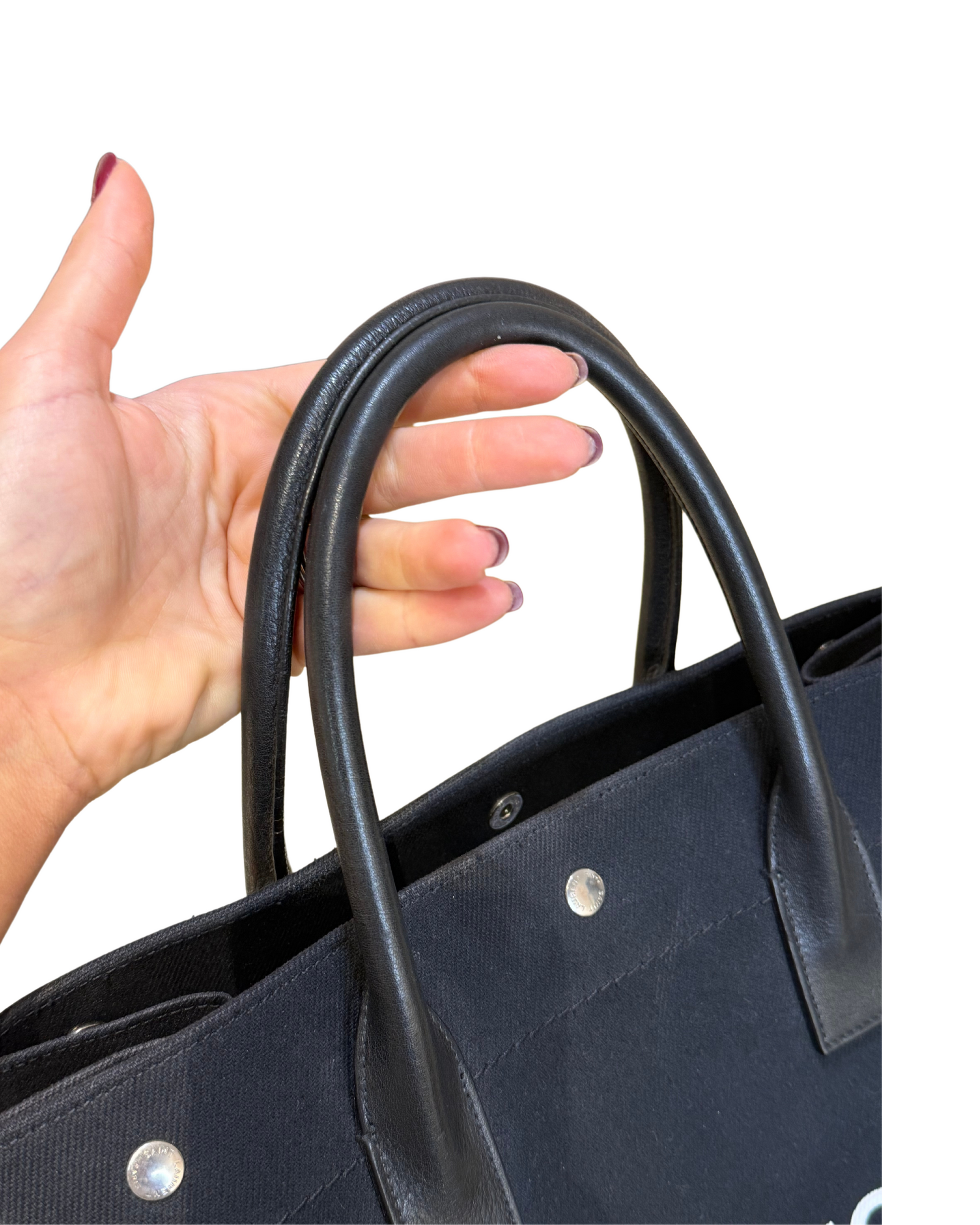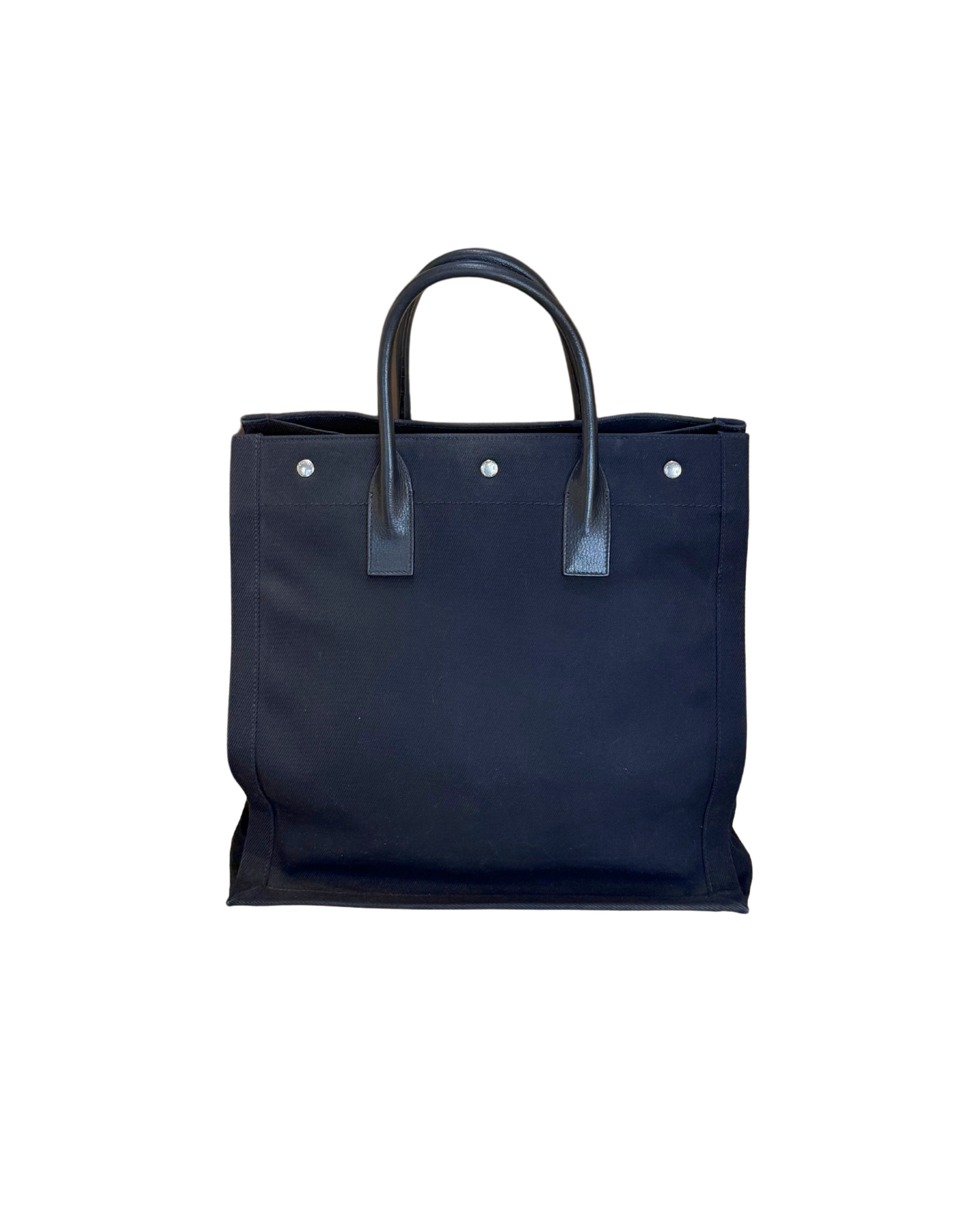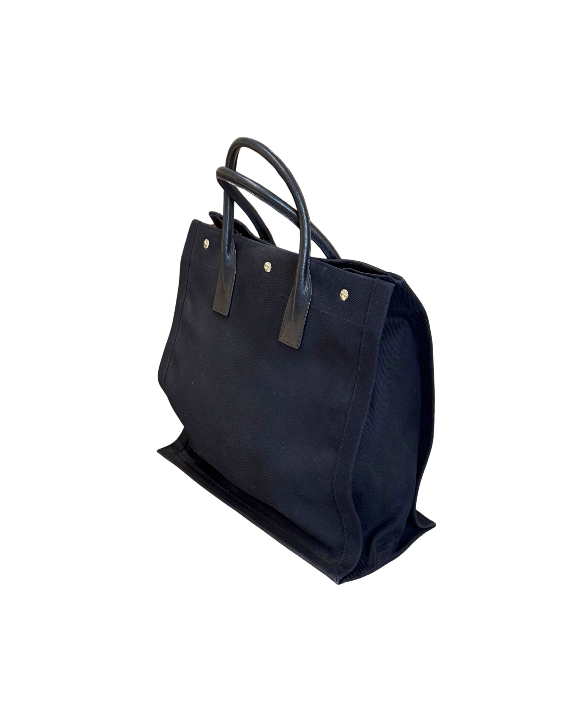 Iconica e dal carattere deciso, la borsa "Rive Gauche" di Saint Laurent è un must-have per chi ama lo stile minimalista chic. Realizzata in resistente tela nera con dettagli in pelle, presenta il logo bianco a contrasto stampato sul fronte, mentre il retro rimane pulito ed essenziale. Dotata di doppi manici in pelle liscia, è spaziosa e pratica, perfetta sia per il lavoro che per il temp libero. L'interno ospita una comoda tasca con cerniera.