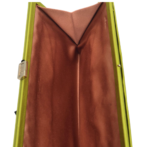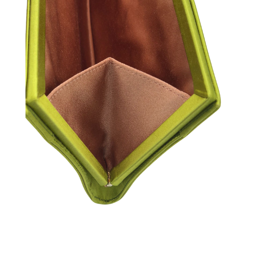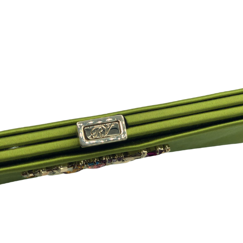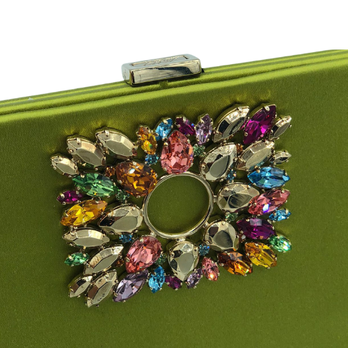 Ispirata ai giardini del castello di Versailles, questa pochette è realizzata in raso verde. Presenta l’iconica fibbia in cristalli colorati.