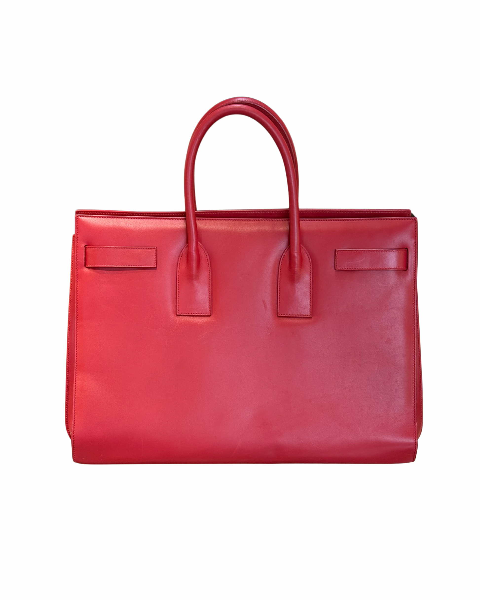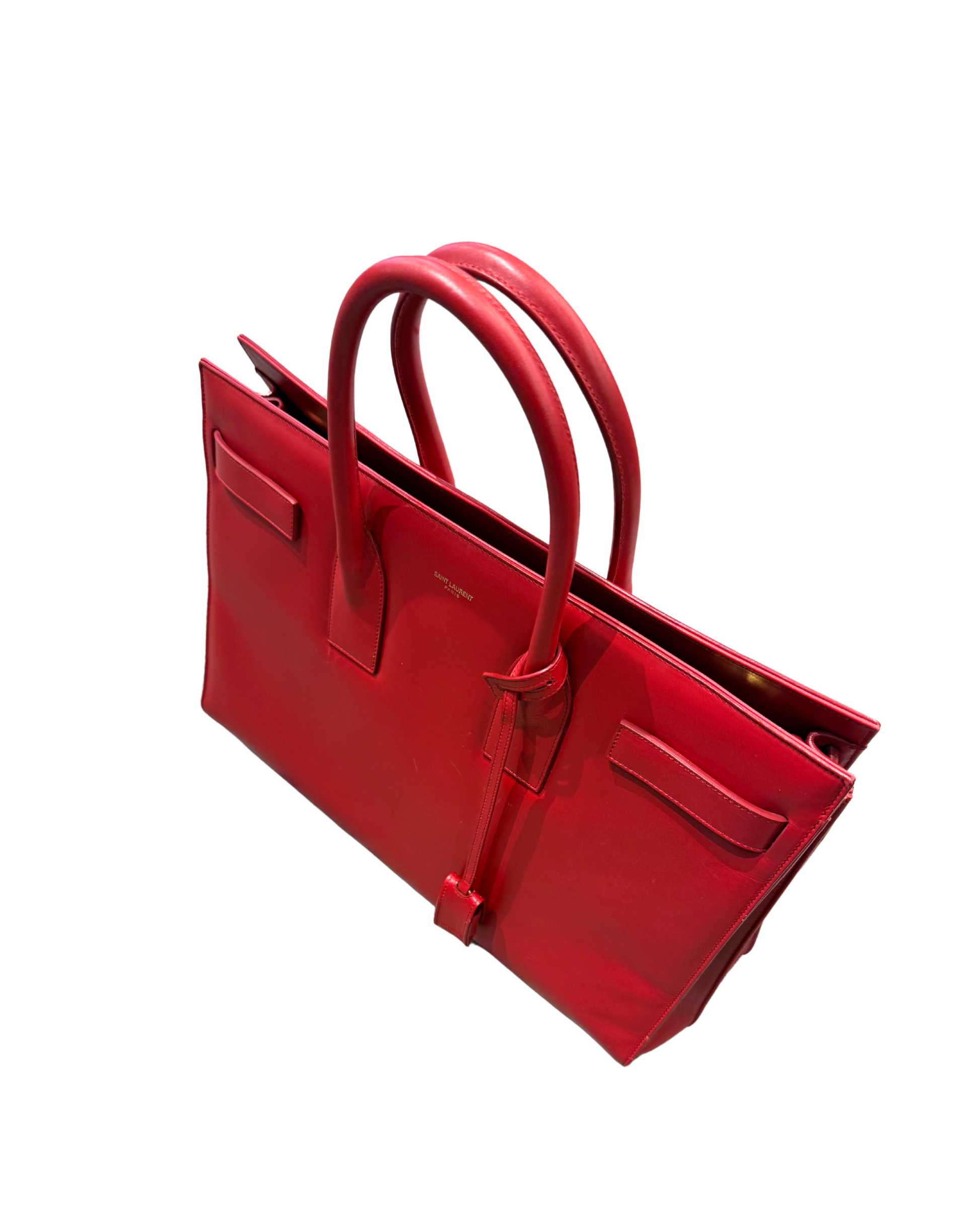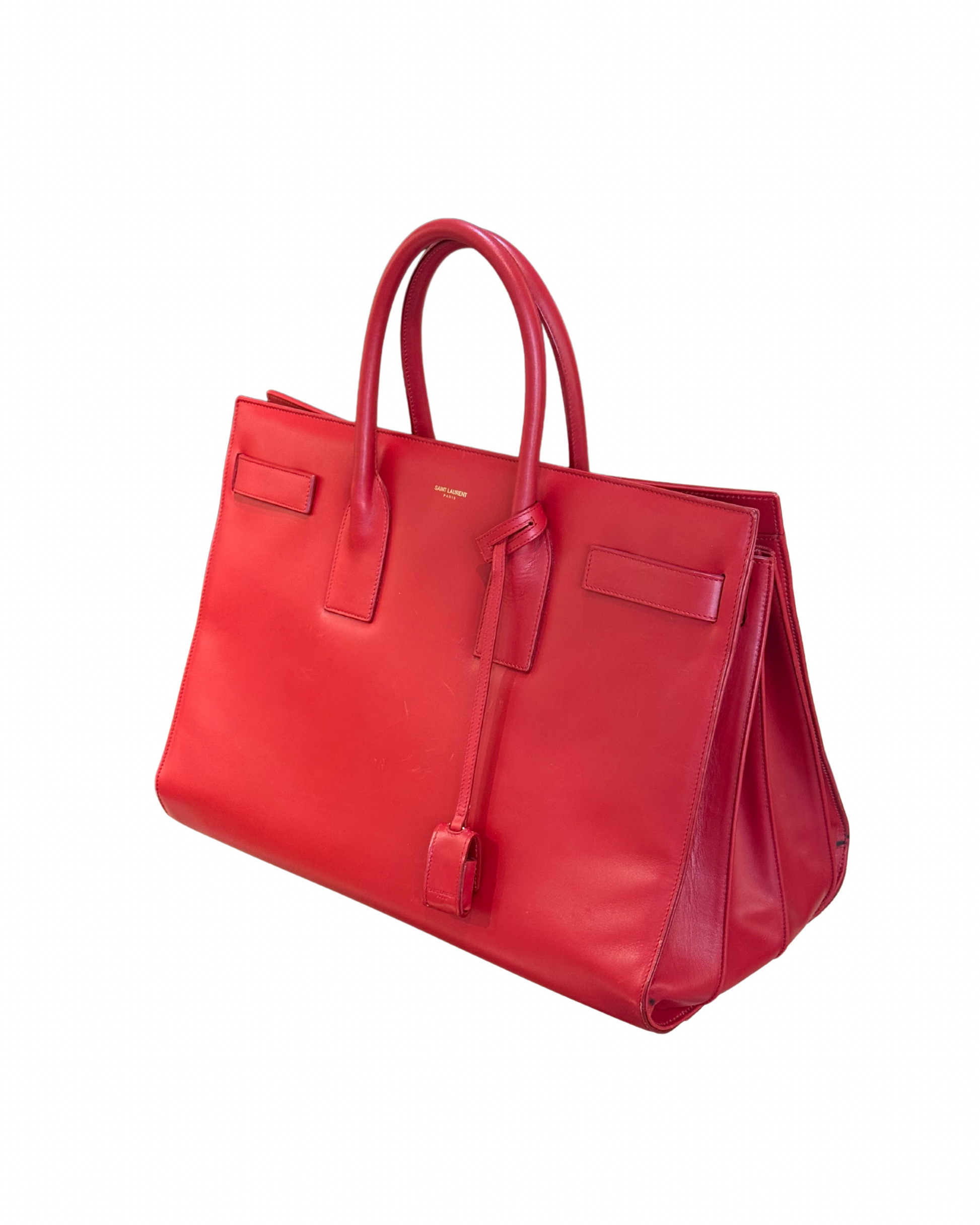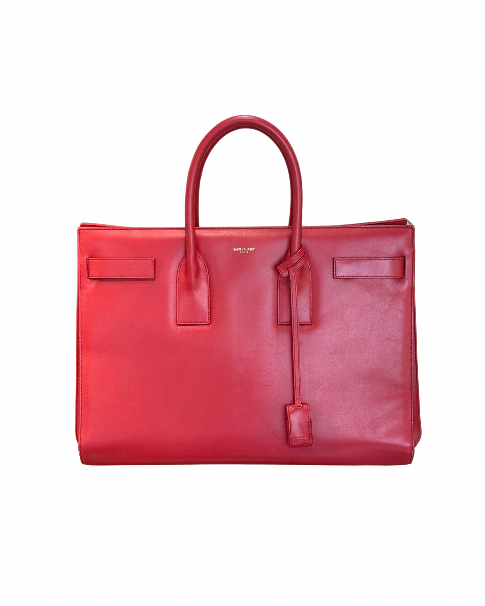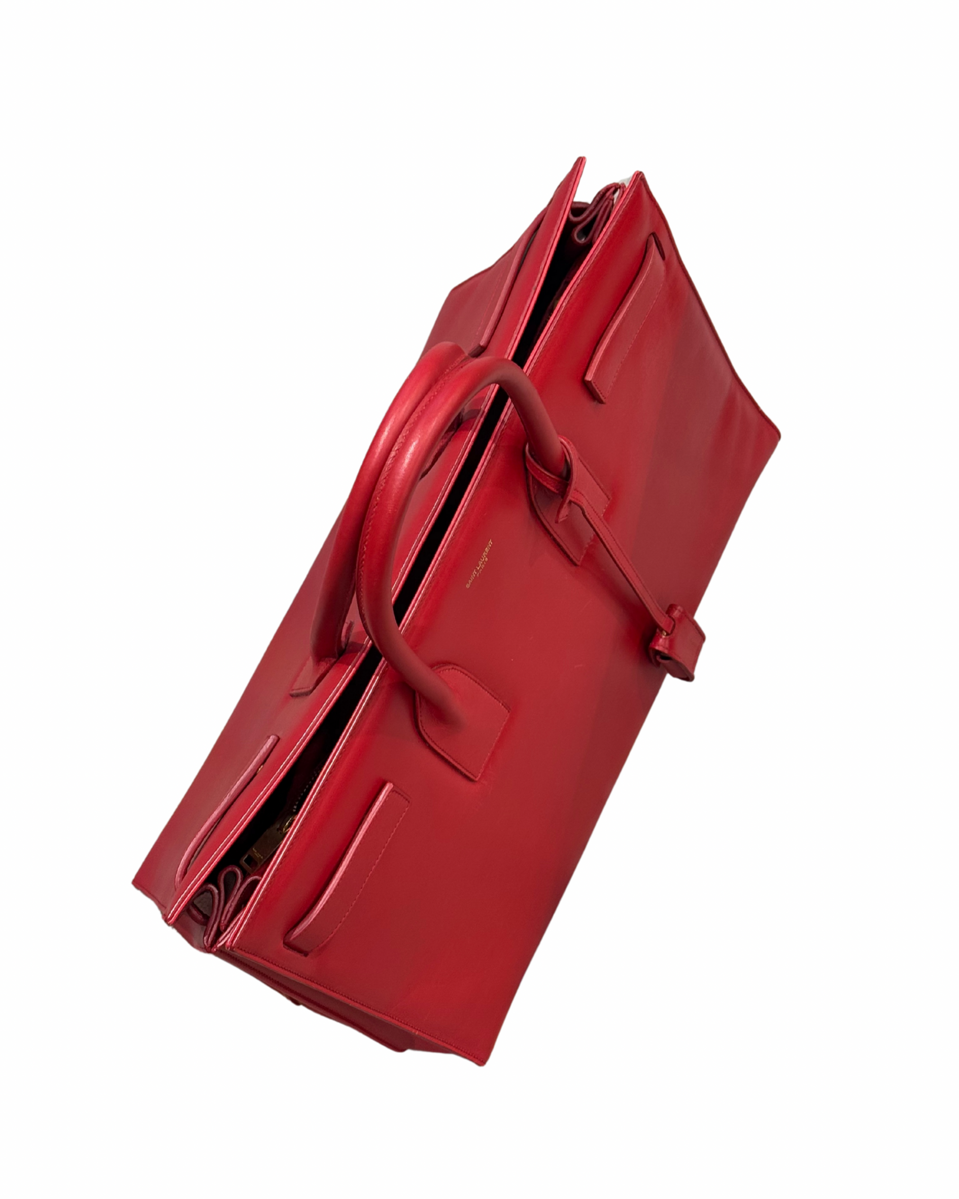Sac de Jour Yves Saint Laurent in pelle di vitello liscia rossa. Doppi manici in pelle. Lucchetto amovibile con custodia in pelle. Interno in alcantara suddiviso in due scomparti da una tasca con cerniera. Sulla parte frontale logo impresso. Metalleria dorata. Cinque piedini d'appoggio. (codice: 319910 527411)