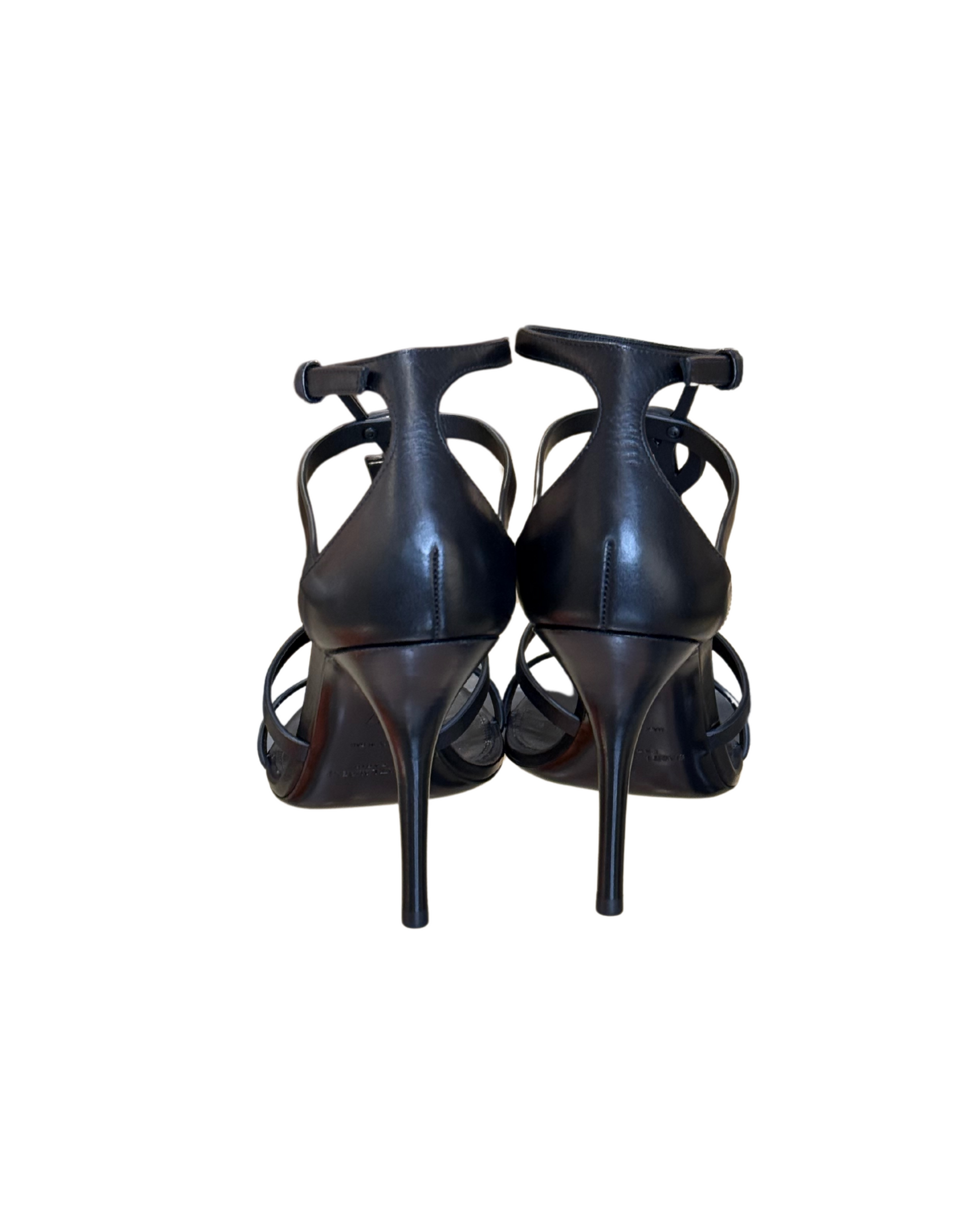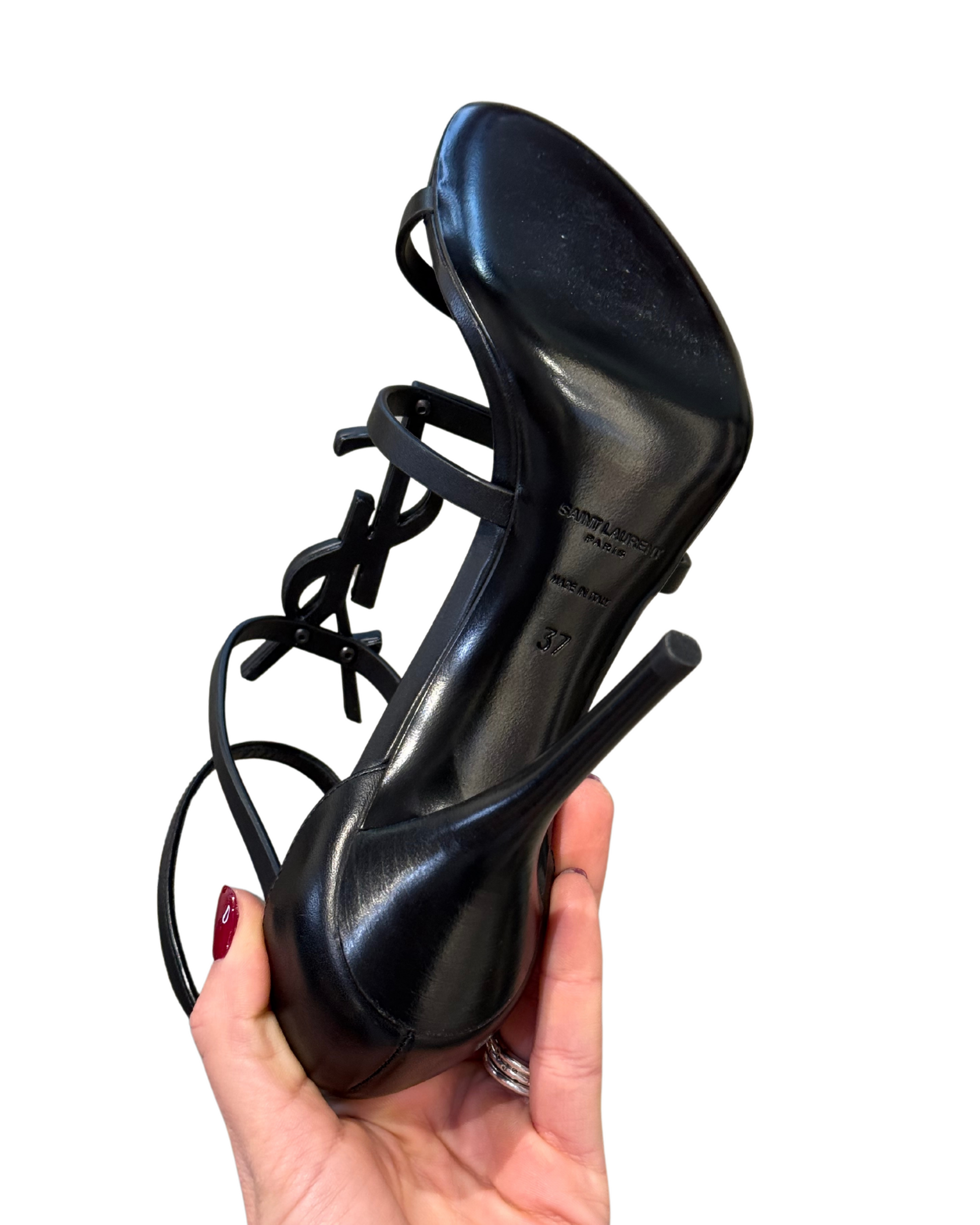 Sandali Yves Saint Laurent Cassandra total black a stiletto con cinturini sottili. Decorati sul davanti con iniziali YSL nere. Suola in cuoio. Tacco 10cm