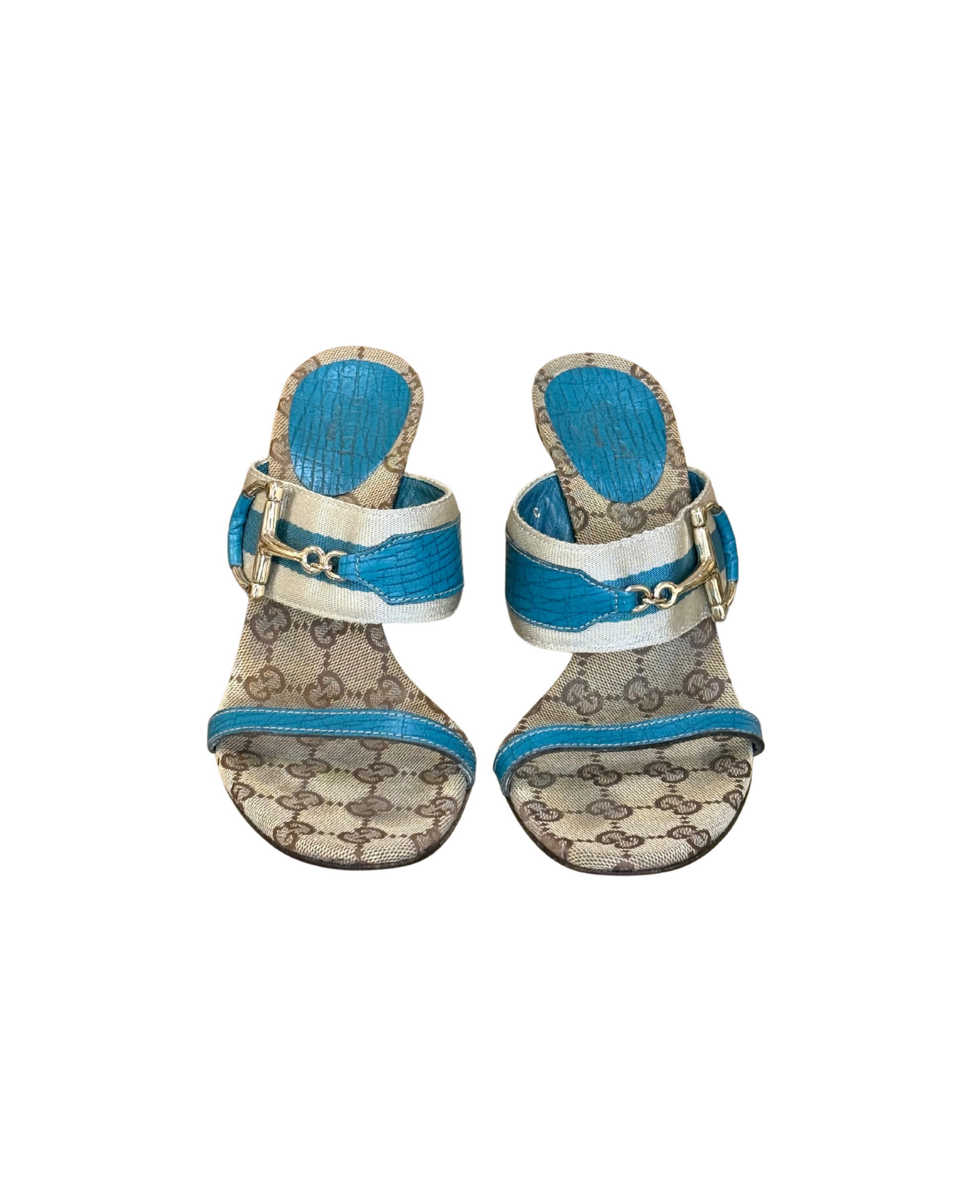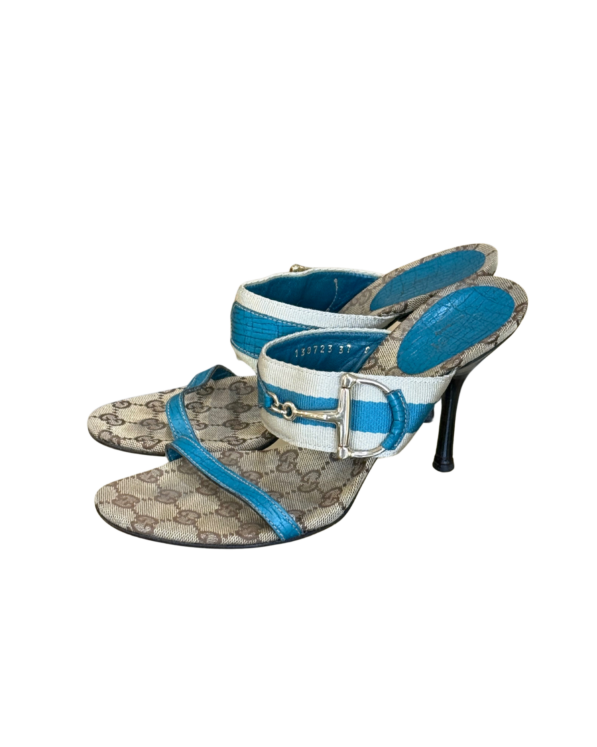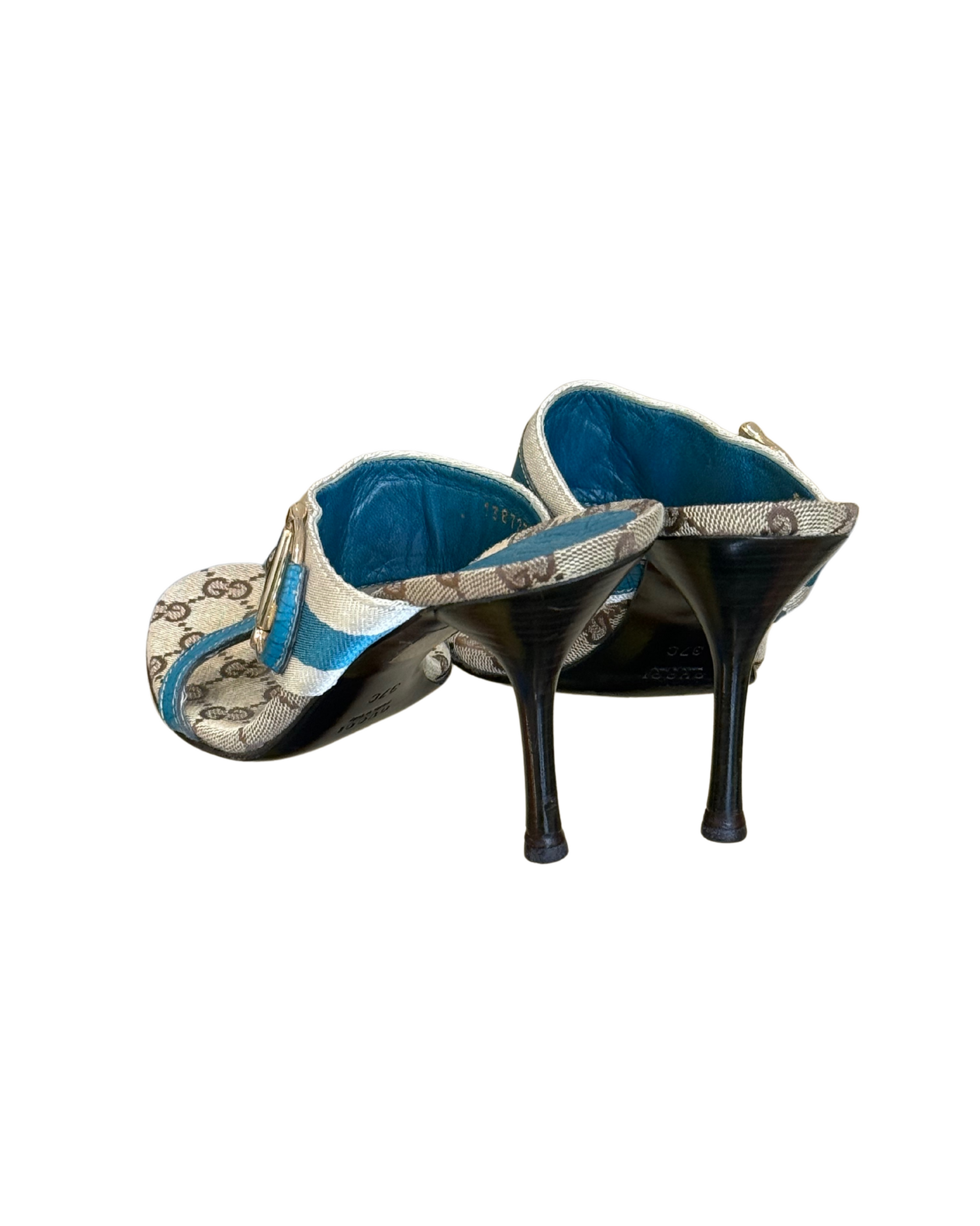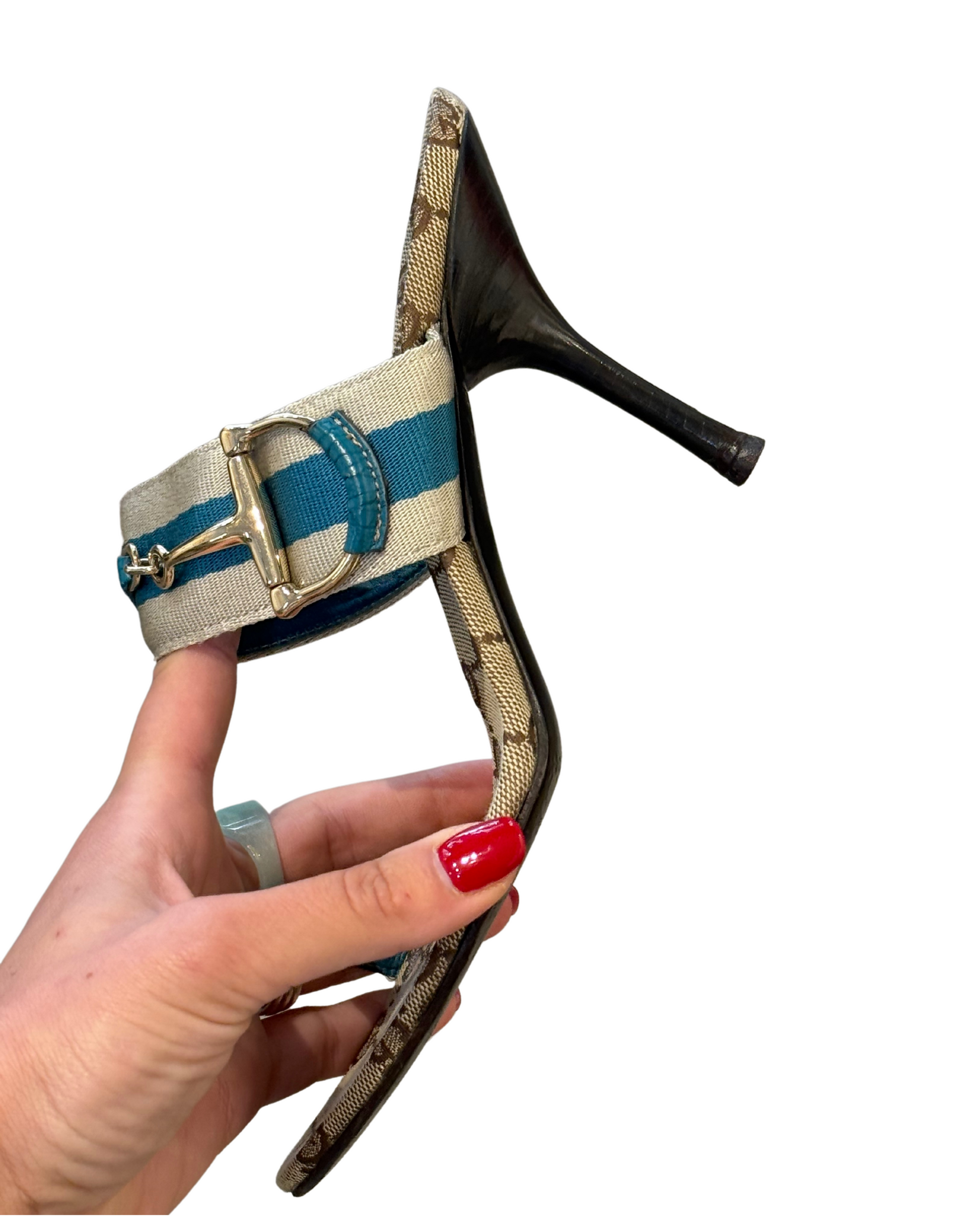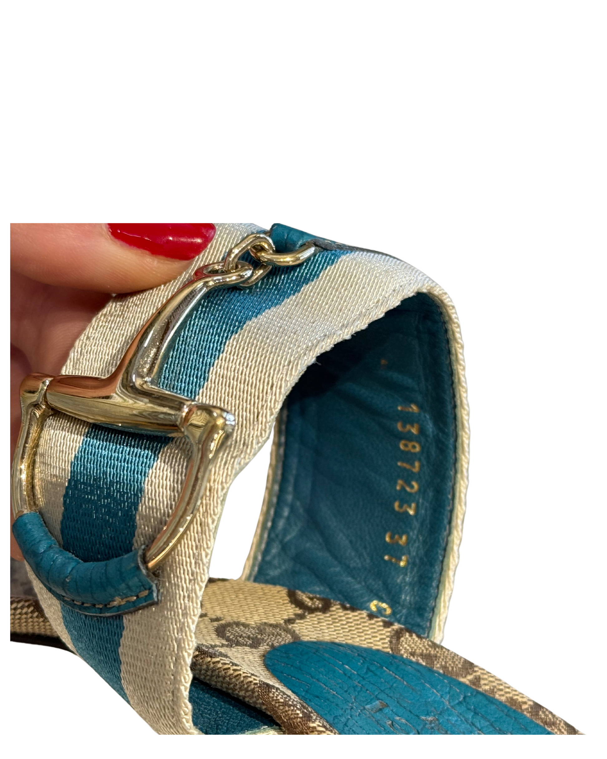 Sandali di Gucci realizzati in tela monogram GG supreme , rifiniture in pelle turchesi. Impreziositi da fascia web bianca e turchese e staffa in metallo argentato. Tacco sottile realizzato in legno. Tacco 10cm