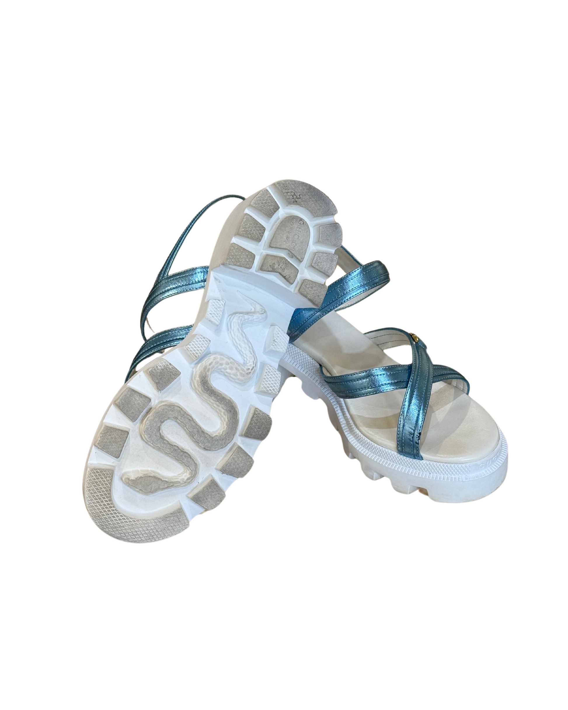 Sandali Gucci con laccetti sottili in pelle di vitello turchese metallizzata. Logo GG in metallo dorato. Suola in gomma bianca a carroarmato con tacco 7cm.
