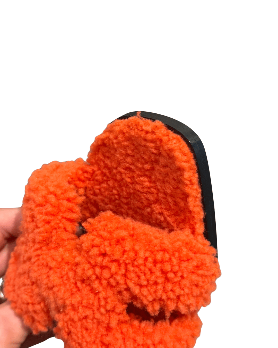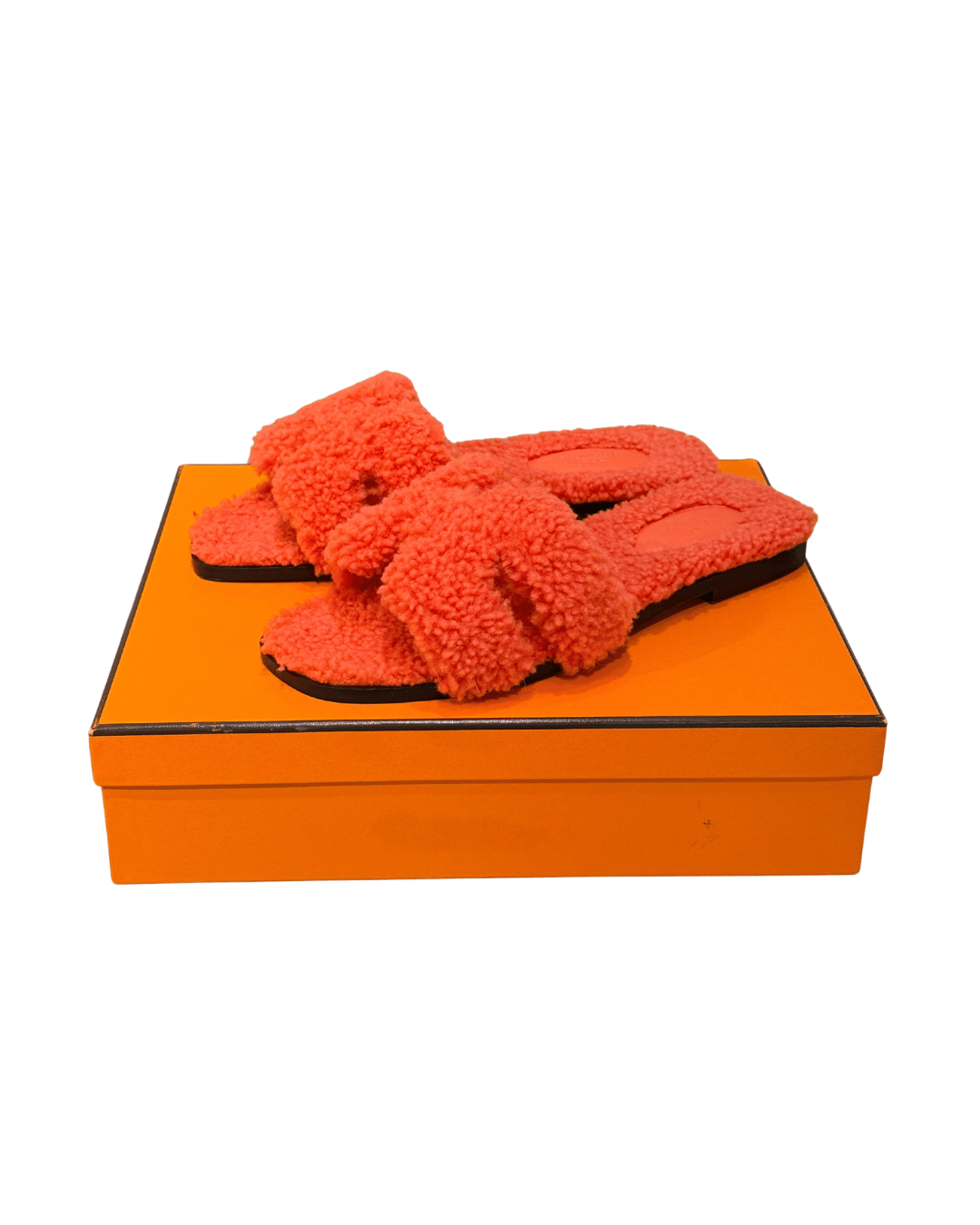 Sandali Hermès Oran nella particolare versione shearling, reinterpretazione invernale e soffice. Il design riprende la celebre fascia a forma di “H”, simbolo distintivo di Hermès, qui realizzata interamente in shearling di lana di pecora, che dona al sandalo un effetto morbido, voluminoso e contemporaneo. Il colore arancione acceso, tipico dell’universo Hermès, rende questo modello immediatamente riconoscibile e perfetto per aggiungere un tocco originale anche agli outfit più semplici. Questa versione “fluffy” è una delle reinterpretazioni più ricercate del modello iconico, spesso proposta in edizioni limitate e difficili da reperire.