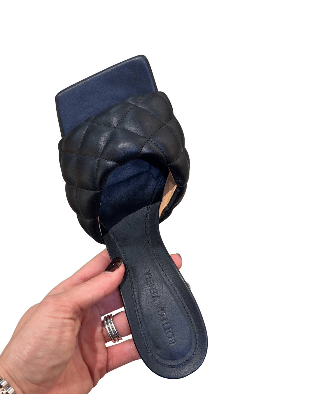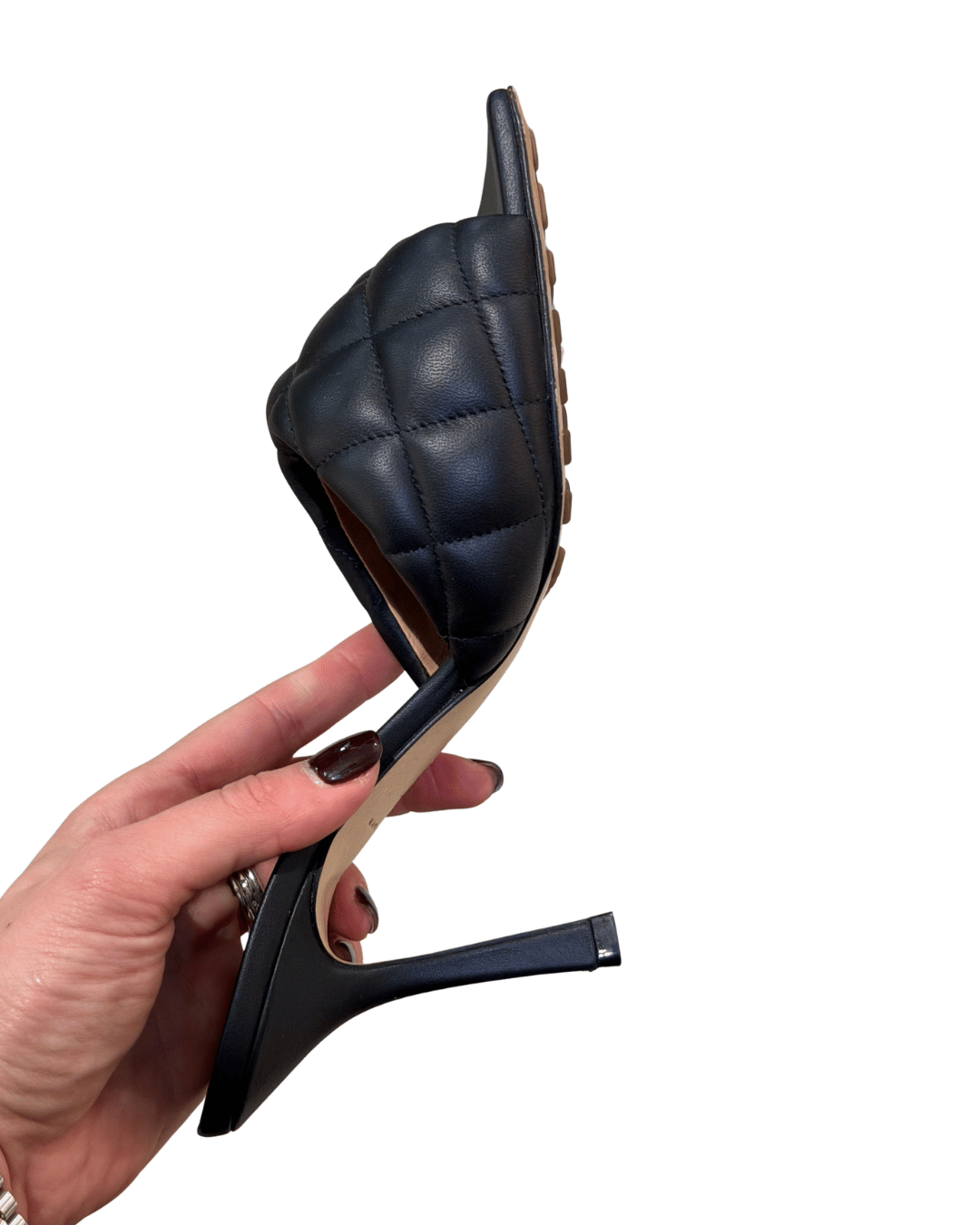 Sandali Bottega Veneta Padded Mules realizzati in morbida pelle nera trapuntata, uno dei modelli più iconici della Maison negli ultimi anni. Il design è caratterizzato dalla fascia imbottita con motivo trapuntato che dona volume e un effetto contemporaneo, mantenendo al tempo stesso l’eleganza minimal tipica di Bottega Veneta. La punta è squadrata, dettaglio distintivo che conferisce alla scarpa un’estetica moderna e sofisticata. Il tacco sottile di 10cm slancia la silhouette e rende il modello femminile e raffinato, perfetto sia per la sera che per look più ricercati durante il giorno. Internamente sono rifiniti in pelle con soletta logata Bottega Veneta, mentre la suola riporta la scritta Bottega Veneta – Made in Italy.
