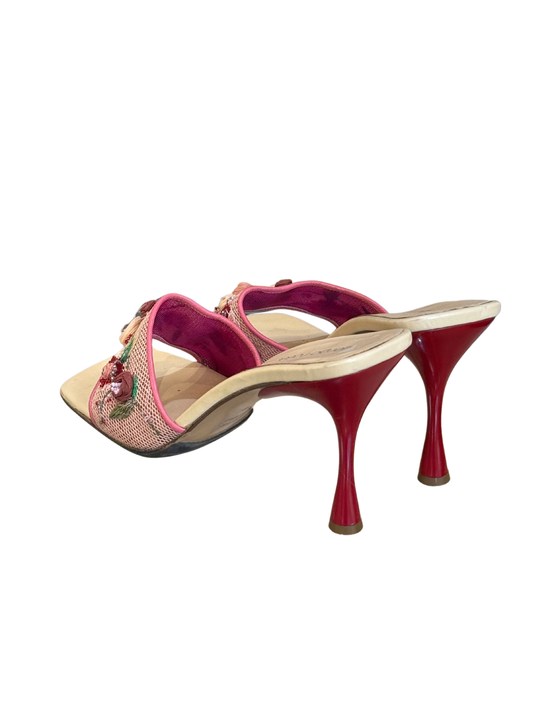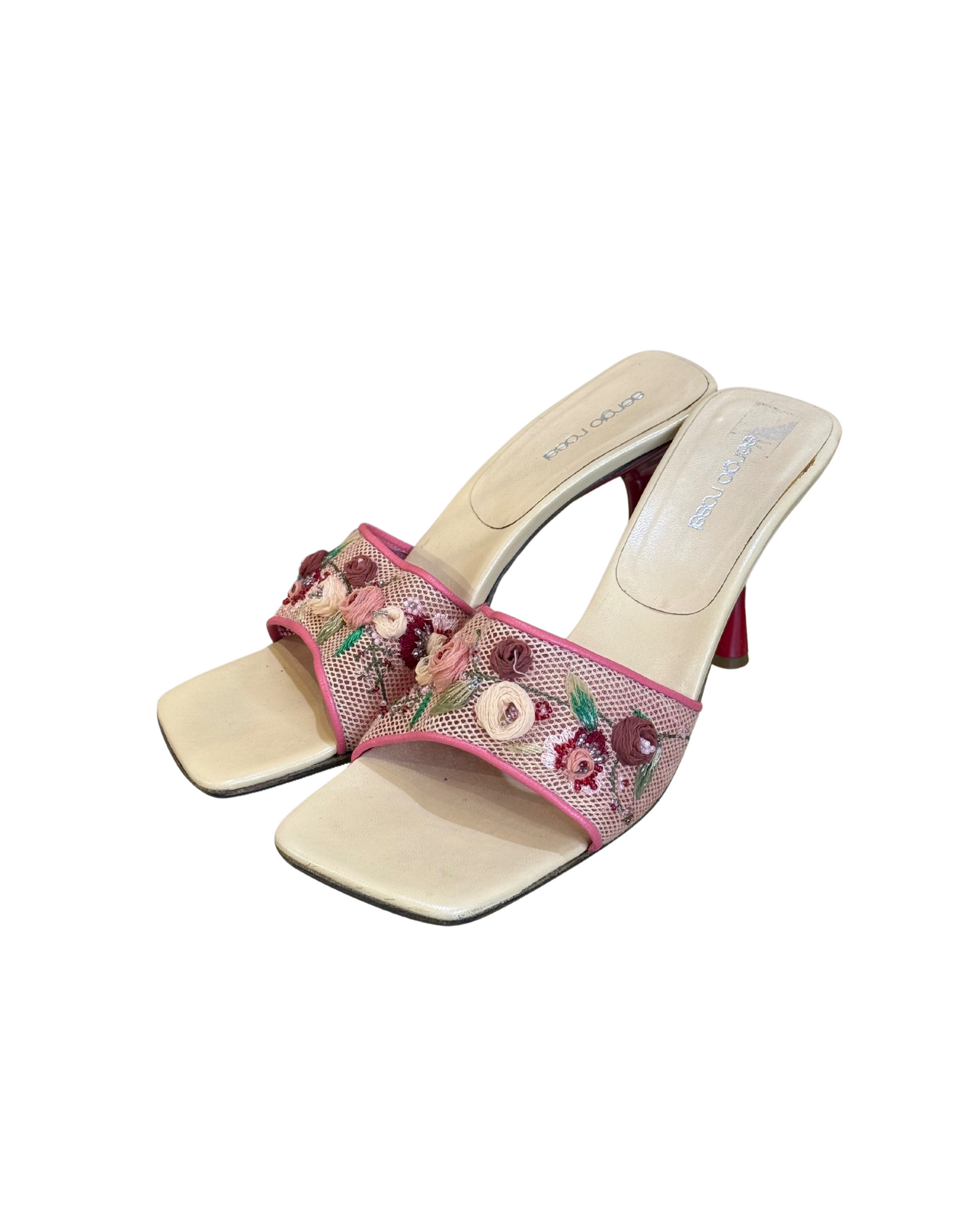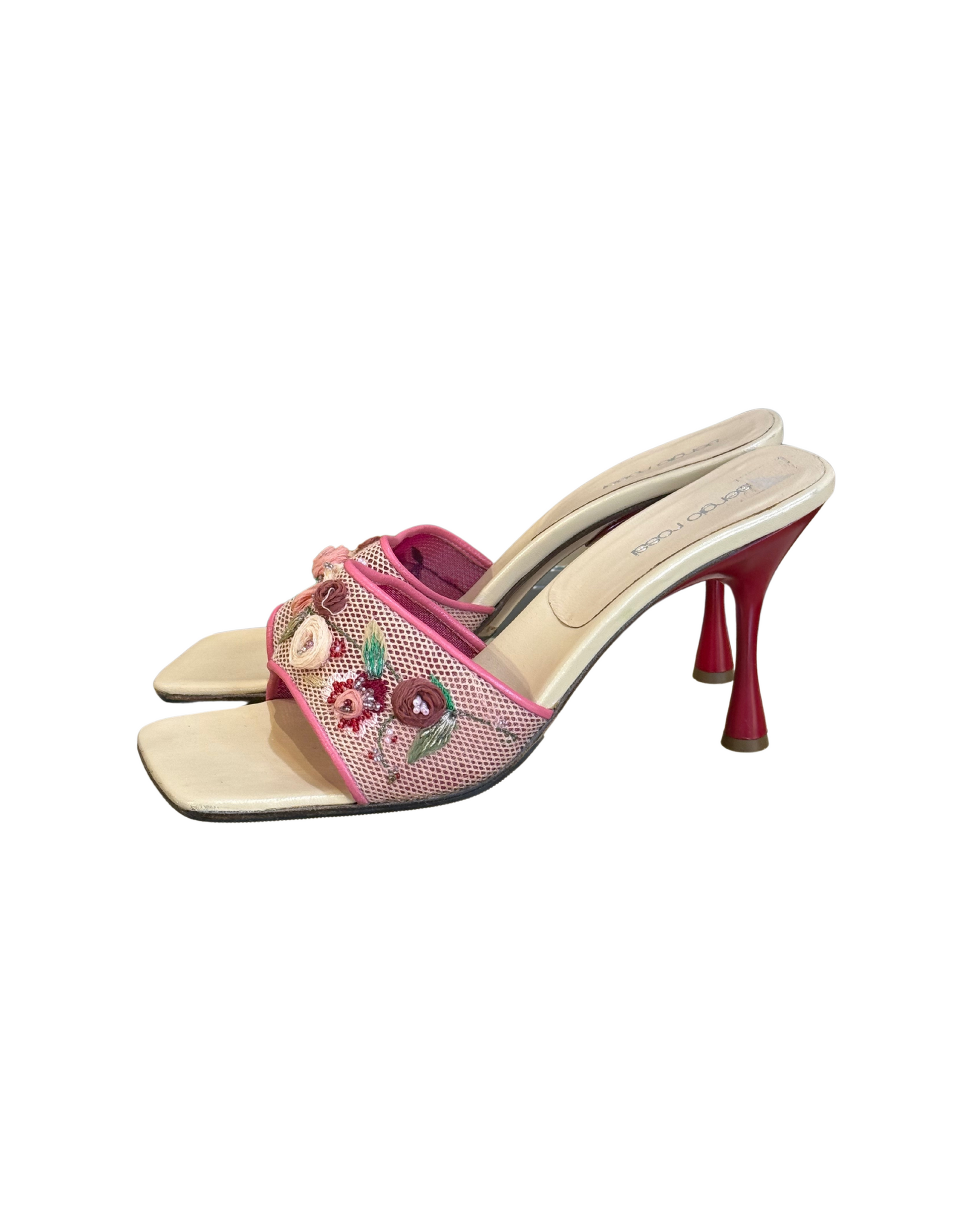 Romantici e originali, questi sandali firmati Sergio Rossi sono un piccolo capolavoro di artigianato made in Italy. La fascia in rete rosa è impreziosita da un delicato ricamo floreale con dettagli tridimensionali e perline, mentre il tacco laccato rosso ciliegia dona un tocco di carattere. Punta squadrata e silhouette raffinata per uno stile femminile e fuori dagli schemi.