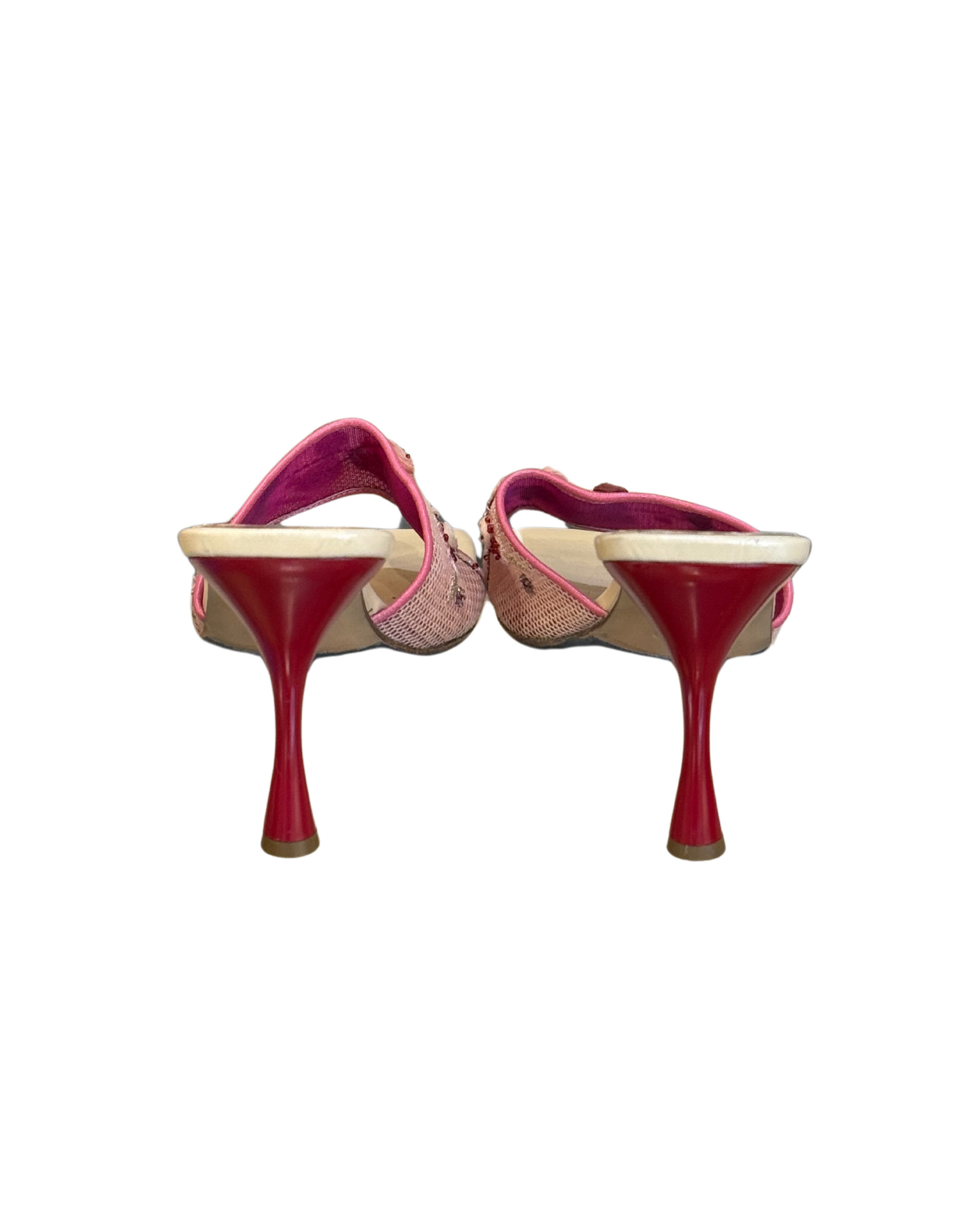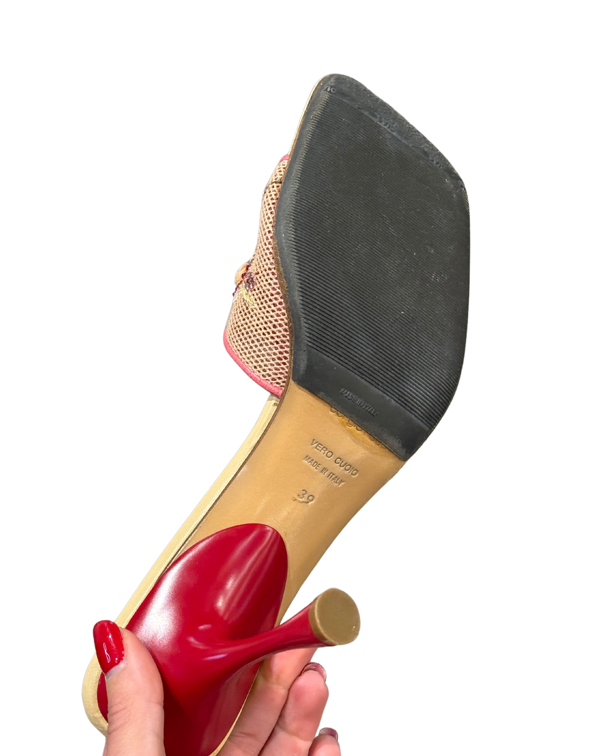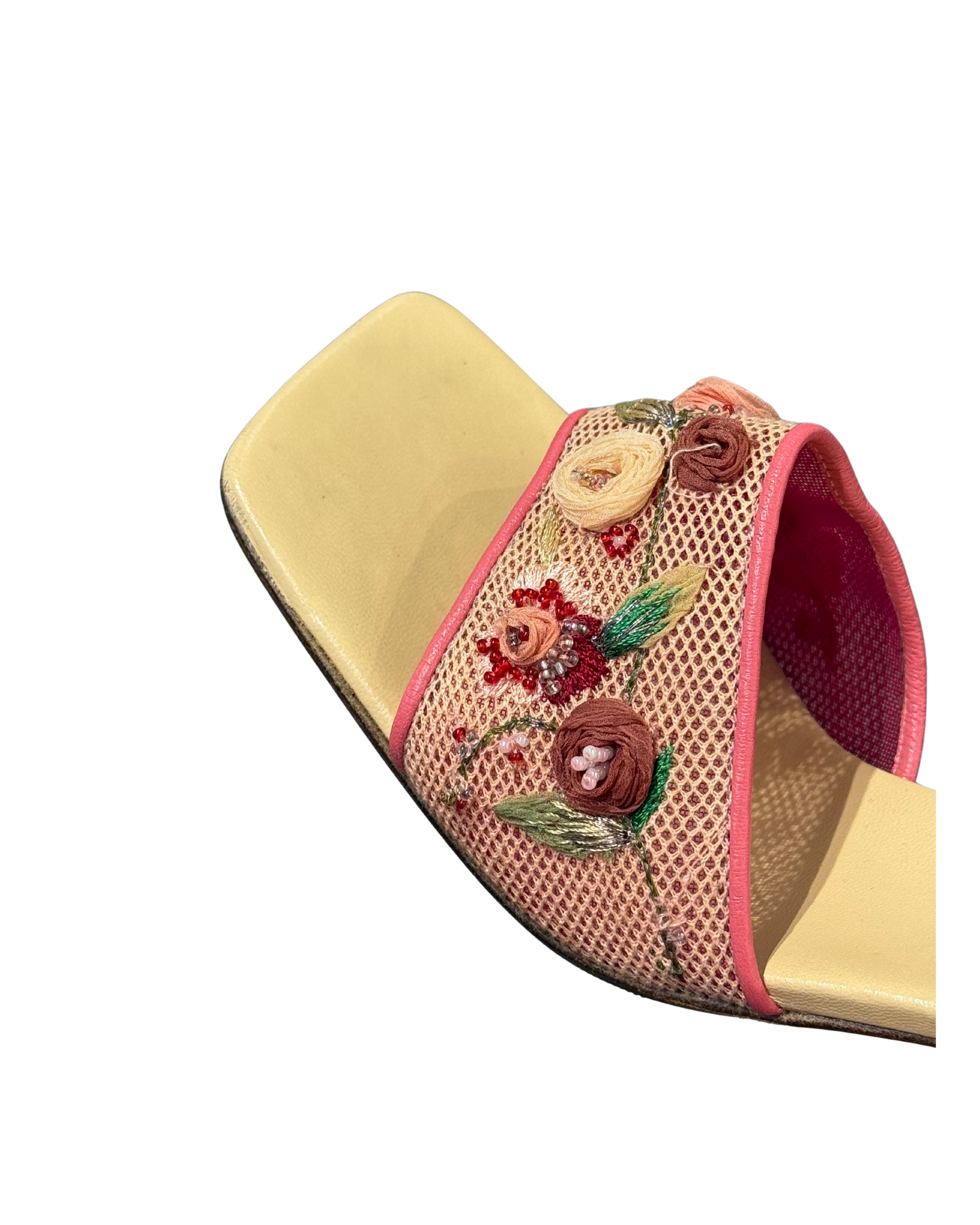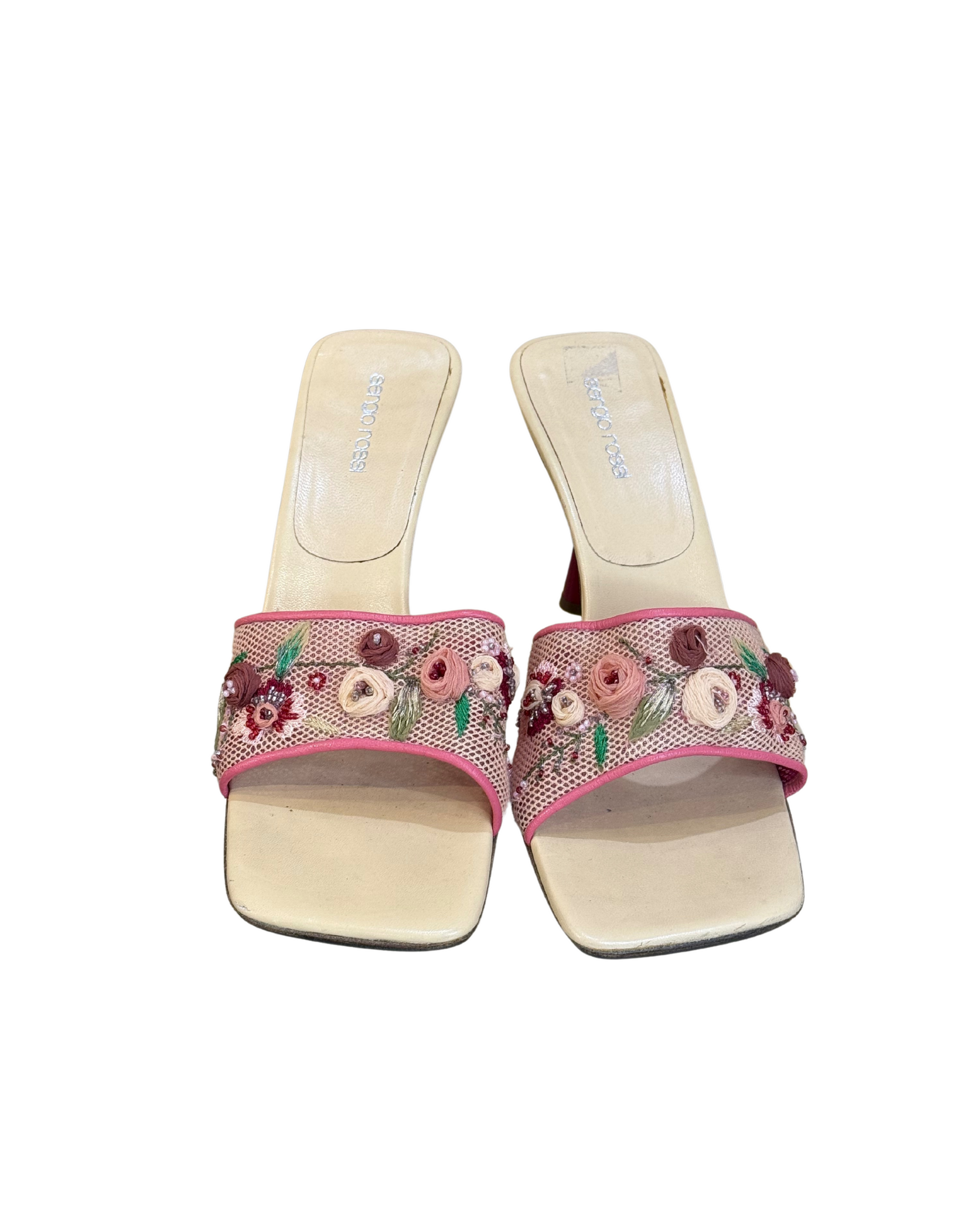 Romantici e originali, questi sandali firmati Sergio Rossi sono un piccolo capolavoro di artigianato made in Italy. La fascia in rete rosa è impreziosita da un delicato ricamo floreale con dettagli tridimensionali e perline, mentre il tacco laccato rosso ciliegia dona un tocco di carattere. Punta squadrata e silhouette raffinata per uno stile femminile e fuori dagli schemi.