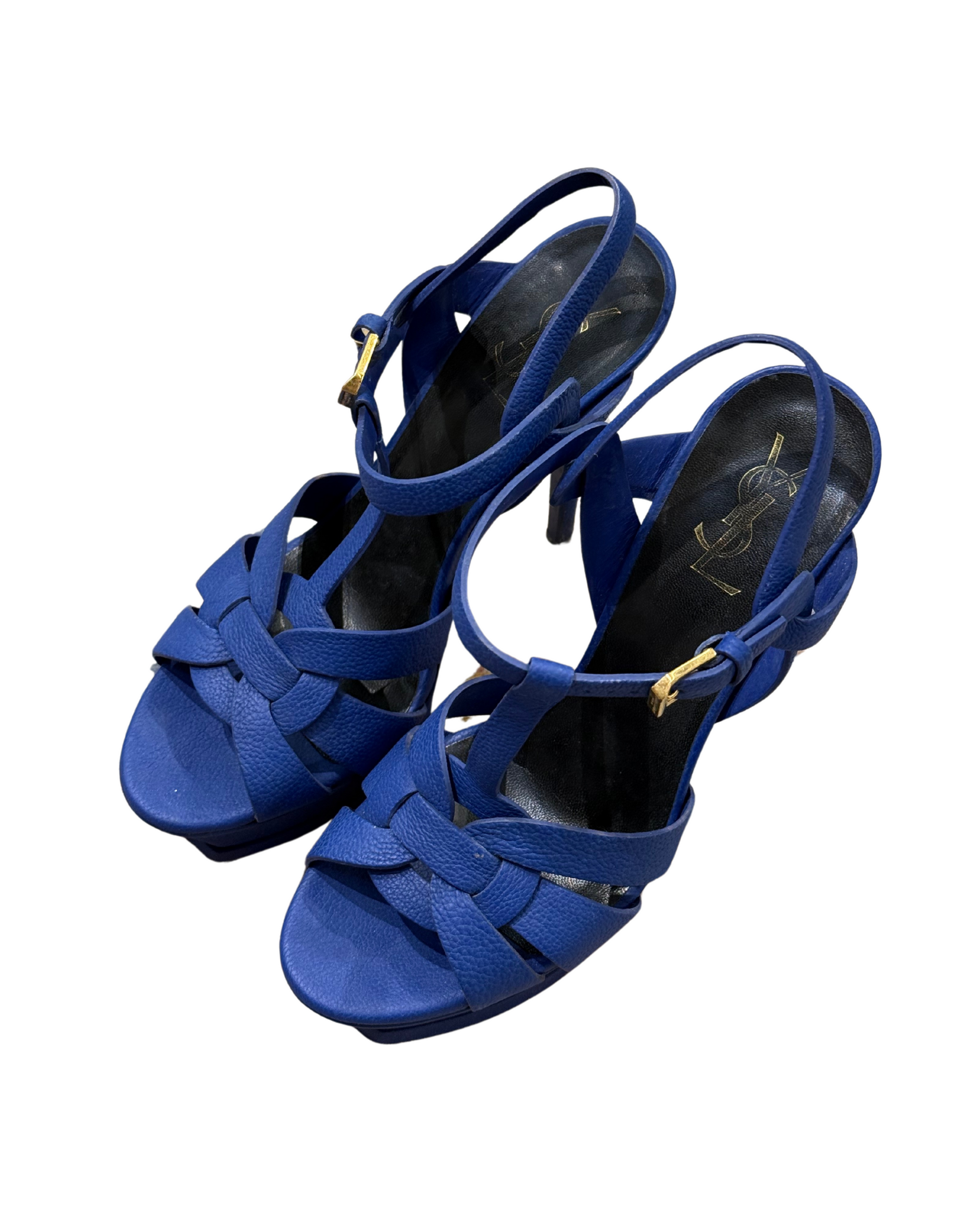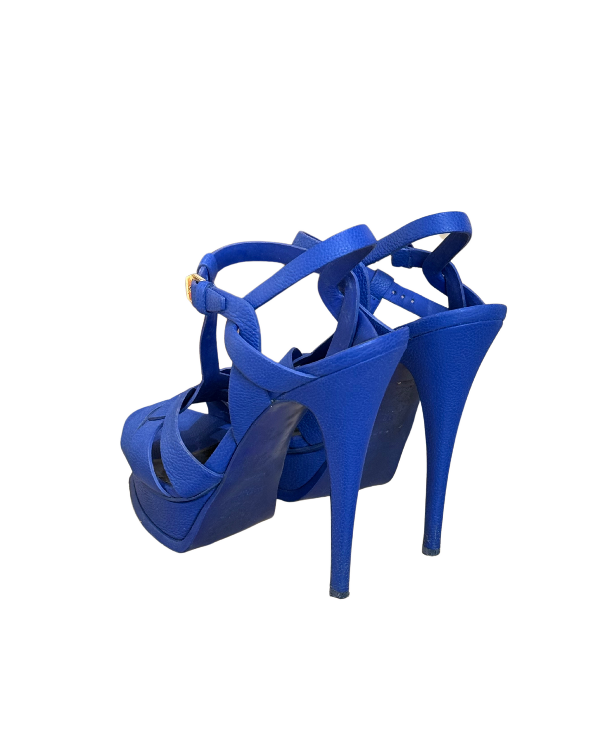Sandali Tribute YSL , uno dei modelli più iconici della maison. Tomaia intrecciata con listini in pelle. Cinturino alla caviglia con fibbia dorata. Tacco a stiletto alto 14cm con plateau 3cm. Realizzate in pelle blu elettrica. Suola nera.